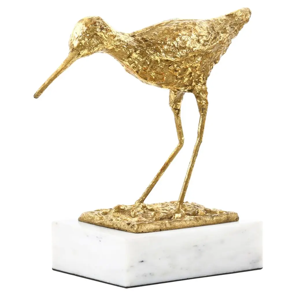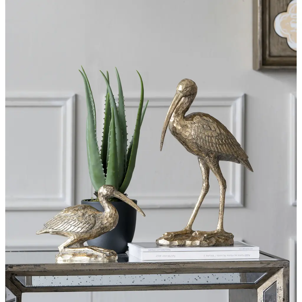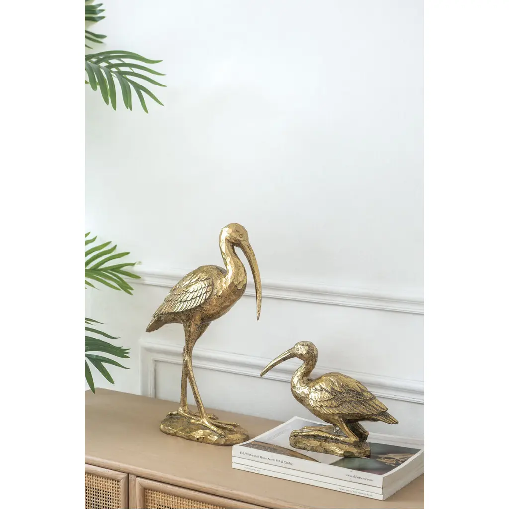 Standing regally, this elegant crane figurine captures the natural beauty of this stately bird with a gleaming, gold finish and crisp shine. This impressive piece adds a sophisticated touch to a grand foyer, chic living room, or lavish master bathroom. Enjoy the stunning beauty of this majestic bird as it perches atop a mantle, bookshelf, or welcomes guests from an entryway table.