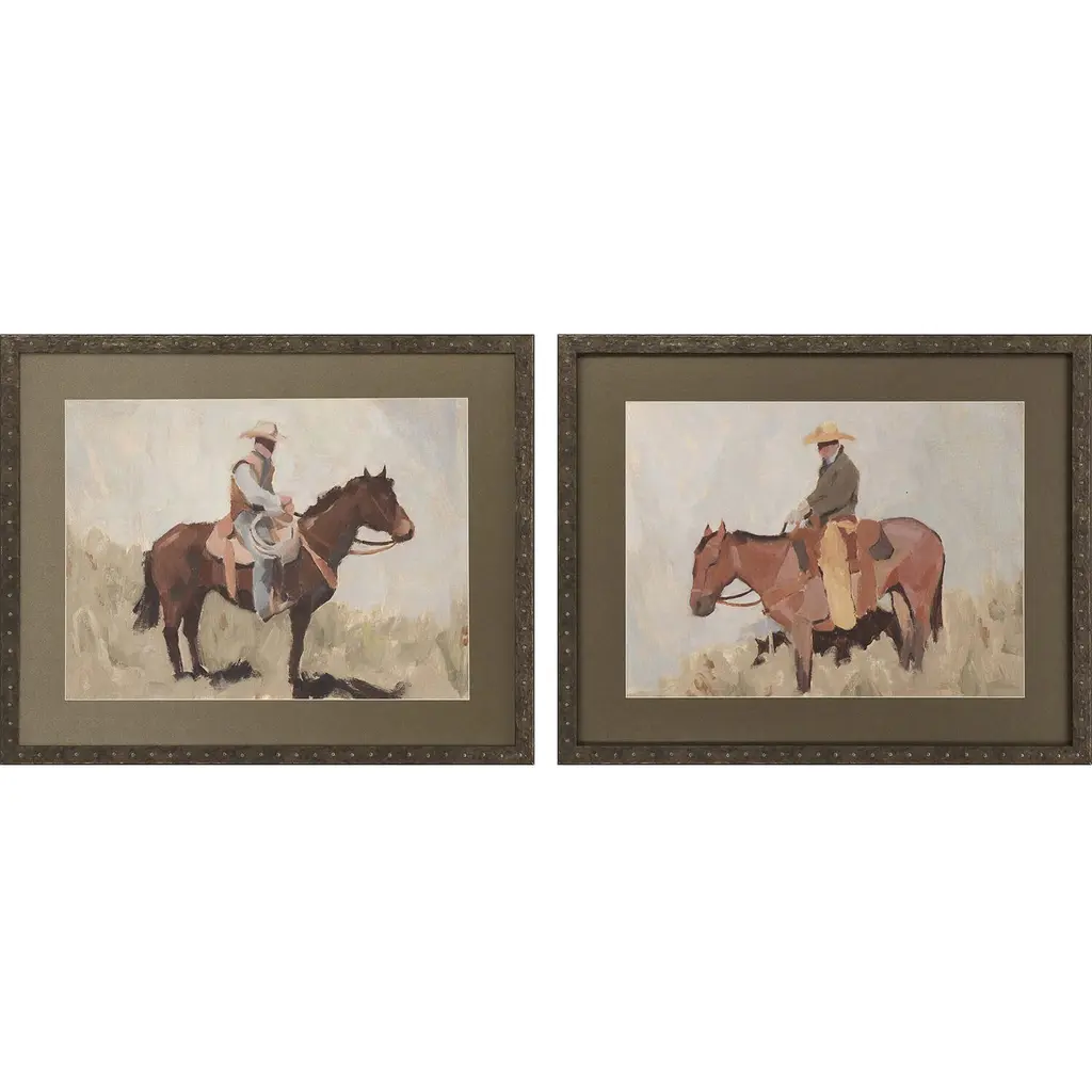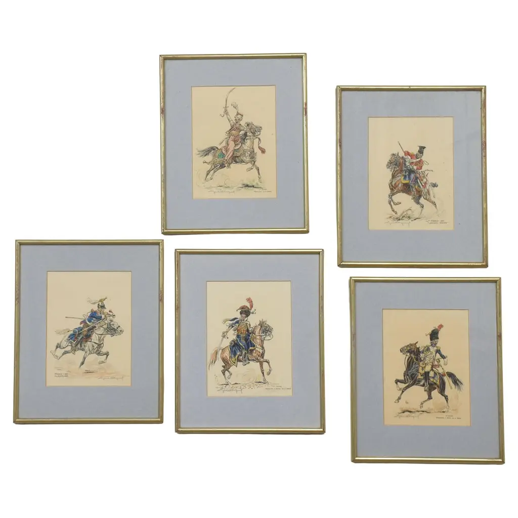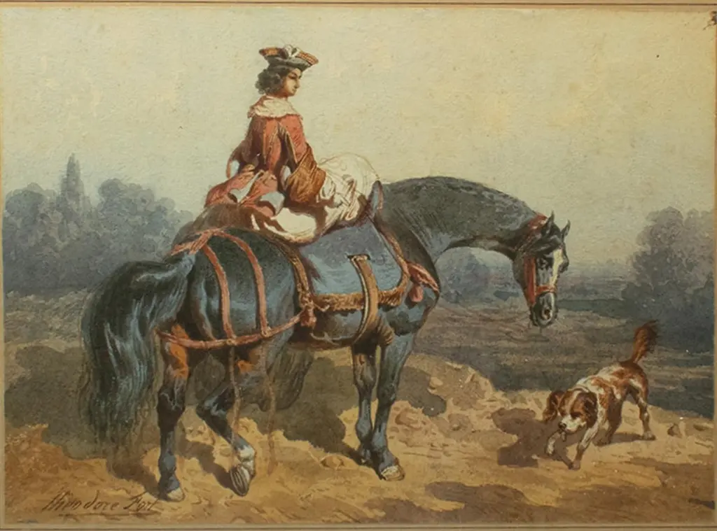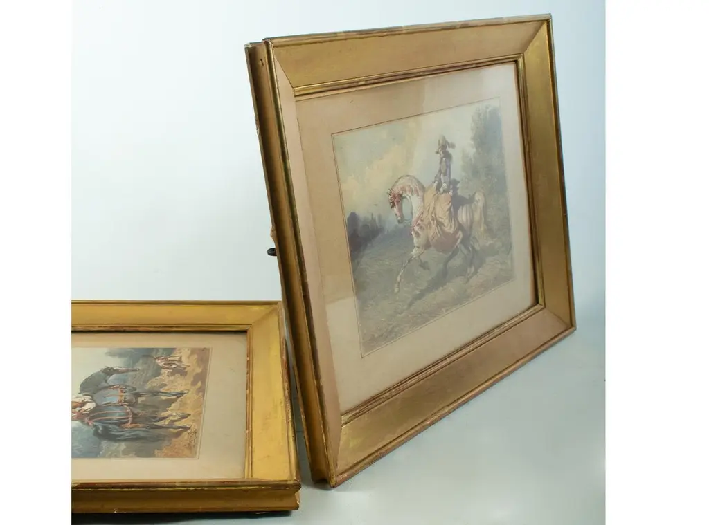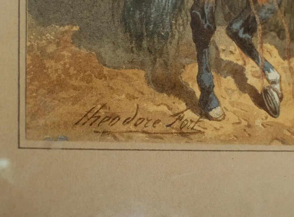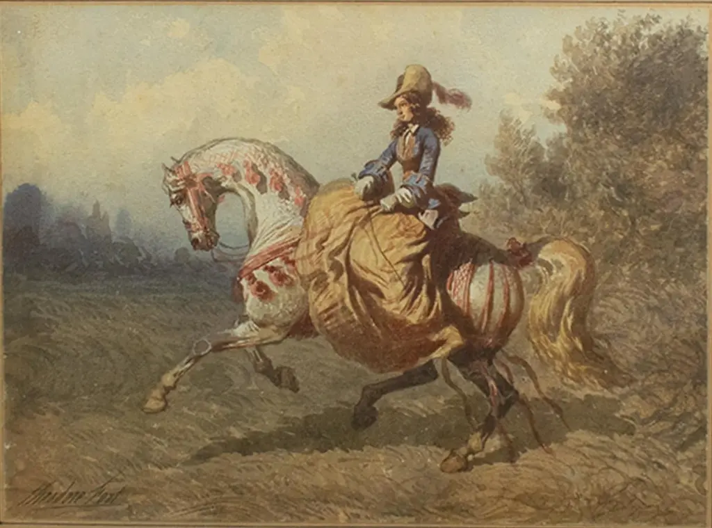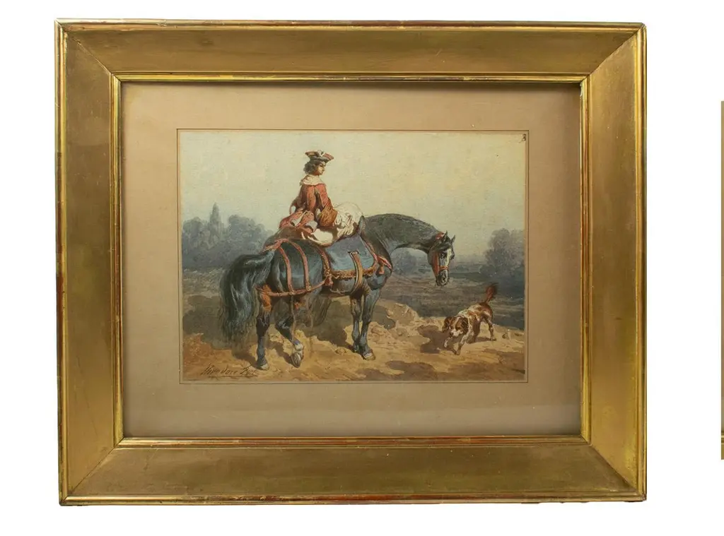 Théodore Fort (French, 1810–1896)Femmes à cheval pendant leur chasse à courre — Pair of Watercolours - Ladies on horseback during a hunt.Each signed lower leftImage size: 18 × 23 cmFramed size: 32.5 × 39.5 cmA charming pair of equestrian hunting scenes by Théodore Fort, depicting elegantly dressed women on horseback during a chasse à courre (French stag or fox hunt). One composition shows a rider on a dark bay horse accompanied by a hunting dog, set in a soft rural landscape. The other captures a dynamic side view of a rider on a spirited, dappled grey mount, executing a lively movement across a field.Executed in delicate watercolour, both works display Fort’s refined draughtsmanship and sensitivity to light, equine anatomy, and 19th-century sporting fashion. The figures and horses are rendered with precision, yet the atmospheric backgrounds retain a painterly softness, evoking the romanticism of the hunt.Signed in the lower left of each sheet and presented in period gilt frames with mounts.About the Artist:Théodore Fort (1810–1896) was a French painter and watercolourist celebrated for his equestrian and military subjects. He exhibited at the Paris Salon from 1842 onwards and gained a reputation for his accurate yet expressive depictions of horses and riders, often in hunting or cavalry contexts. His works appealed to both French and British collectors during the 19th century, with examples held in public and private collections.This pair offers a rare opportunity to acquire two companion pieces by an accomplished 19th-century French sporting artist, perfect for collectors of equestrian art and lovers of the hunt.