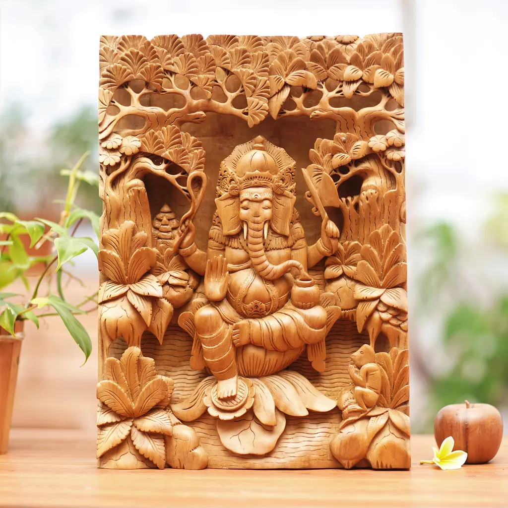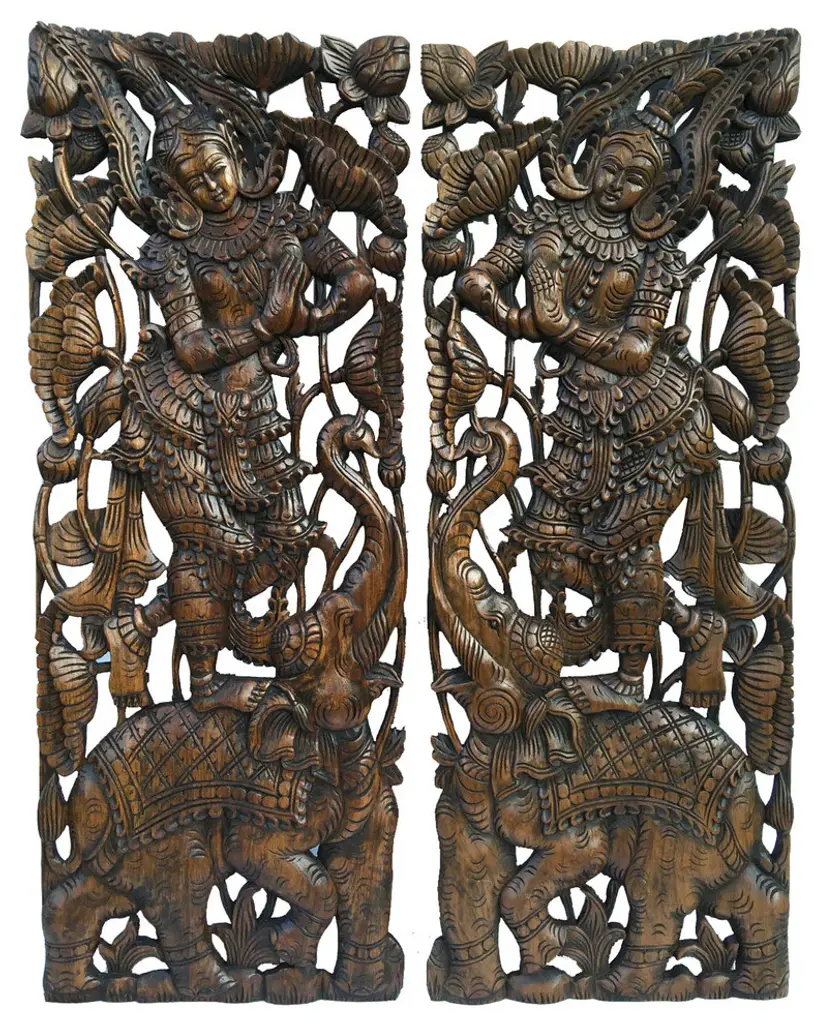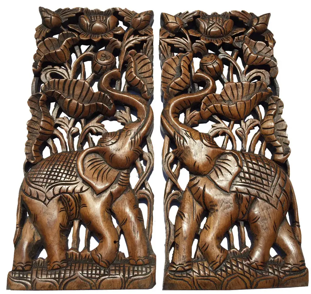Carved wood wall art SawaddeeThai traditional on elephants are a favorite. They are sold as a pair and provide you with twice the appreciation of carved wood craftsmanship. A really unique exhibition of creative wall art!Size • Weight • Color • MaterialsL (Each)Height: 35.5" InchesWidth: 13.5" InchesThickness: 1" InchesWeight: 7.3 lbs.Color: Dark BrownMaterial: Teak WoodPlease note that you may see a slight difference in color as compared to that seen on your computer screen. Also, since most products are handmade and they are crafted from natural wood, there may be a slight size variation.