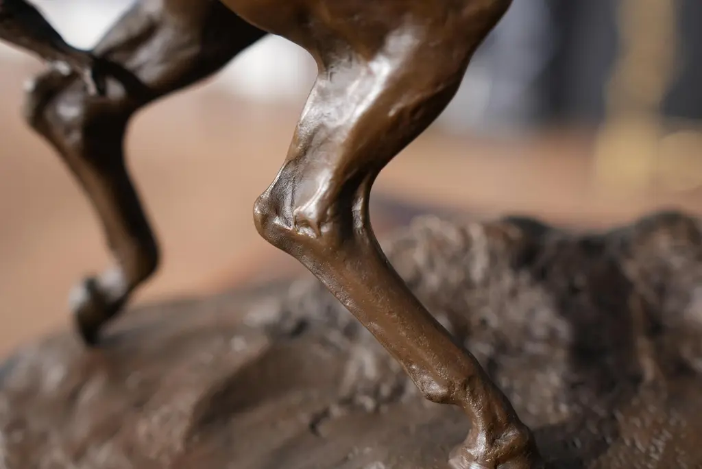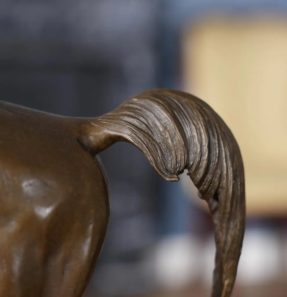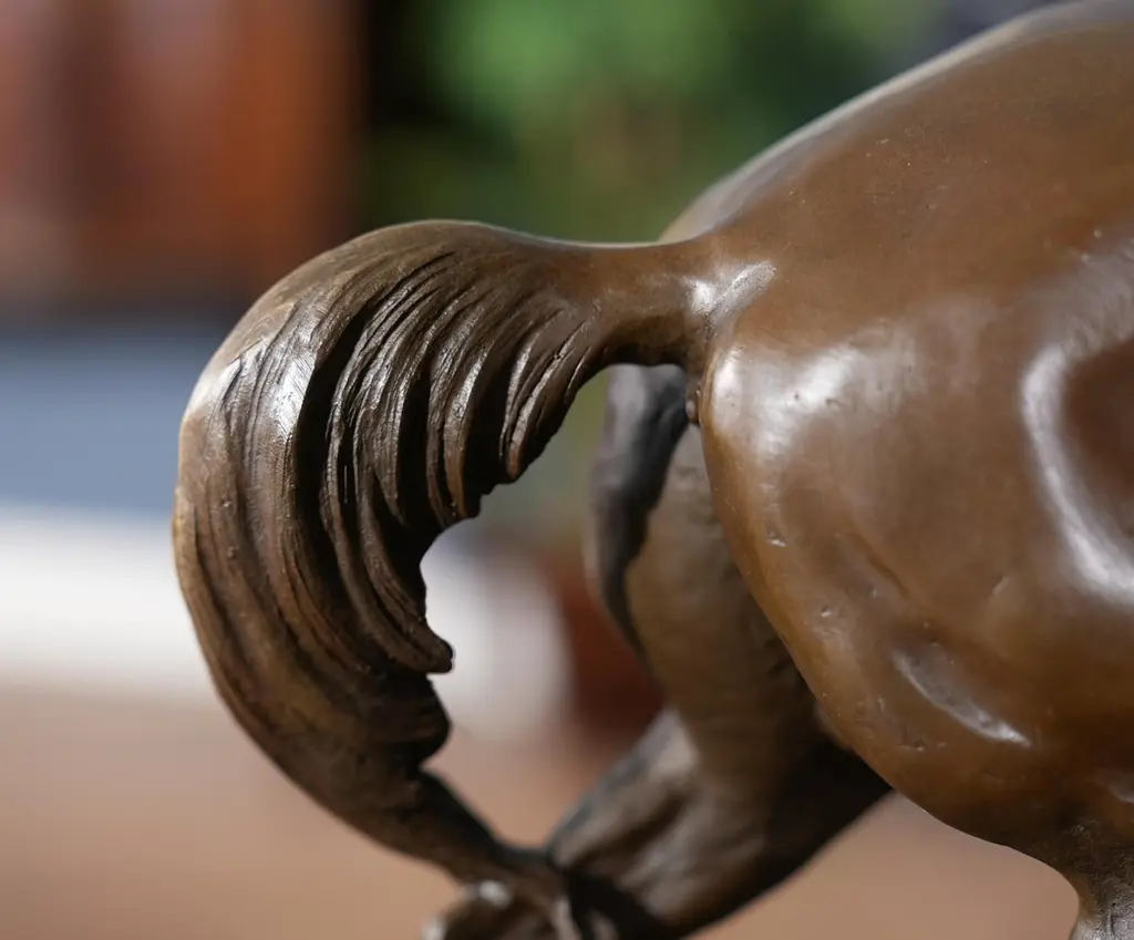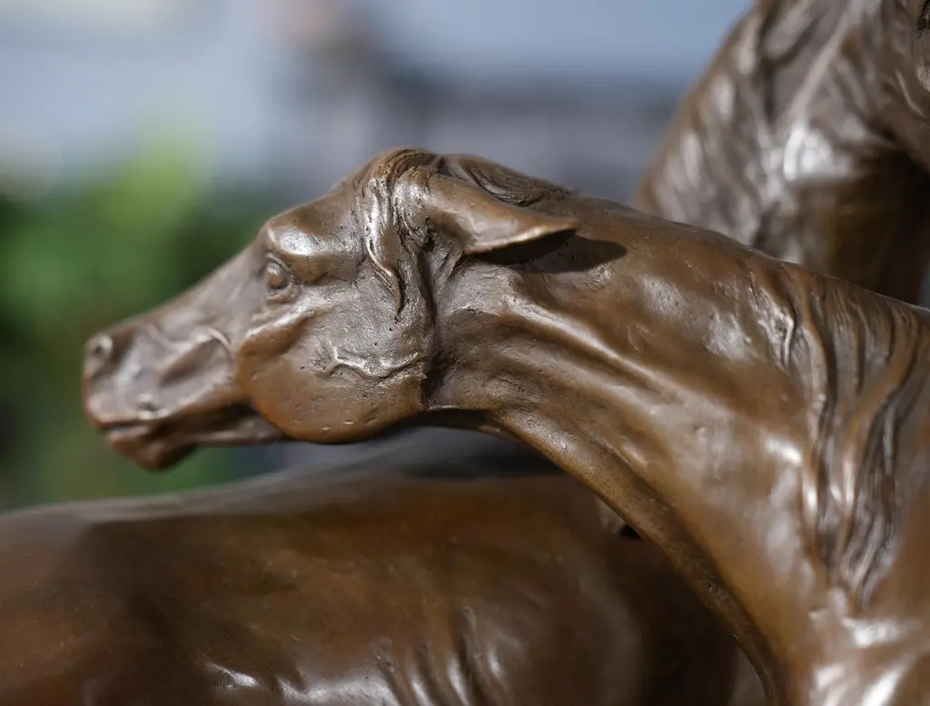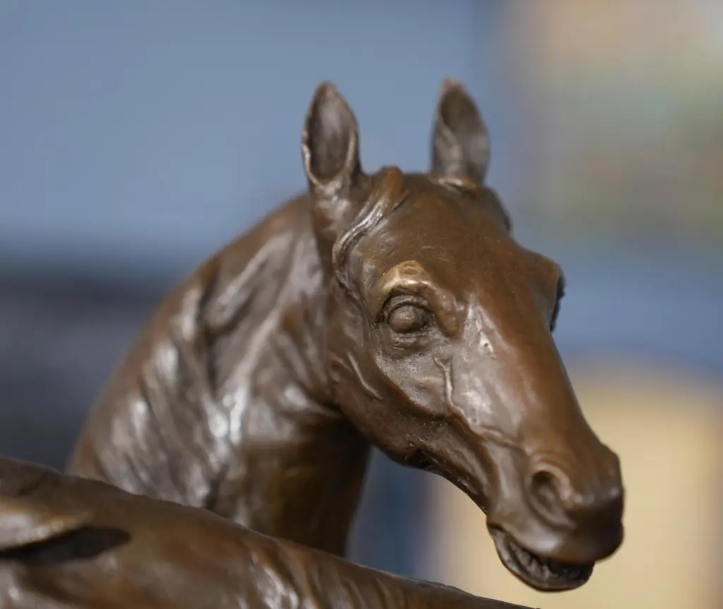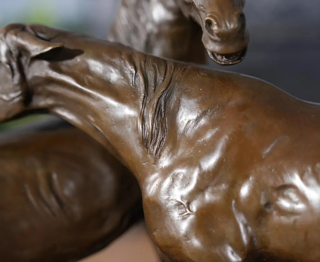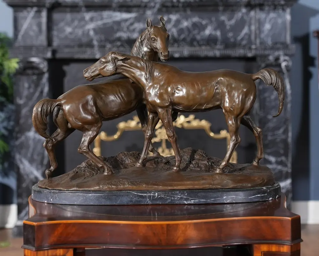 Graceful even when standing still the Two Horses on Marble Base is a striking addition to any setting. Using traditional lost wax casting methods the Two Horses statue is created in pieces and then joined together with brazing and hand chaised details are added to give a high level of detail to the figure. The Two Horses are then mounted on a solid marble base to lend it stability as well as an enduring appearance. The Two Horses on Marble Base are finished in a multi stage, time consuming process requiring skilled and experienced artisans. The rich and varied shades of finish lend themselves to almost any decor, they appear especially striking when displayed in a well lit area.Item Measures Approximately 29 W x 11 D x 18 H