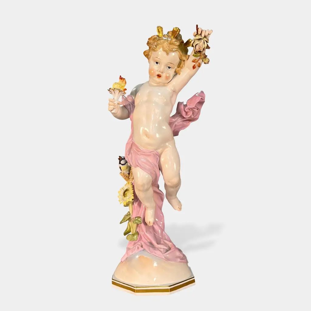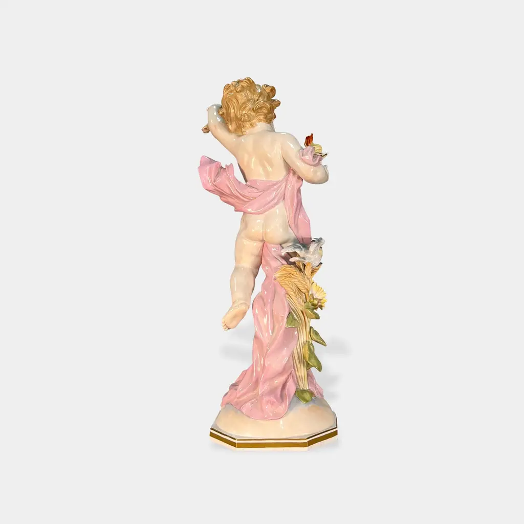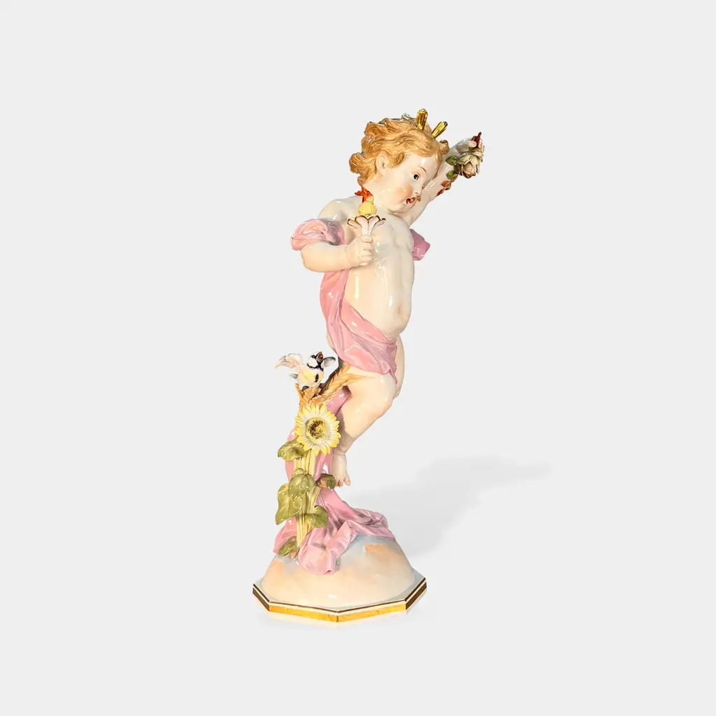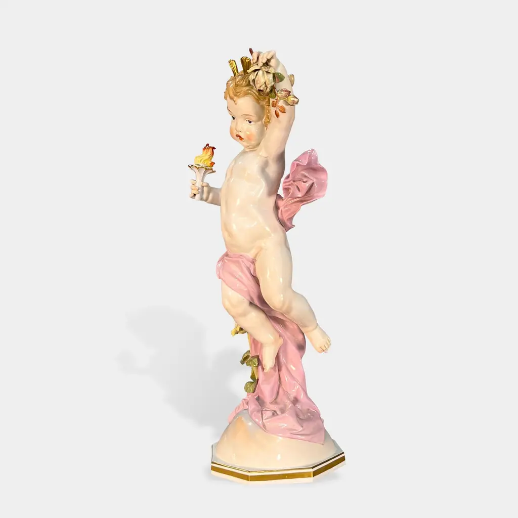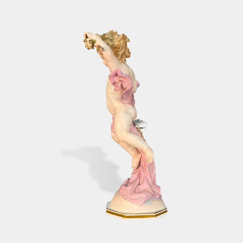 A magnificent pair of very large Meissen putti representing Day & Night by Heinrich Schwabe. Each figure wrapped in a cloth, float above the earth's atmosphere.Day in a bright pink cloth, the left arm holding a rose blossom, stretching upwards full of morning energy, carrying a torch in the right hand, symbol of warmth and light. Sunbeams adorn his head, a sunflower, ears of corn and a singing bird on his right are further attributes for the day that brings life to bloom.Night is dressed in a blue cloth that covers the head and is crowned by a star crown. The putto looks thoughtfully down, holding the poppy seed in his right hand, which is supposed to bring deep sleep. He is accompanied by an owl as an attribute of the god of darkness and night.Heinrich Schwabe (1847-1924) studied at the arts and crafts school in Nuremberg (Germany) and was a professor in Nuremberg from 1875 to 1907. The artist was known for his famous cupid series (L models), which he designed for the Meissen manufactory, and also created models for busts,children and genre figures.