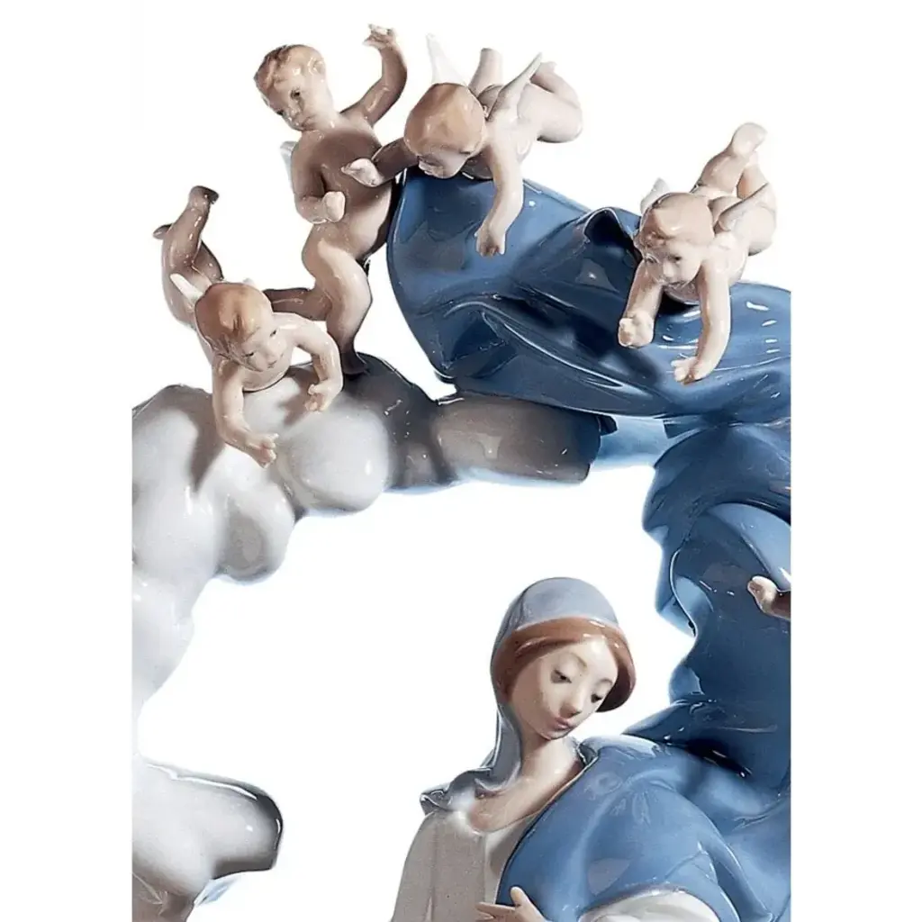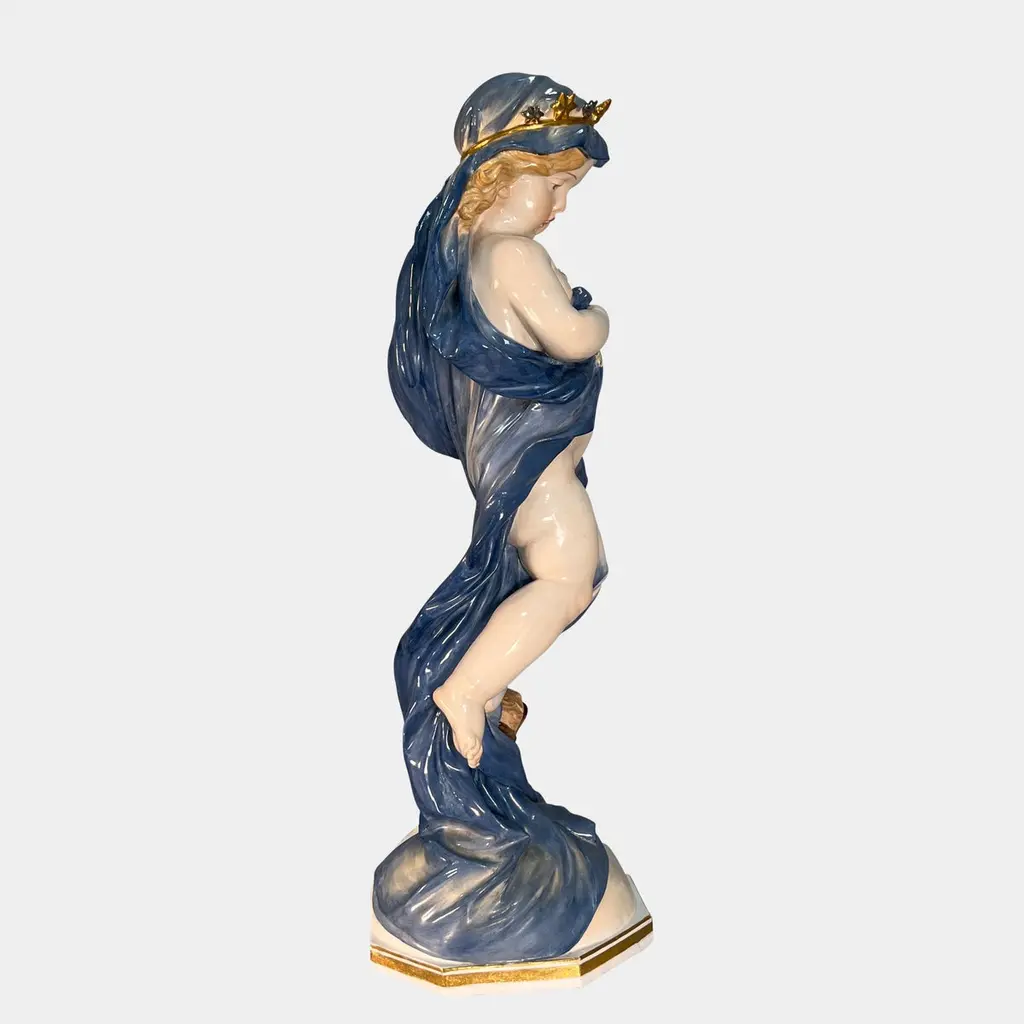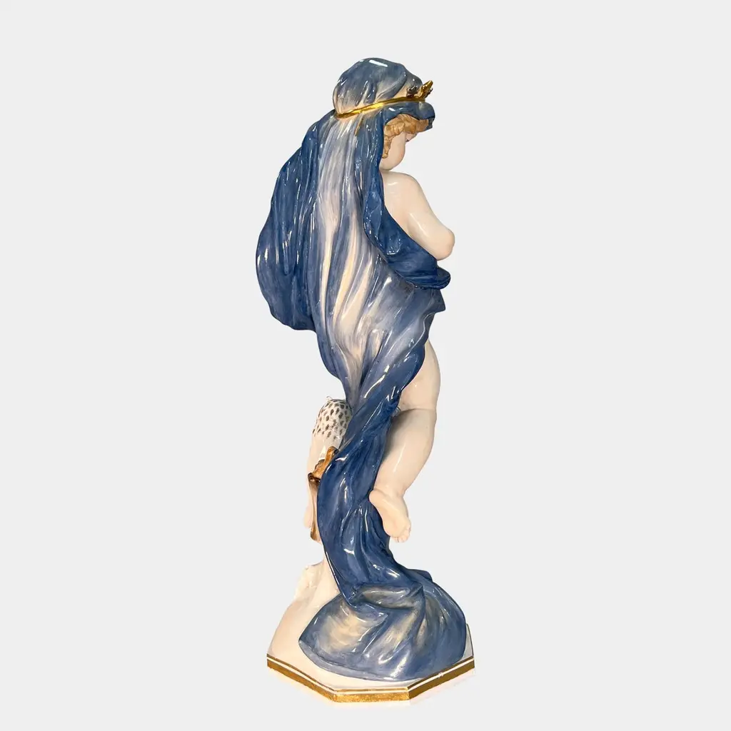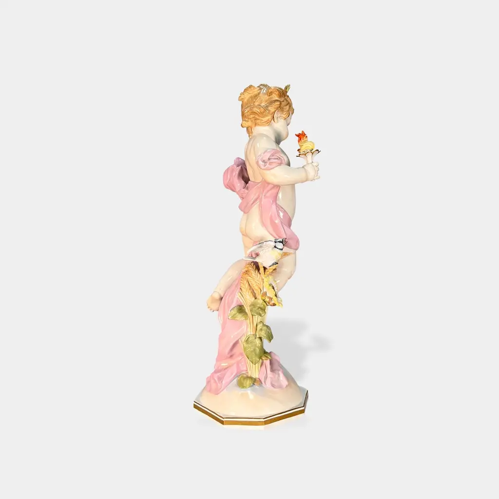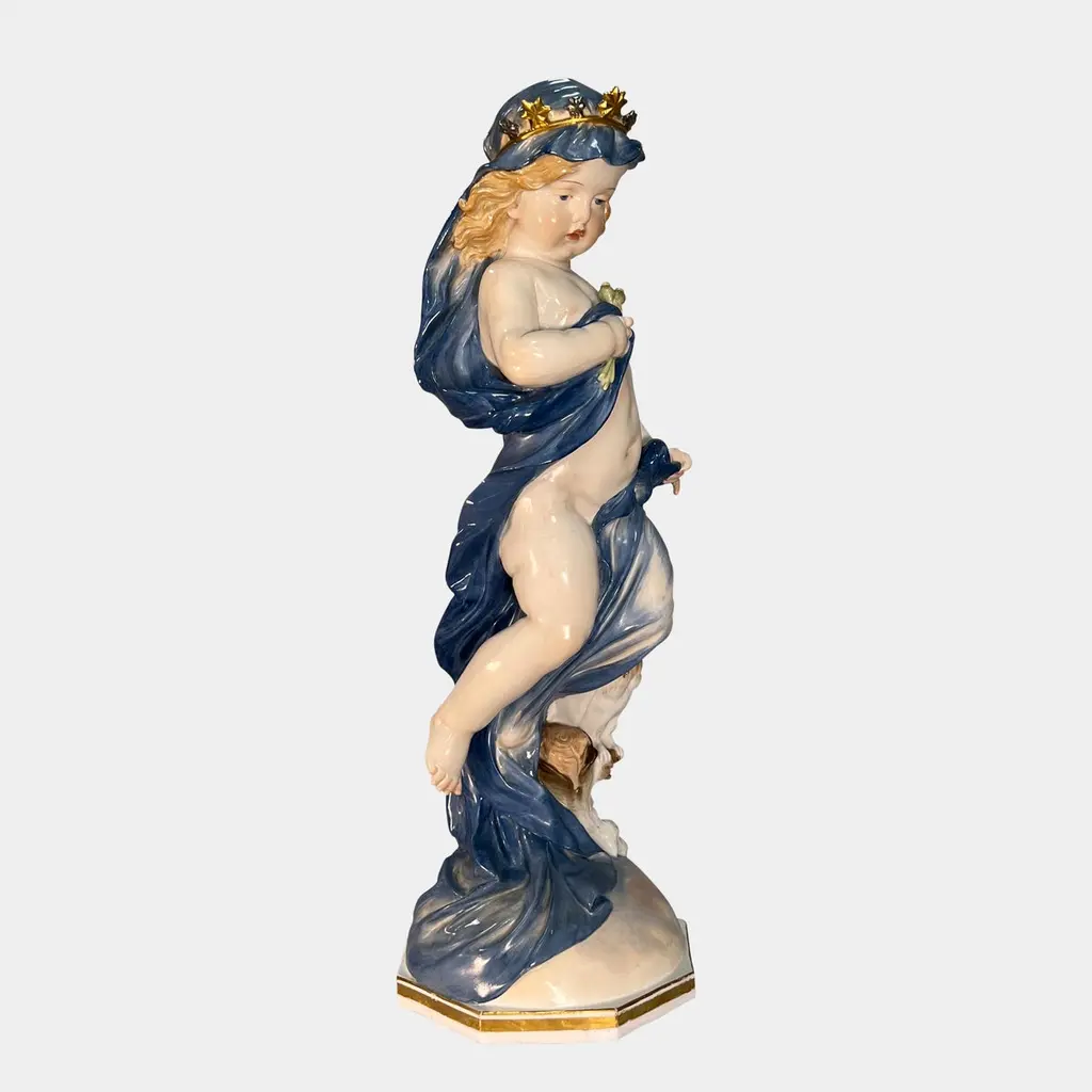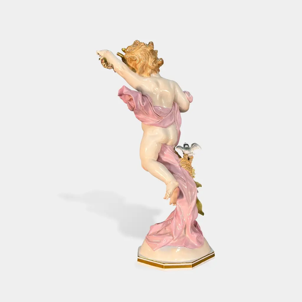 A magnificent pair of very large Meissen putti representing Day & Night by Heinrich Schwabe. Each figure wrapped in a cloth, float above the earth's atmosphere.Day in a bright pink cloth, the left arm holding a rose blossom, stretching upwards full of morning energy, carrying a torch in the right hand, symbol of warmth and light. Sunbeams adorn his head, a sunflower, ears of corn and a singing bird on his right are further attributes for the day that brings life to bloom.Night is dressed in a blue cloth that covers the head and is crowned by a star crown. The putto looks thoughtfully down, holding the poppy seed in his right hand, which is supposed to bring deep sleep. He is accompanied by an owl as an attribute of the god of darkness and night.Heinrich Schwabe (1847-1924) studied at the arts and crafts school in Nuremberg (Germany) and was a professor in Nuremberg from 1875 to 1907. The artist was known for his famous cupid series (L models), which he designed for the Meissen manufactory, and also created models for busts,children and genre figures.