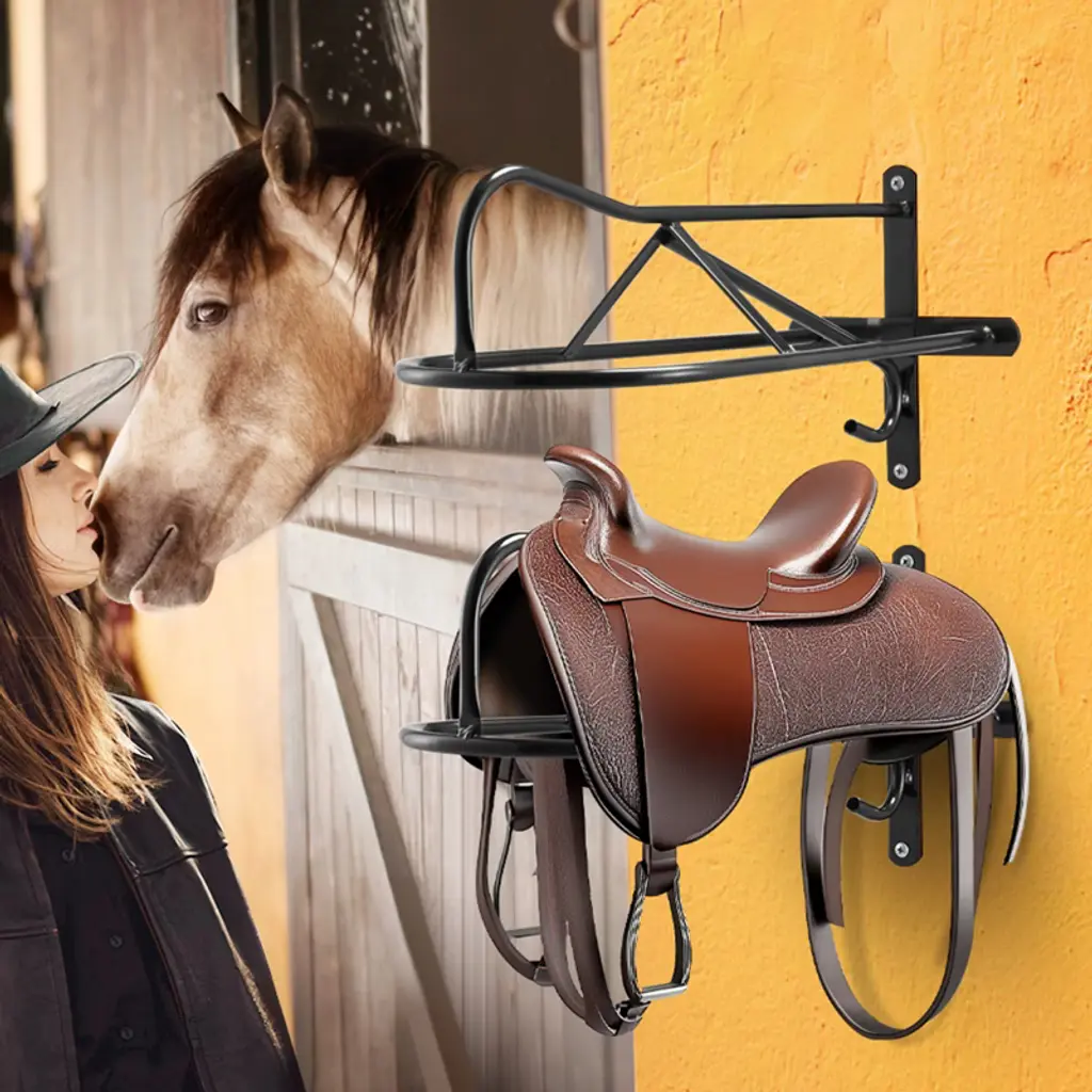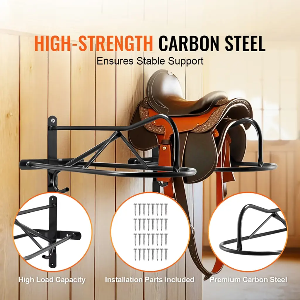Feature: Premium Materials: This saddle rack is crafted from high-strength carbon steel with full welding and a rust-resistant coating, ensuring it’s tough enough for the long haul! Space Saver: Our saddle rack for English saddle with wall-mounted design frees up floor space, optimizing your area for all your equestrian needs! Easy Installation: This saddle stand comes with all the installation goodies you need, simplifying the process—just four steps, and you’re good to go! Smart Storage Design: Featuring a straightforward single-bar design, this saddle rack stand makes it a breeze to grab and stow your saddles, enhancing your tack management comfort! Versatile Functionality: More than just a saddle rack! It’s ideal for storing tack, clothes, and more. Its flexible design fits right in anywhere—be it the garage, stable, or changing room—making storage a cinch! Package Content 1 x Instruction Manual 12 x Self-Tapping Screws M6 x 35mm