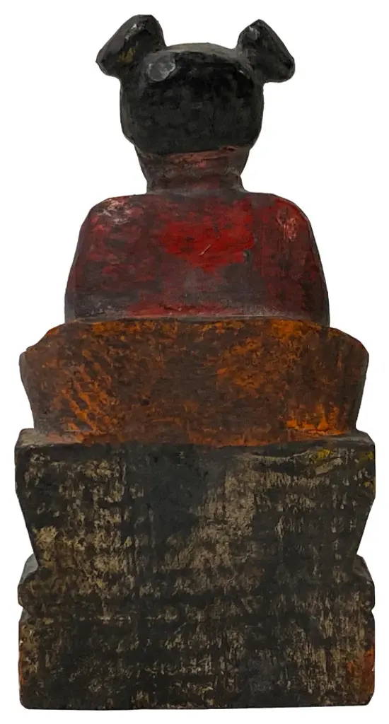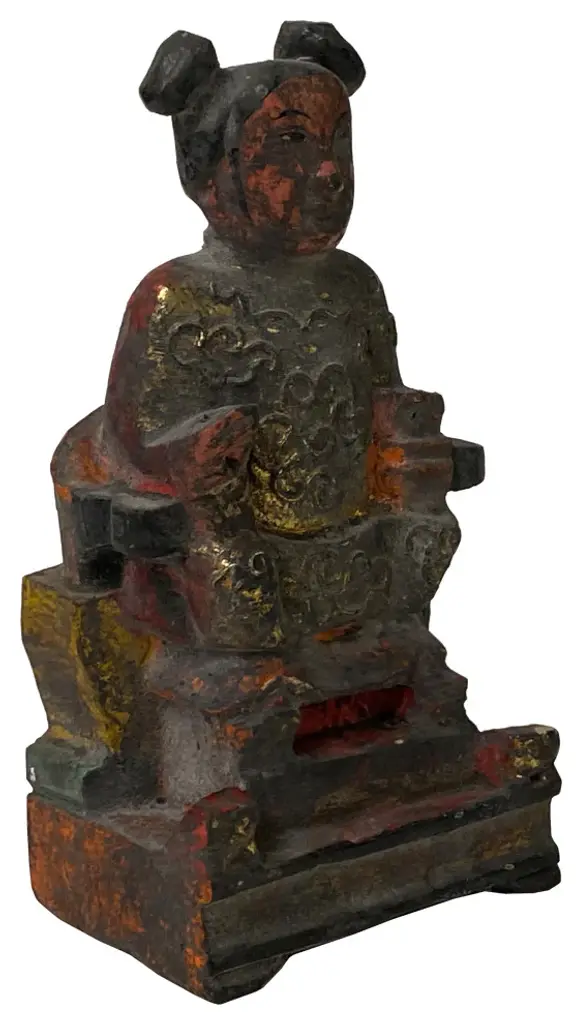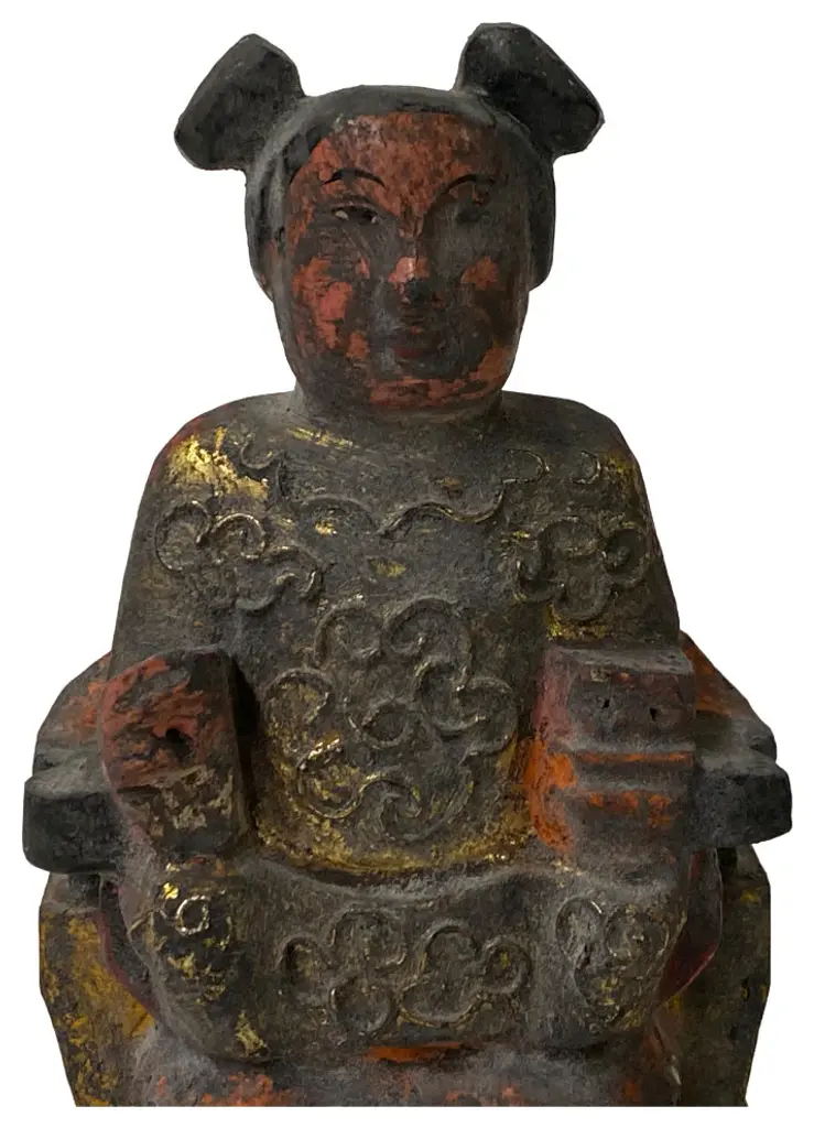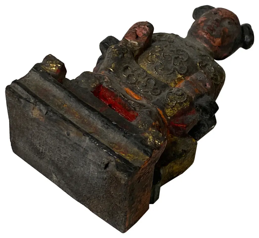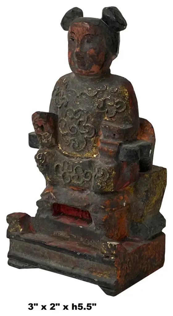 This is a wooden display figure which was displayed in the Chinese family as a guardian or worship piece. It has detail precise motifs on the body. You can display it with chips and dust, but it can be clean and touch up too.Dimensions: w3" x d2" x h5.5" Origin: China Material: Wood Condition: Handmade, chip on body. as it
