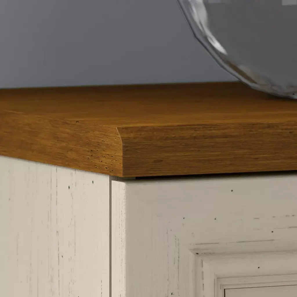 Make sure all your important documents stay organized with this Fairview Lateral File Cabinet from Bush Furniture. This gorgeous filing cabinet comes in antique white for a refined look, and the contrasting cherry-brown top adds extra visual interest. This two-drawer cabinet provides ample storage space for all your important paperwork, and the installed file rungs are compatible with standard hanging file folders.