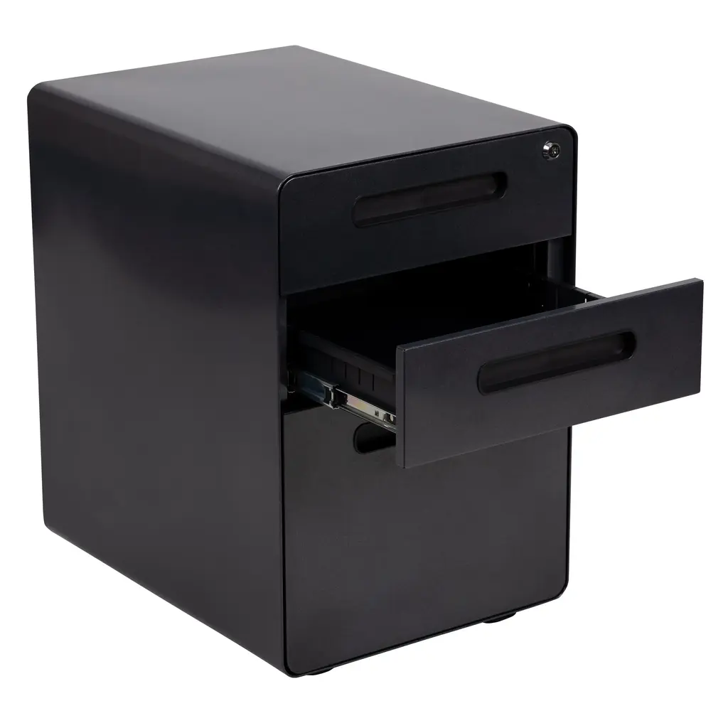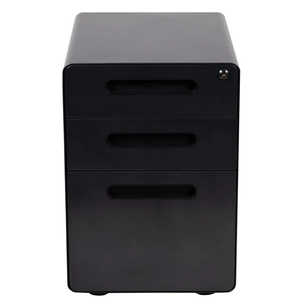 You may love your current desk but have nowhere to store your paperwork without cluttering the desktop, insert this locking file cabinet to keep the minimalistic appearance of your modern office desk. This 3-drawer pedestal file cabinet has low set casters to keep up with the needs of a busy worker. The convenience of casters is ideal for employees who regularly file documents, allowing them the option to pull the cabinet near them while monitoring incoming emails. The modern 3-drawer mobile file cabinet has two utility drawers to hold your small office supplies, snacks, vitamins and writing utensils while the hanging file drawer holds A4, letter, legal, and F4 hanging folders. Folder longer documents such as your legal size paperwork vertically using the conversion bar. An included pencil tray keeps your small supplies neatly stored and can be used in either of the two utility drawers. Two keys are included to keep in separate locations or as a duplicate for your assistant. Inset drawer handles provide a modern appearance and a worry-free solution to loosening handle screws. Organize your office space with this mobile under desk filing cabinet that comes fully assembled and ready-to-use. This ergonomic filing cabinet is a smart solution for any workplace whether used for heavy-duty daily filing or the casual user.