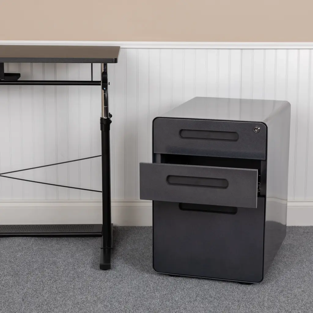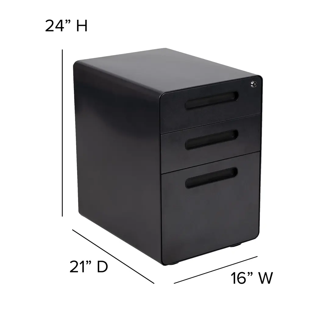 You may love your current desk but have nowhere to store your paperwork without cluttering the desktop, insert this locking file cabinet to keep the minimalistic appearance of your modern office desk. This 3-drawer pedestal file cabinet has low set casters to keep up with the needs of a busy worker. The convenience of casters is ideal for employees who regularly file documents, allowing them the option to pull the cabinet near them while monitoring incoming emails. The modern 3-drawer mobile file cabinet has two utility drawers to hold your small office supplies, snacks, vitamins and writing utensils while the hanging file drawer holds A4, letter, legal, and F4 hanging folders. Folder longer documents such as your legal size paperwork vertically using the conversion bar. An included pencil tray keeps your small supplies neatly stored and can be used in either of the two utility drawers. Two keys are included to keep in separate locations or as a duplicate for your assistant. Inset drawer handles provide a modern appearance and a worry-free solution to loosening handle screws. Organize your office space with this mobile under desk filing cabinet that comes fully assembled and ready-to-use. This ergonomic filing cabinet is a smart solution for any workplace whether used for heavy-duty daily filing or the casual user.