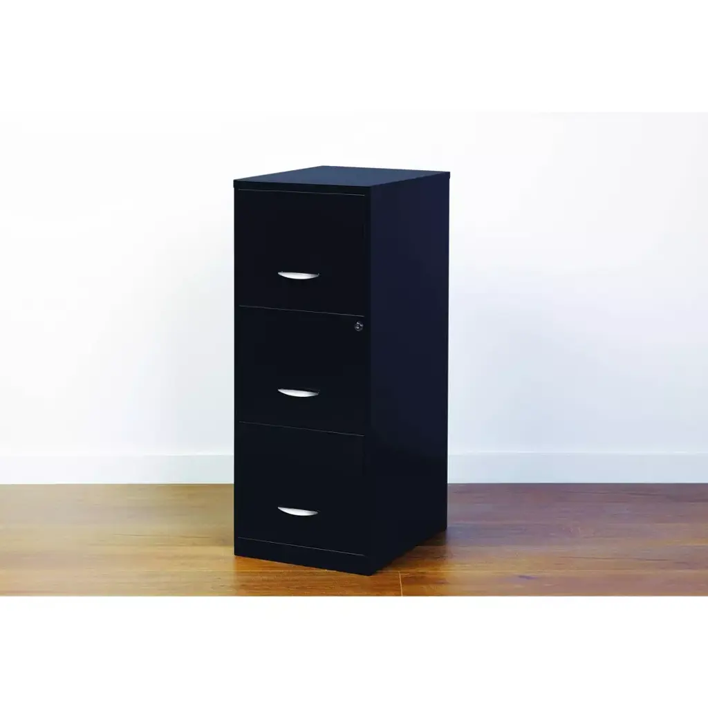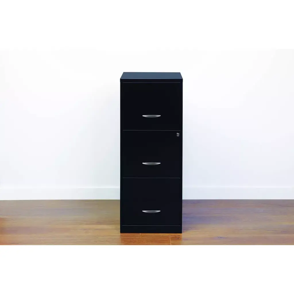 The Three Drawer Metal Vertical File Cabinet is designed for smaller professional offices or home office use. The cabinet features durable steel construction and a smart, efficient design that works well in small spaces. Each drawer features high-sides to accommodate letter-sized hanging files. The drawers are also a perfect storage solution for other office essentials. Using a patented glide suspension, the drawer slides open and close smoothly with a three-quarter drawer extension to prevent tipping. In addition, you can keep your files and possessions secure by using the built-in lock for the top two drawers. The painted steel surface is non-porous and easy to clean. Bring storage and organization to your home or office with this stylish three-drawer file cabinet. Your office supplies and files will always be organized and within reach.