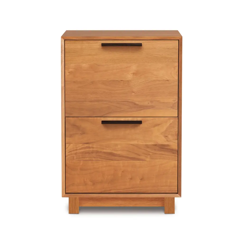 Natural wood blended with crisp contemporary lines create an aesthetic ideal for any modern-day office. Our Linear Narrow File Cabinet by Copeland Furniture is constructed using sustainably sourced North American hardwoods. This wood is harvested from carefully managed North American forests. A compact form with an upper utility drawer and lower file drawer offers a wide range of storage possibilities, including room for your legal and personal size documents.Base price represents file cabinet in natural cherry with dark chocolate stained pullsShown in natural cherry with dark chocolate stained pullsMatching furniture available in our Linear Furniture CollectionNote: This file cabinet holds standard letter size documents in a front to back configuration with one row for filing per drawer.