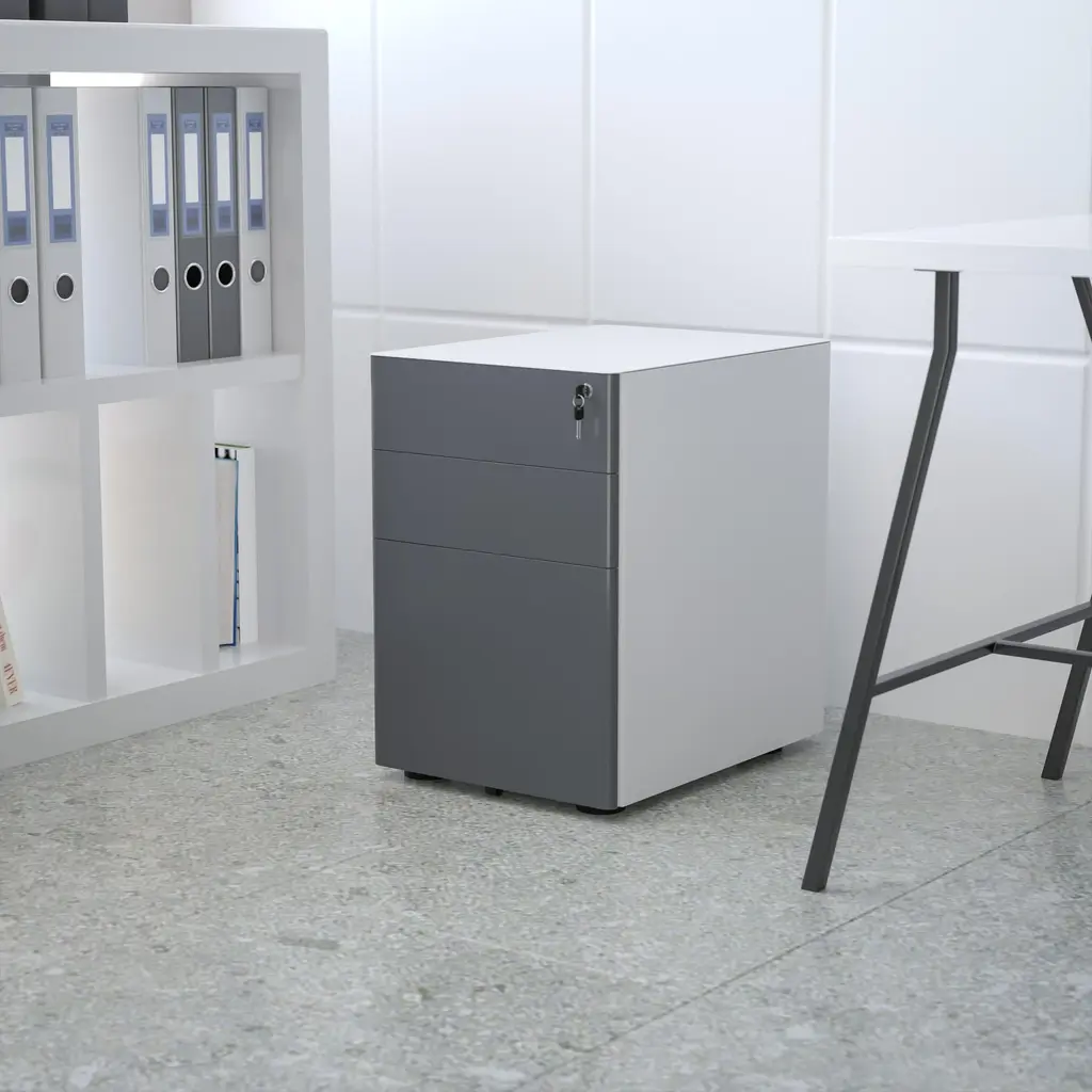 You may love your current desk but have nowhere to store your paperwork without cluttering the desktop, insert this locking file cabinet to keep the minimalistic appearance of your modern office desk. This 3-drawer pedestal file cabinet has low set casters to keep up with the needs of a busy worker. The convenience of casters is ideal for employees who regularly file documents, allowing them the option to pull the cabinet near them while monitoring incoming emails. The modern 3-drawer mobile file cabinet has two utility drawers to hold your small office supplies, snacks, vitamins and writing utensils while the hanging file drawer holds letter, legal, A4 and F4 hanging folders. Folder longer documents such as your legal size paperwork vertically using the conversion bar. An included pencil tray keeps your small supplies neatly stored and can be used in either of the two utility drawers. Two keys are included to keep in separate locations or as a duplicate for your assistant. Smooth surfaced drawers offer clean sightlines and provide a worry-free solution to loosening handle screws over time. Easily open the drawers with the hidden side handles. Organize your office space with this mobile under desk filing cabinet that comes fully assembled and ready-to-use. This ergonomic filing cabinet is a smart solution for any workplace whether used for heavy-duty daily filing or the casual user.