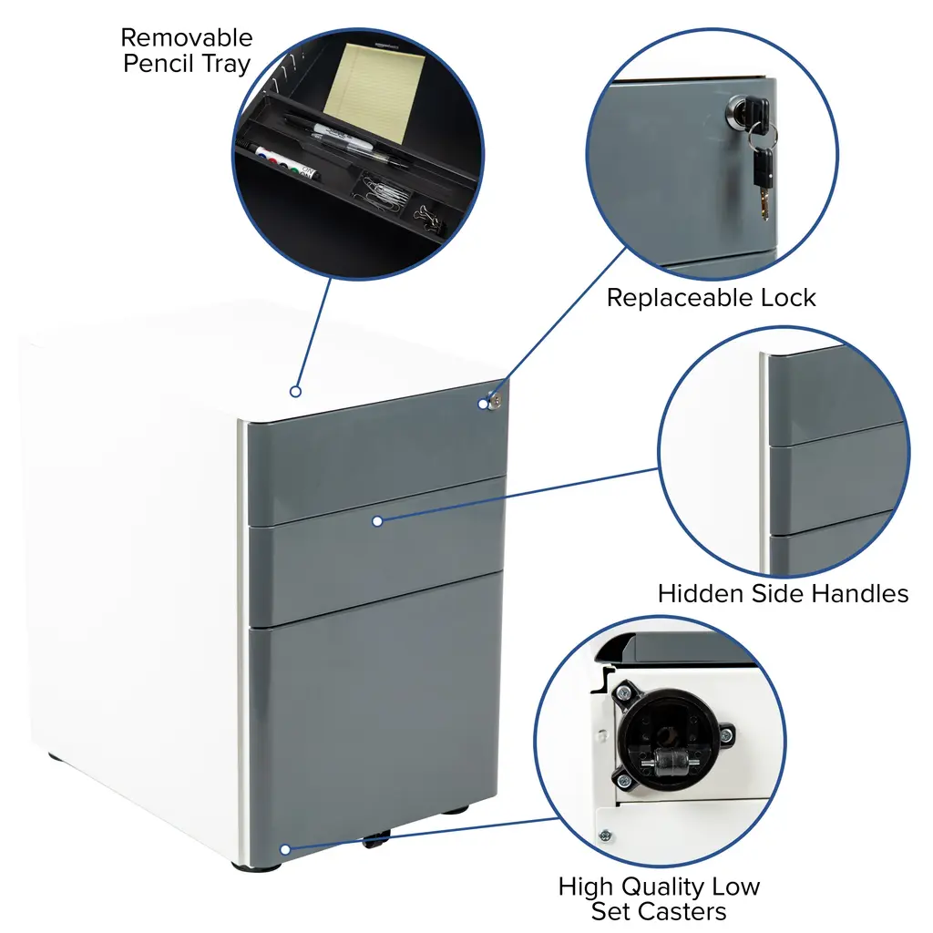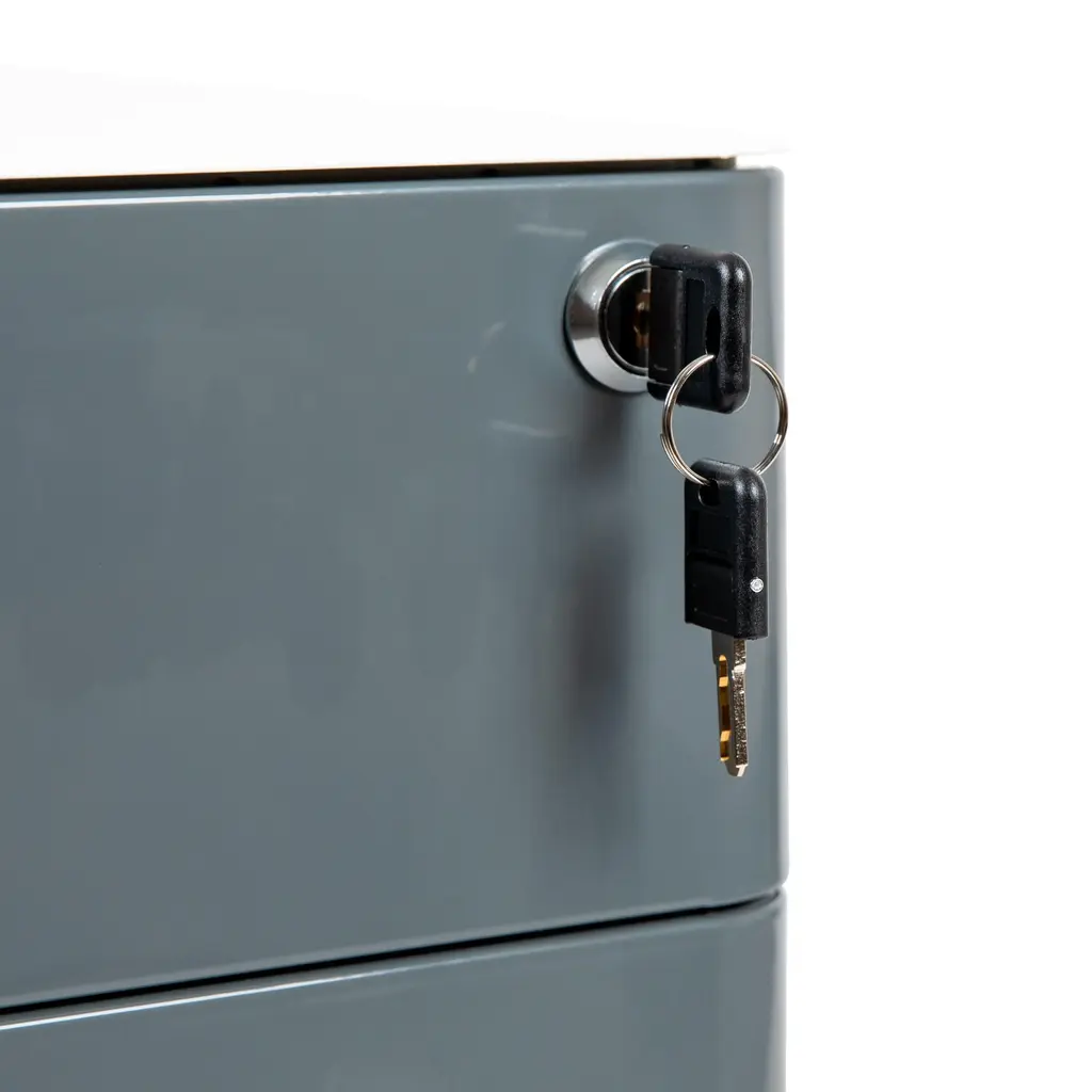 You may love your current desk but have nowhere to store your paperwork without cluttering the desktop, insert this locking file cabinet to keep the minimalistic appearance of your modern office desk. This 3-drawer pedestal file cabinet has low set casters to keep up with the needs of a busy worker. The convenience of casters is ideal for employees who regularly file documents, allowing them the option to pull the cabinet near them while monitoring incoming emails. The modern 3-drawer mobile file cabinet has two utility drawers to hold your small office supplies, snacks, vitamins and writing utensils while the hanging file drawer holds letter, legal, A4 and F4 hanging folders. Folder longer documents such as your legal size paperwork vertically using the conversion bar. An included pencil tray keeps your small supplies neatly stored and can be used in either of the two utility drawers. Two keys are included to keep in separate locations or as a duplicate for your assistant. Smooth surfaced drawers offer clean sightlines and provide a worry-free solution to loosening handle screws over time. Easily open the drawers with the hidden side handles. Organize your office space with this mobile under desk filing cabinet that comes fully assembled and ready-to-use. This ergonomic filing cabinet is a smart solution for any workplace whether used for heavy-duty daily filing or the casual user.