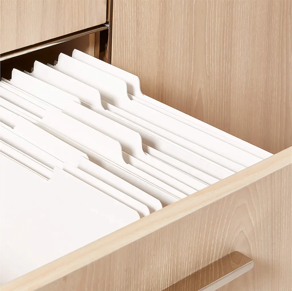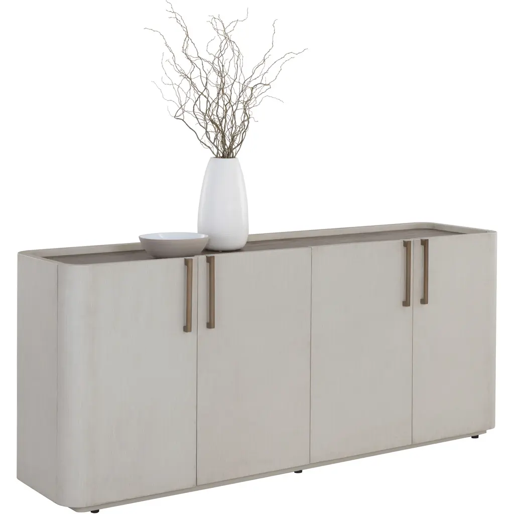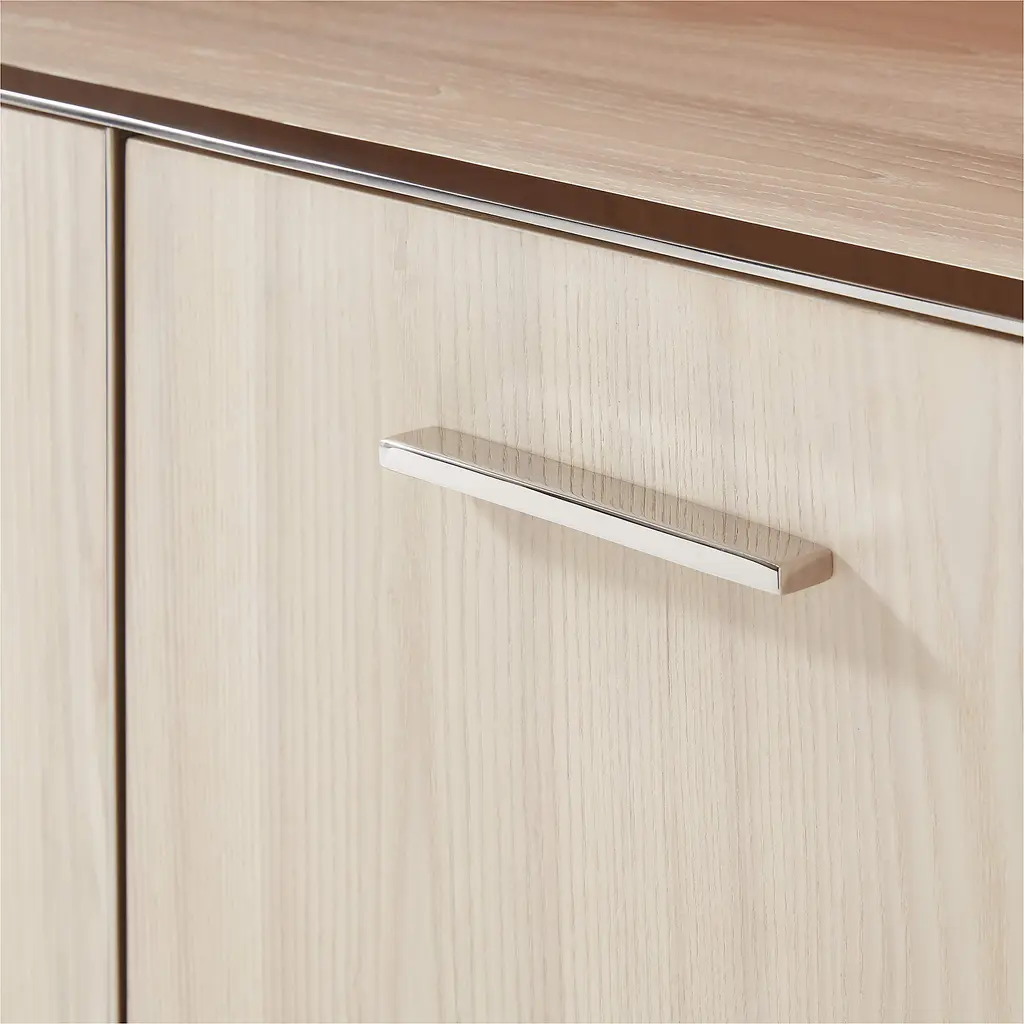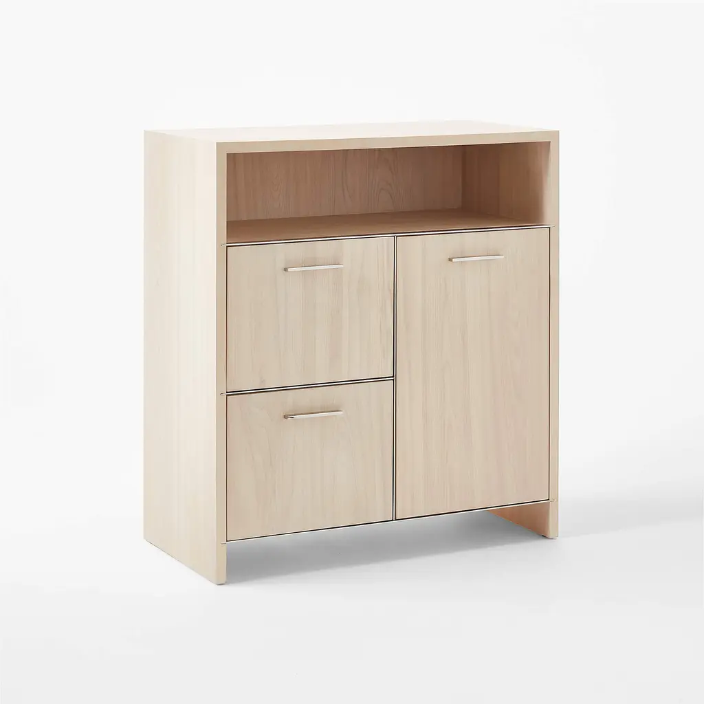 Minimalist storage cabinet from Jannis Ellenberger is distinguished by clean lines rendered in a bleached ash wood veneer. An elongated vertical wood grain on the single soft-close door provides subtle contrast against the two side drawers fronted in an opposing grain. Complemented by slim stainless steel accents, the cabinet provides plenty of storage for the office or entryway. Pair with the Segnato desk for a coordinated look. CB2 exclusive.
