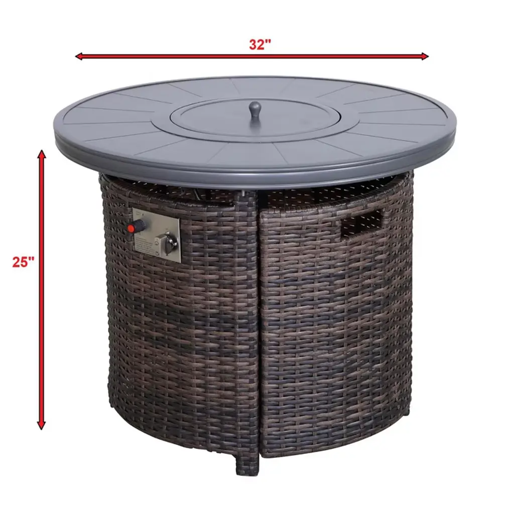 This 25 inch H x 32 inch W aluminum and wicker outdoor fire pit table combines durability and modern style. Constructed with rustproof aluminum and woven wicker, it withstands outdoor conditions while enhancing patio aesthetics. The stainless steel burner accommodates propane or natural gas (conversion kit not included), offers a push-button ignition, adjustable flame, and 55000 BTU output for up to 8 hours of heat. An integrated hidden fuel tank maintains a sleek appearance. The round fire pit comes with a lid, protective cover, and requires assembly with included tools. Finished in espresso with a polyester cover, it is suitable for residential and non-residential outdoor use.