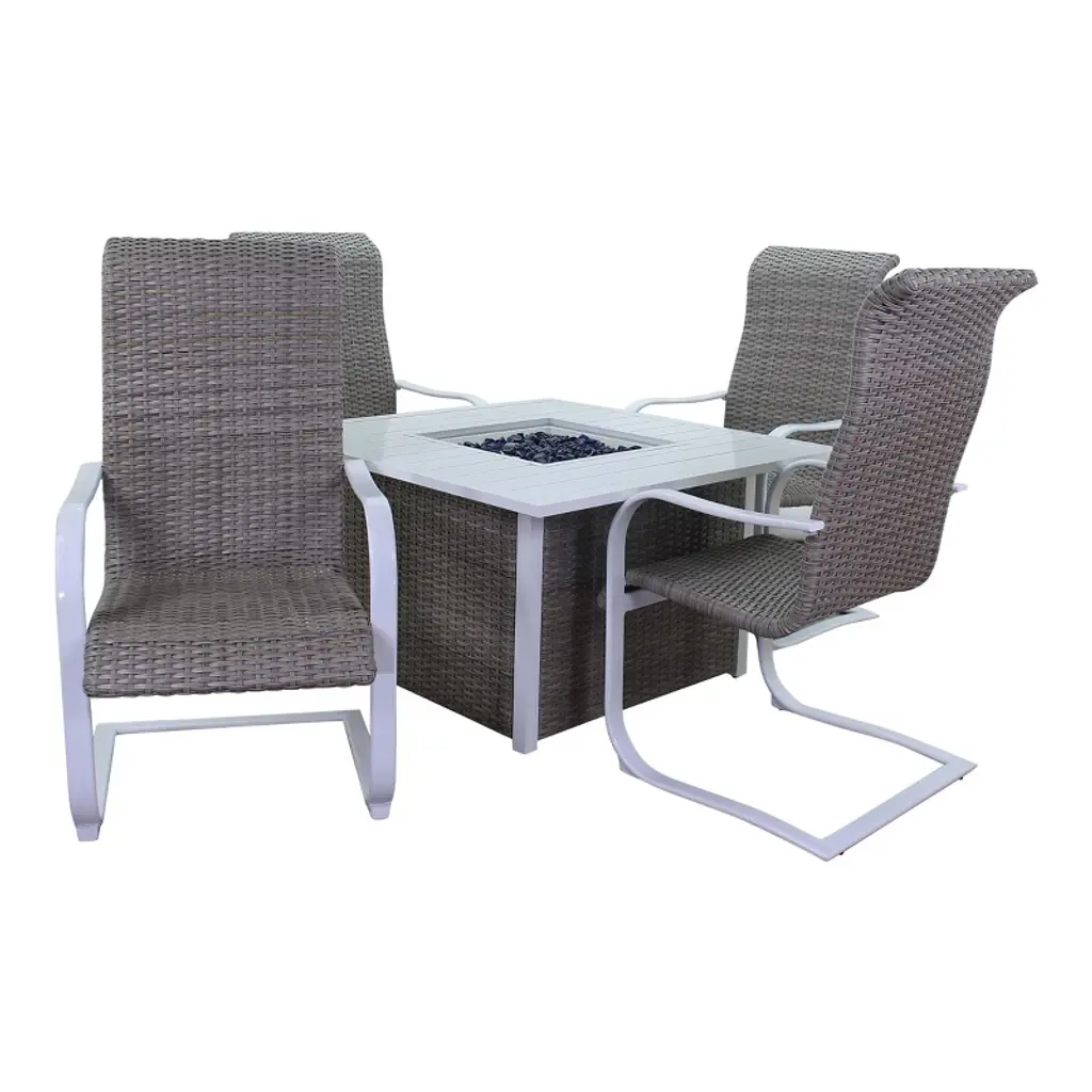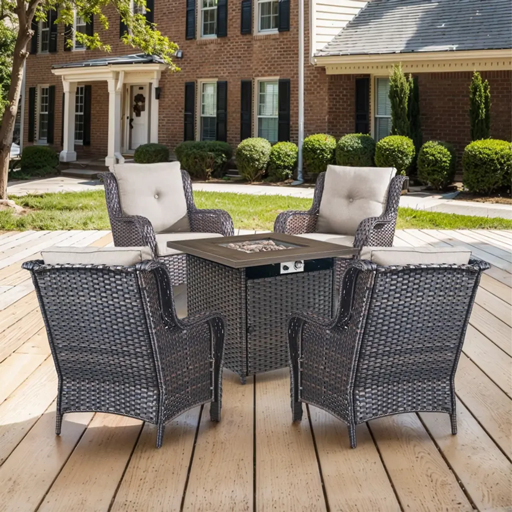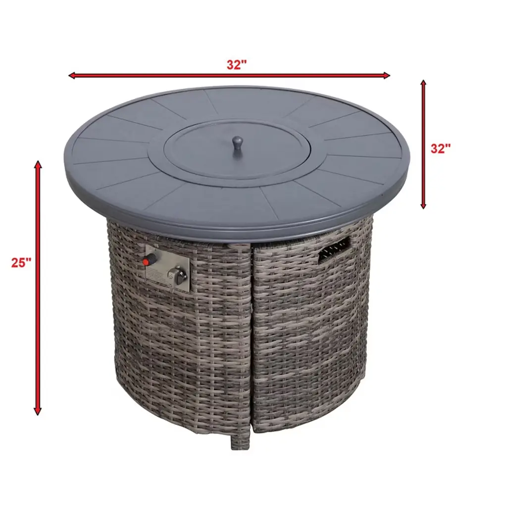 This 25 inch H x 32 inch W aluminum and wicker outdoor fire pit table is designed for style, durability, and safety. Featuring a rustproof aluminum frame combined with wicker, it withstands outdoor elements while adding a modern touch to any patio or backyard. The stainless steel burning area supports propane or natural gas fuel, with a push-button ignition, adjustable flame, and 55000 BTU output for up to 8 hours of warmth. An integrated hidden fuel tank ensures a sleek appearance. The round-shaped fire pit comes with a lid, protective cover, and ETL certification. Assembly is required, with all necessary tools included. Finished in mixed gray with a polyester cover, perfect for residential or non-residential outdoor use.