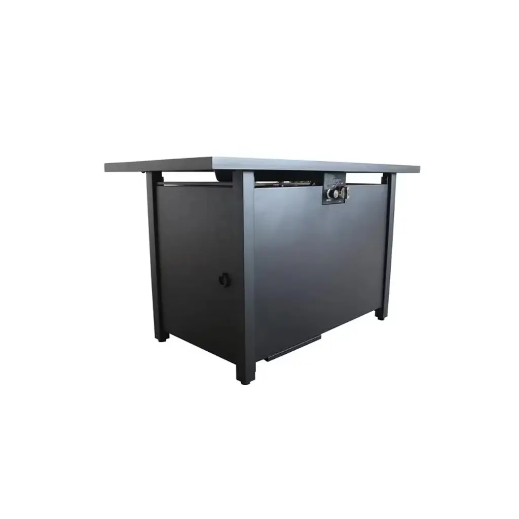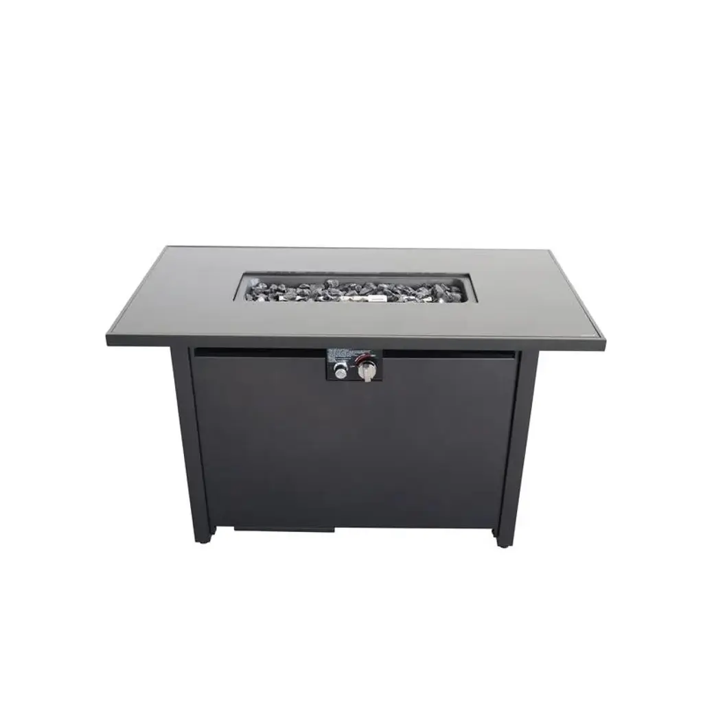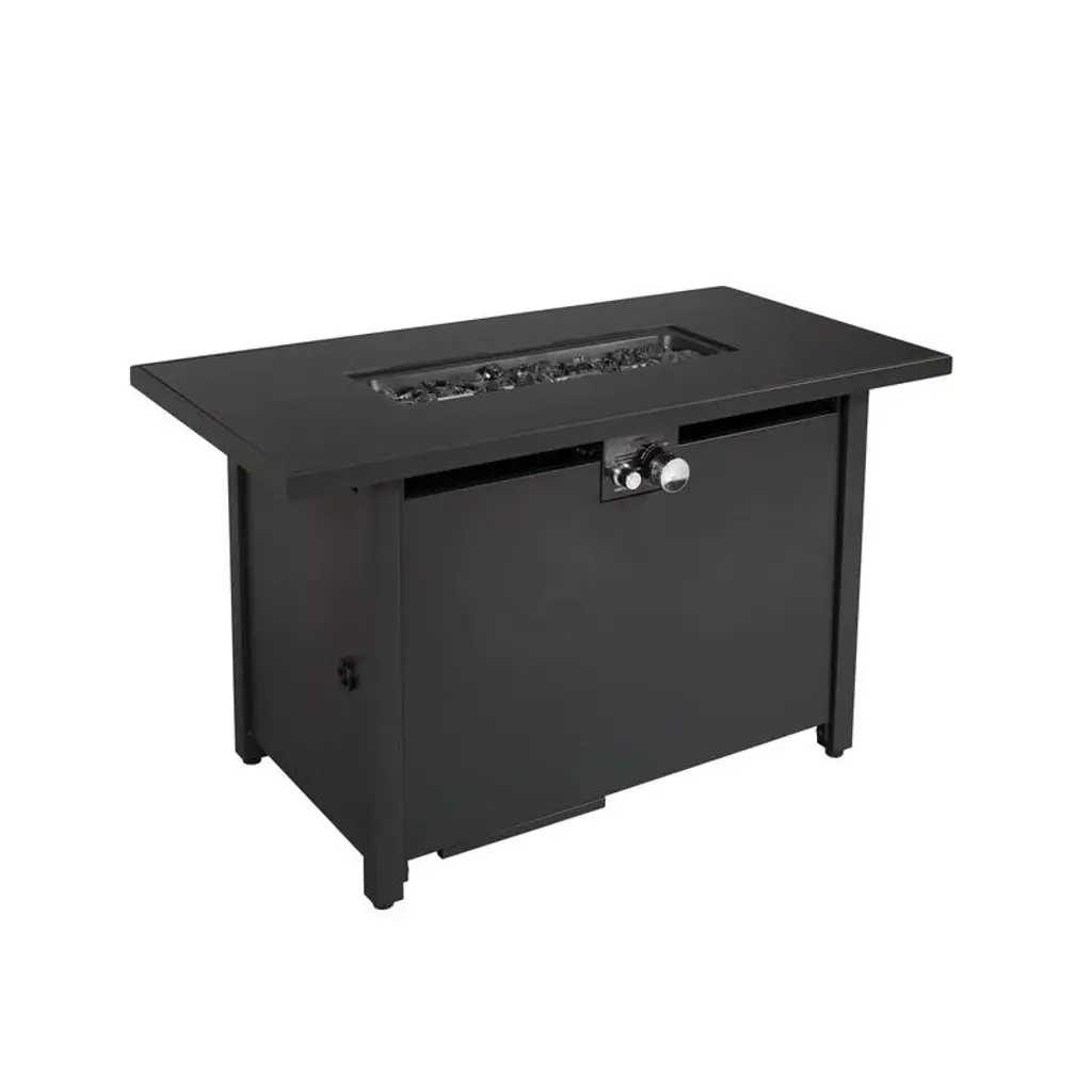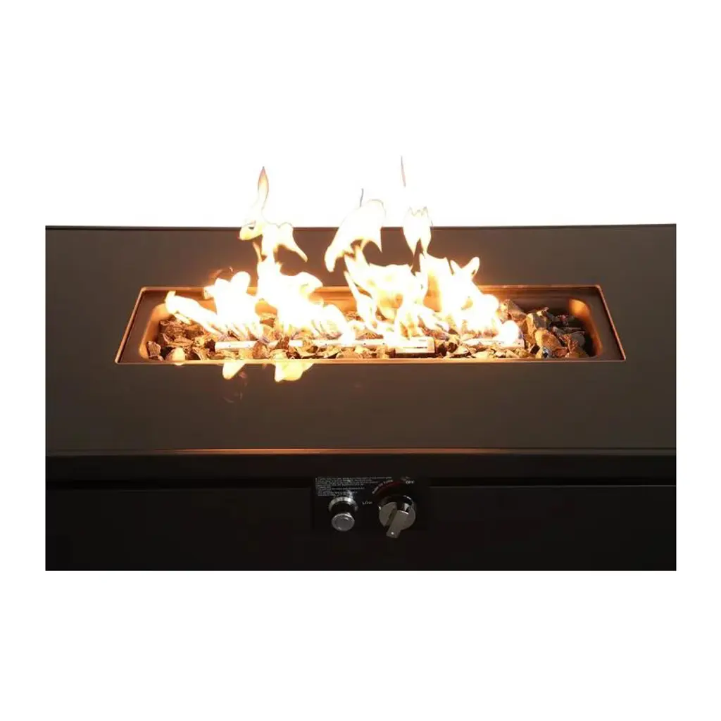 Create a warm and inviting outdoor space with this steel fire pit table, featuring durable rust-resistant construction, stainless steel top, lava rock filler, integrated ignition control, and protective cover for safe and versatile patio enjoyment.