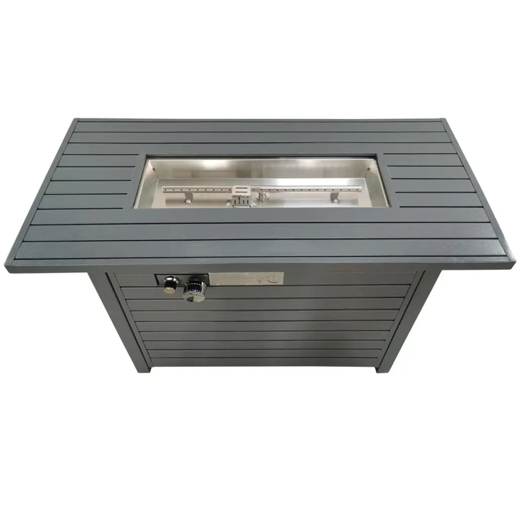 This 25 inch H x 42 inch W steel propane fire pit table combines durability and modern design, perfect for any outdoor patio or backyard. Constructed with powder-coated steel and a stainless steel burning area, it resists heat and weather for long-lasting performance. Designed for use with propane, it features an integrated hidden fuel tank, push-button ignition, adjustable flame, and 50000 BTU output with up to 8 hours of burn time. Lava rocks are included to enhance visual appeal. This rectangle-shaped fire pit comes with a lid, protective cover, and ETL certification for safety. Assembly is required, and all necessary tools are included. Ideal for residential and non-residential outdoor spaces, finished in grey with polyester cover.