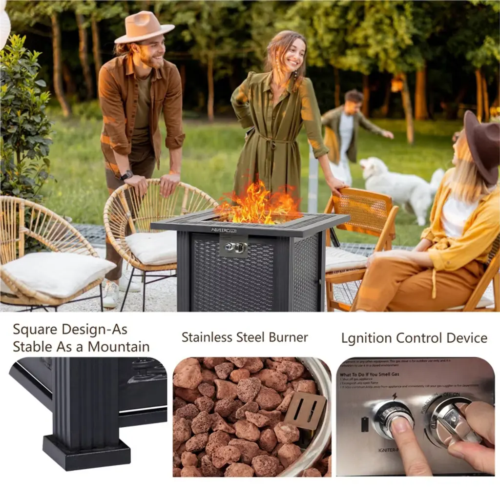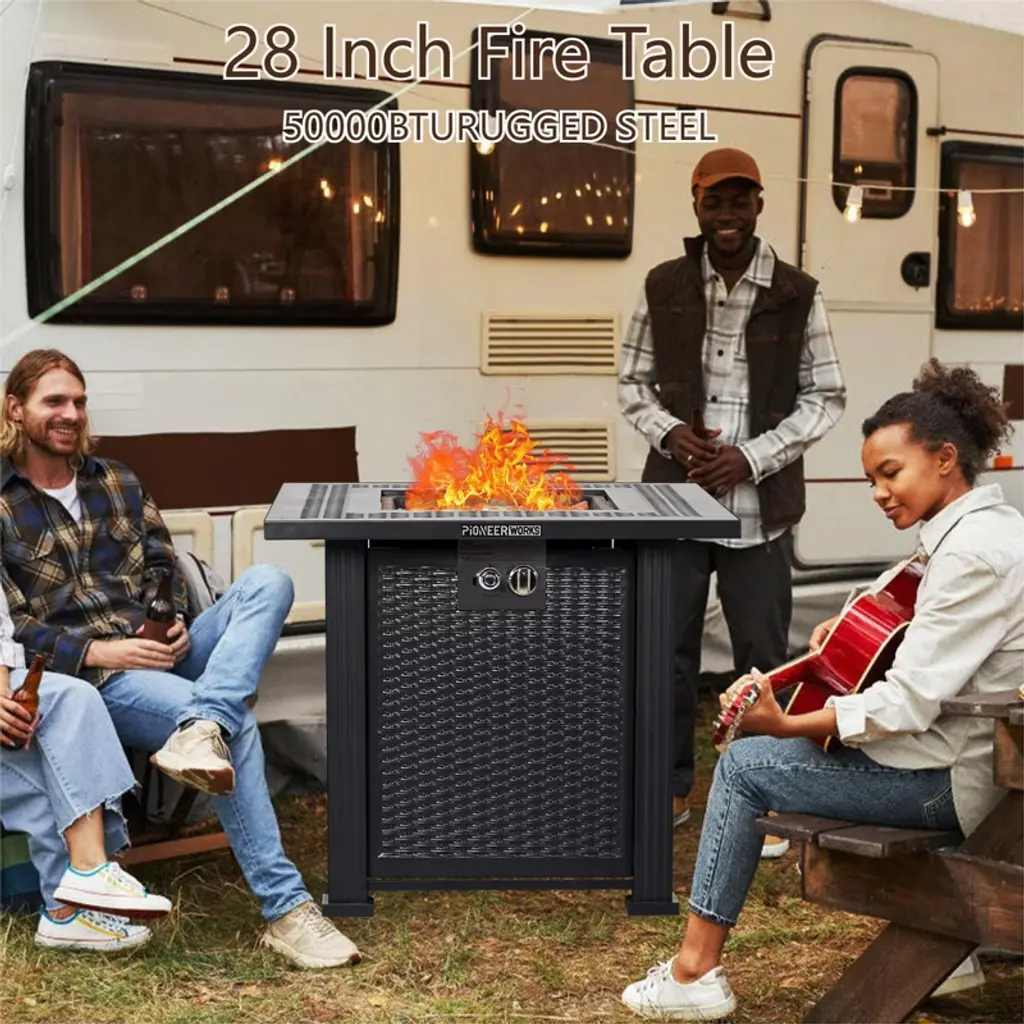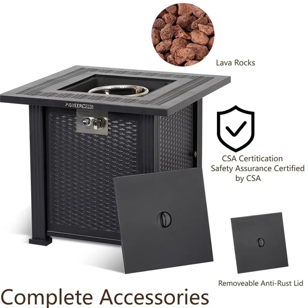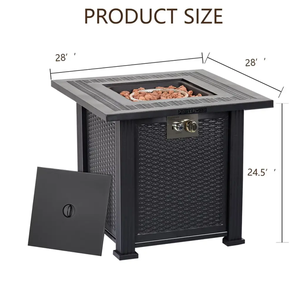 Upgrade your outdoor living with this 28-inch square propane fire pit table, expertly engineered to deliver both exceptional warmth and sophisticated style. Generating 50,000 BTUs of heat, this table efficiently warms your patio, deck, or backyard gathering space—all without the smoke, ash, or mess of traditional fire pits.Constructed from robust steel with a high-temperature-resistant gray finish, this table is built to withstand the elements while maintaining its sleek appearance. The hidden lower compartment neatly stores a standard 20lb propane tank (sold separately), keeping hoses and components out of sight for a clean look. The included lava rocks enhance flame aesthetics and heat distribution, creating a captivating focal point.When the fire feature isn’t in use, simply place the reversible metal lid on top to convert it into a functional table—perfect for holding drinks, snacks, or decorative items. The included waterproof cover offers protection from rain and debris, extending the life of your fire table.This CSA-certified model meets rigorous safety standards and features intuitive ignition and flame control. Whether you’re hosting a party or enjoying a quiet night outdoors, this fire pit table combines practicality, safety, and elegance in one versatile package.