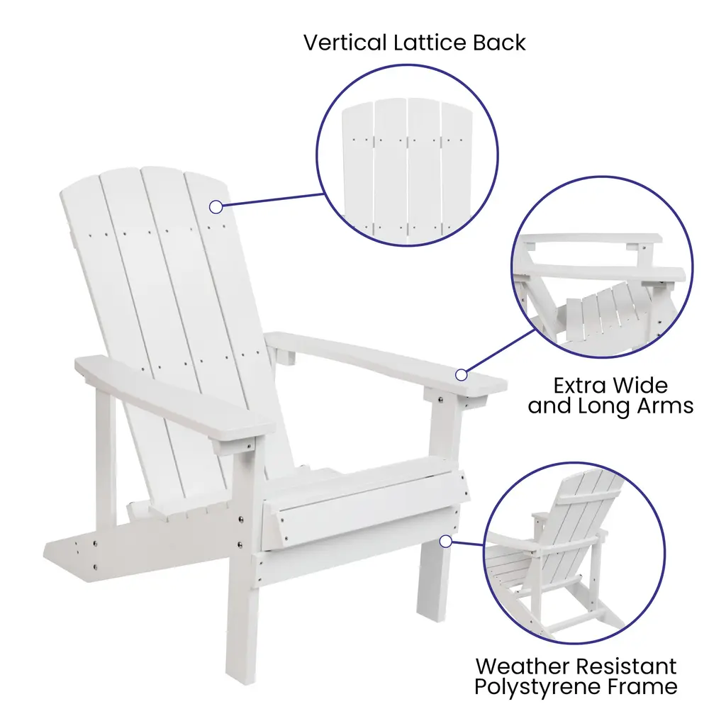 Take a break from the pressures of everyday life and find the perfect relaxation spot with this set of 2 commercial grade colorfull adirondack lounging chairs and star and moon fire pit bundled set. This lounger has a wide back, slanted seat and wide arms so you can enjoy the outdoors in comfort. Constructed of weather-resistant polystyrene, the wood-like substance was designed to hold up in many environments and can be cleaned with a damp cloth. Chair has a vertical lattice back and is also UV protected and designed for outdoor use. Grab your flip flops and favorite swimsuit cover during summer evenings or a big bag of marshmallows, that superbly comfy sweatshirt and blanket when the leaves turn. This 2 chair and fire pit set gives you the perfect area for year round get togethers. The moon and stars in the sky won't be the only ones you see with this black outdoor wood fire pit. This gorgeous piece has moon and star mesh cutouts on the sides that provide ventilation for continual burning while adding charm with a bit of whimsy to your backyard. This fire pit has an attractive finish and comes with a mesh top to prevent sparks from escaping. This round backyard fire pit is made of iron for long lasting durability and has a high temperature coating that will look great season after season. Assembly takes less than 10 minutes for each chair so you can get down to the business of relaxing. Make great memories at home, the beach or at the campground with this fire pit and 2 chair combo.