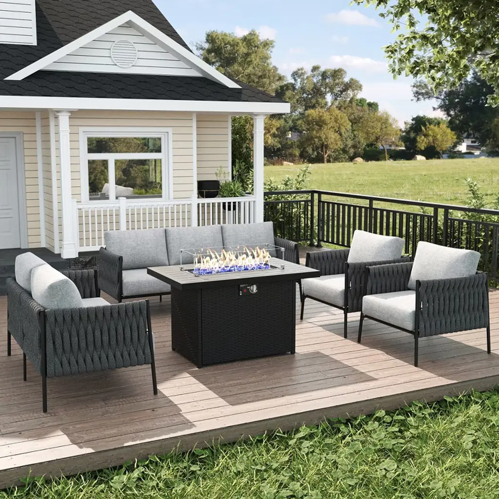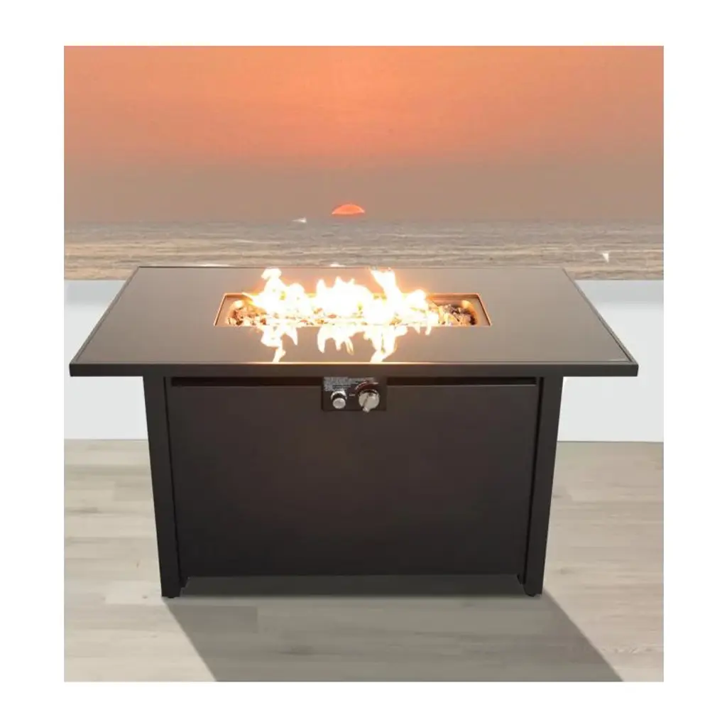 Create a cozy and stylish outdoor gathering space with this 42" W x 25" H steel fire pit table, featuring powder-coated steel construction, heat-resistant surface, concealed propane storage, adjustable flame, and a protective lid that doubles as a functional tabletop.
