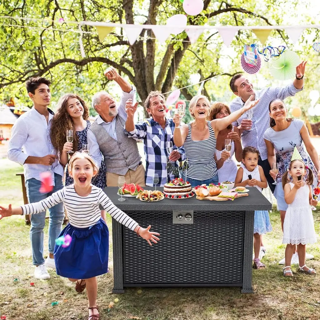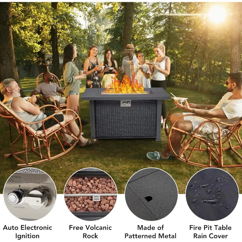 Transform your outdoor space with this versatile 44-inch propane fire pit table, perfect for cozy gatherings or as a stylish table for drinks and snacks. With a powerful 50,000 BTU output, it ensures warmth for cool evenings. Featuring double rattan doors, sleek design, and elegant glass crystal stones, it combines style with functionality and offers convenient storage. Ideal for any patio, garden, or backyard setting.More FeaturesEasy to use with the auto electronic ignition switchUnique double sided removable lid for multiple useWaterproof cover for storage and water-resistant useLarge independent storage space under the tableEasy to assemble.Package including44 Inch Propane Fire Pit TableUnique double-sided lidLava StoneRain CoverMounting screwsProduct manualSpecificationsSize: 44”x25”x25”Item weight: 85 LBSNotesDo not cover the waterproof cover under high temperature conditions.If you have any questions about this item, please contact us without hassle.