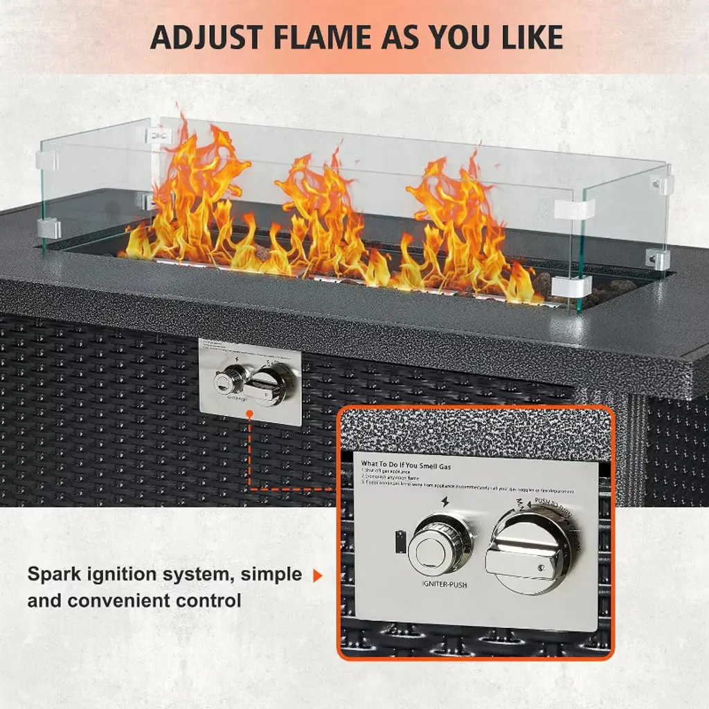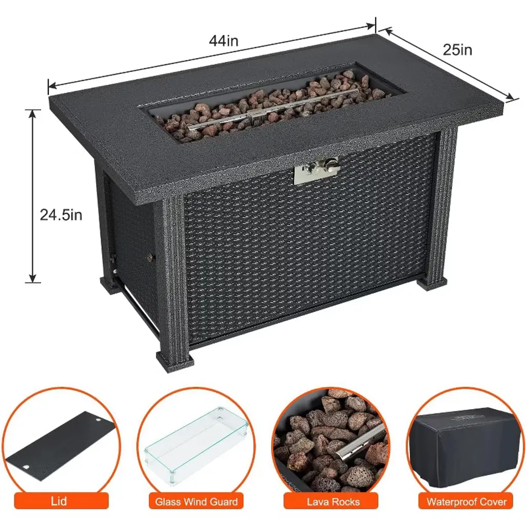 Transform your outdoor space with this versatile 44-inch propane fire pit table, perfect for cozy gatherings or as a stylish table for drinks and snacks. With a powerful 50,000 BTU output, it ensures warmth for cool evenings. Featuring double rattan doors, sleek design, and elegant glass crystal stones, it combines style with functionality and offers convenient storage. Ideal for any patio, garden, or backyard setting.More FeaturesEasy to use with the auto electronic ignition switchUnique double sided removable lid for multiple useWaterproof cover for storage and water-resistant useLarge independent storage space under the tableEasy to assemble.Package including44 Inch Propane Fire Pit TableUnique double-sided lidLava StoneRain CoverMounting screwsProduct manualSpecificationsSize: 44”x25”x25”Item weight: 85 LBSNotesDo not cover the waterproof cover under high temperature conditions.If you have any questions about this item, please contact us without hassle.