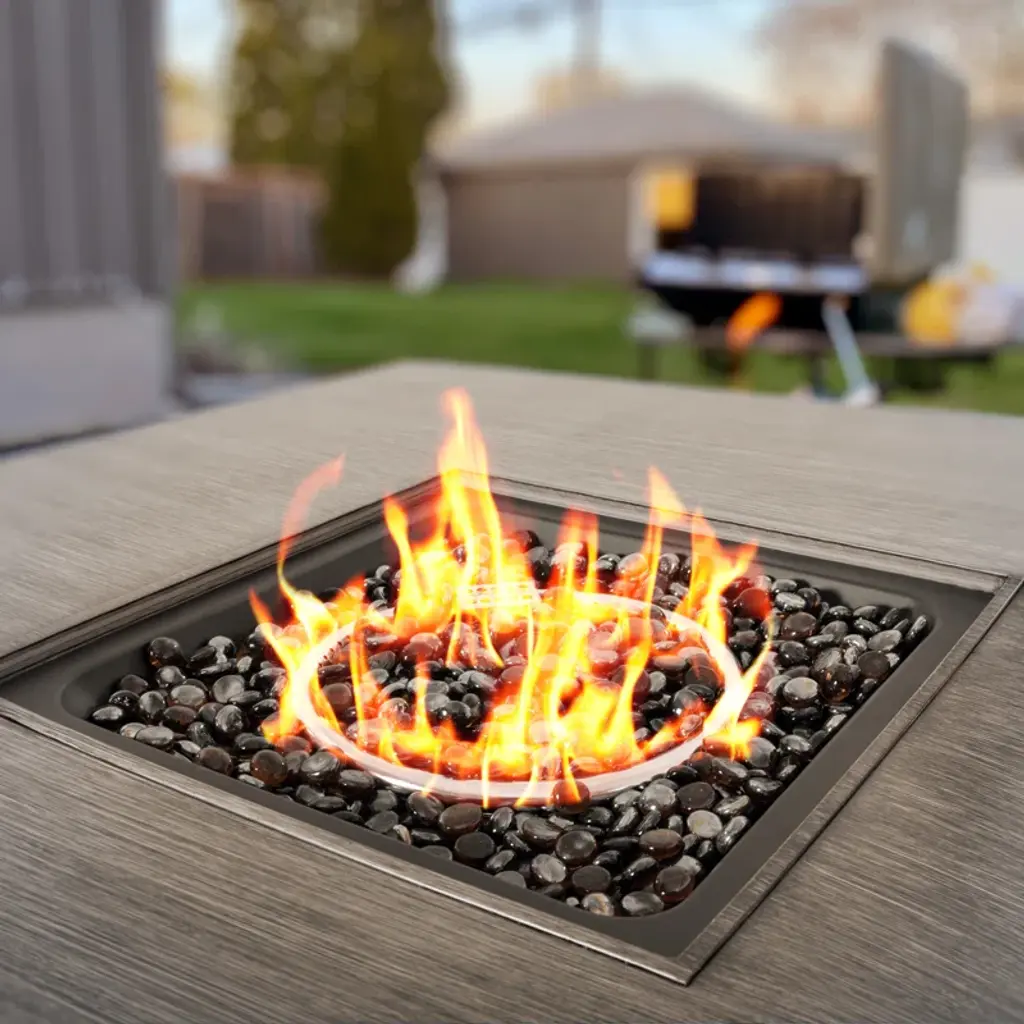 This Patio Square Fire Pit table combines functionality and style for your outdoor living space. With a removable lid, it easily transforms between a practical dining table and a warm fire pit. Its versatile design is perfect for various outdoor settings, from casual gatherings to relaxing evenings. The fire pit table features non-slip feet, ensuring stability on different surfaces. Its brushed paint finish not only adds a modern touch but also provides excellent protection against wear and the elements. The textured surface enhances both aesthetics and durability, making it an ideal choice for outdoor environments. Decorative glass beads complement the flames, creating a visually striking display. The stainless steel round burner head provides consistent and efficient heat, offering a comfortable atmosphere for any outdoor occasion. Designed for durability and style, this fire pit table is the perfect addition to your patio or garden.