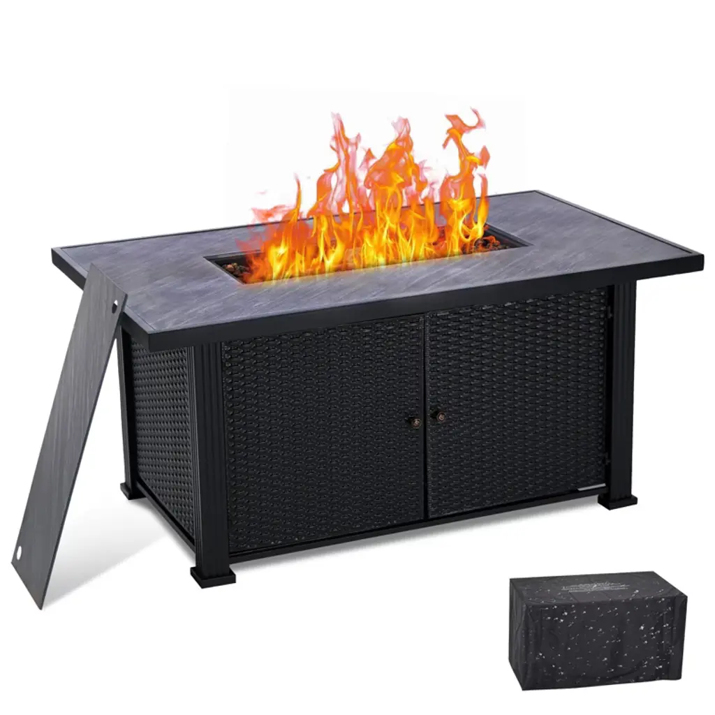 TROPOW 52" Propane Fire Pit Table ¨C 50,000 BTU Large Rectangle Fire Table with Double-Sided Cover & Rain Cover, Industrial Steel & Slate Top, CSA Certified ¨C Perfect for Garden, Patio & BackyardProduct Features:??? Durable, Weather-Resistant ConstructionCrafted from sturdy steel with a powder-coated finish and a unique slate tabletop, this fire pit table resists cracking, rust, and oxidation for long-lasting outdoor use. Features a convenient internal storage compartment designed to hold a standard 20-pound propane tank (tank sold separately) and additional space for essentials.?? Powerful, Clean Burning & Easy OperationCSA-certified for safety, the 52-inch fire pit delivers 50,000 BTU of stable, smokeless heat fueled by liquid propane. The hidden chrome manual control valve offers 100% smoke-free flame height adjustment, while the electronic ignition system ensures quick and effortless fire starting.?? Sophisticated Industrial Design with Dual FunctionalityBoasts a high-end, industrial look with a sturdy steel frame, slate tabletop, and double-sided cover¡ªchoose between metal or slate to suit your style. Easily switch from fire pit to table mode by using the included covers, turning it into a dining, coffee, or leisure table that complements your outdoor space.? Extra Large Surface with Rain Cover ProtectionWith generous dimensions (52" L x 31" W x 25" H), this fire table offers ample room for drinks and snacks, ideal for entertaining guests. The included rain cover protects your fire pit from weather elements, keeping it dry and ready for use.?? Complete Package with Warranty & SupportIncludes fire pit table, double-sided covers (metal and slate), volcanic stones, rain cover, mounting screws, product manual, and warranty card. Backed by a 24-month warranty and professional after-sales service to ensure your satisfaction and peace of mind.Product Specifications:Brand: TROPOWMaterial: Steel with powder-coated finish, Slate tabletopColor: GrayDimensions: 54.72" D x 33.86" W x 9.06" H (Table height 25")Item Weight: 92.6 lbsFuel Type: Liquid Propane (20 lb tank not included)BTU Output: 50,000 BTUFinish Type: Powder CoatedStyle: Classic IndustrialCertification: CSA Certified
