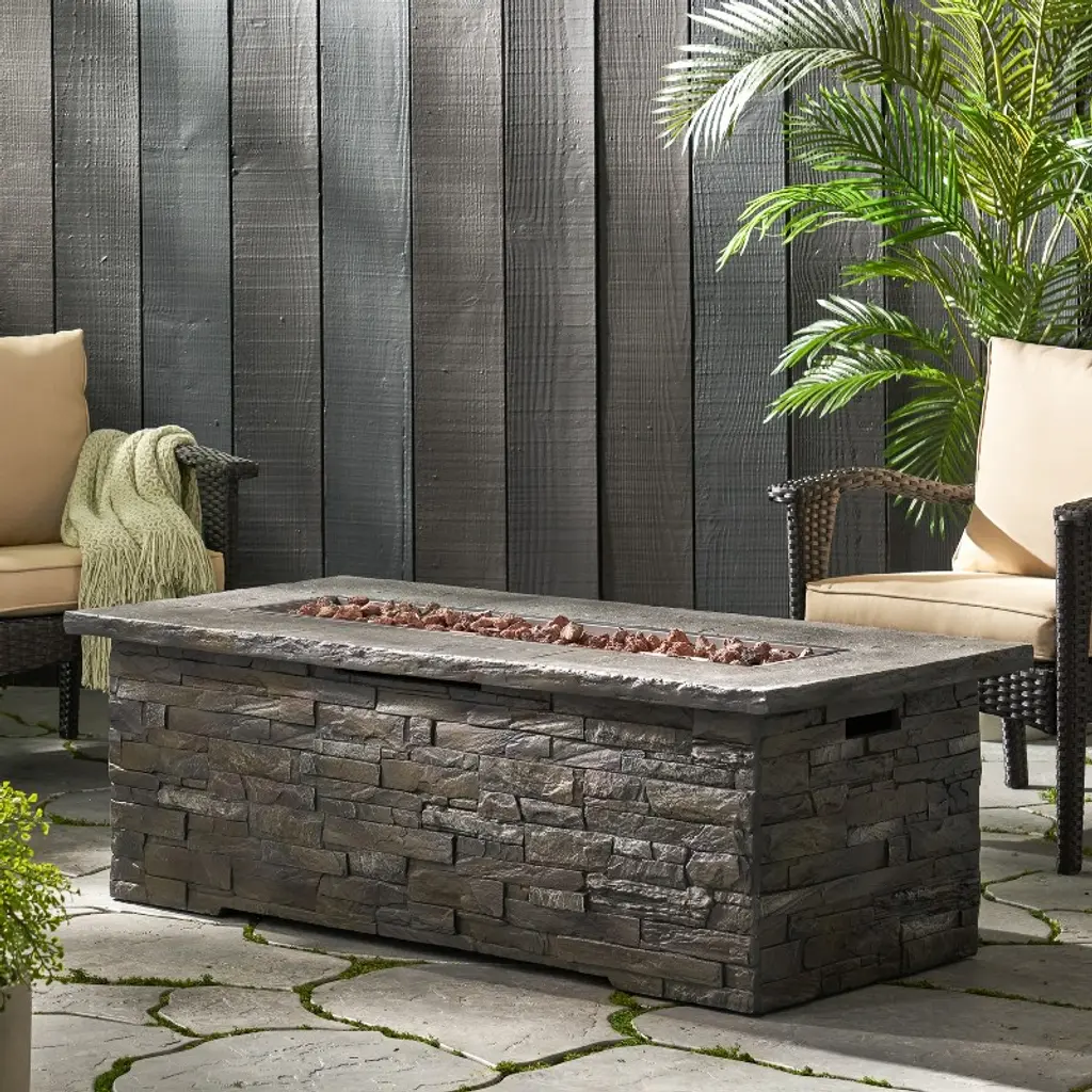 56 Inch Rectangular Outdoor Fire Pit With 40,000 Btu And Faux Stone Concrete Finish