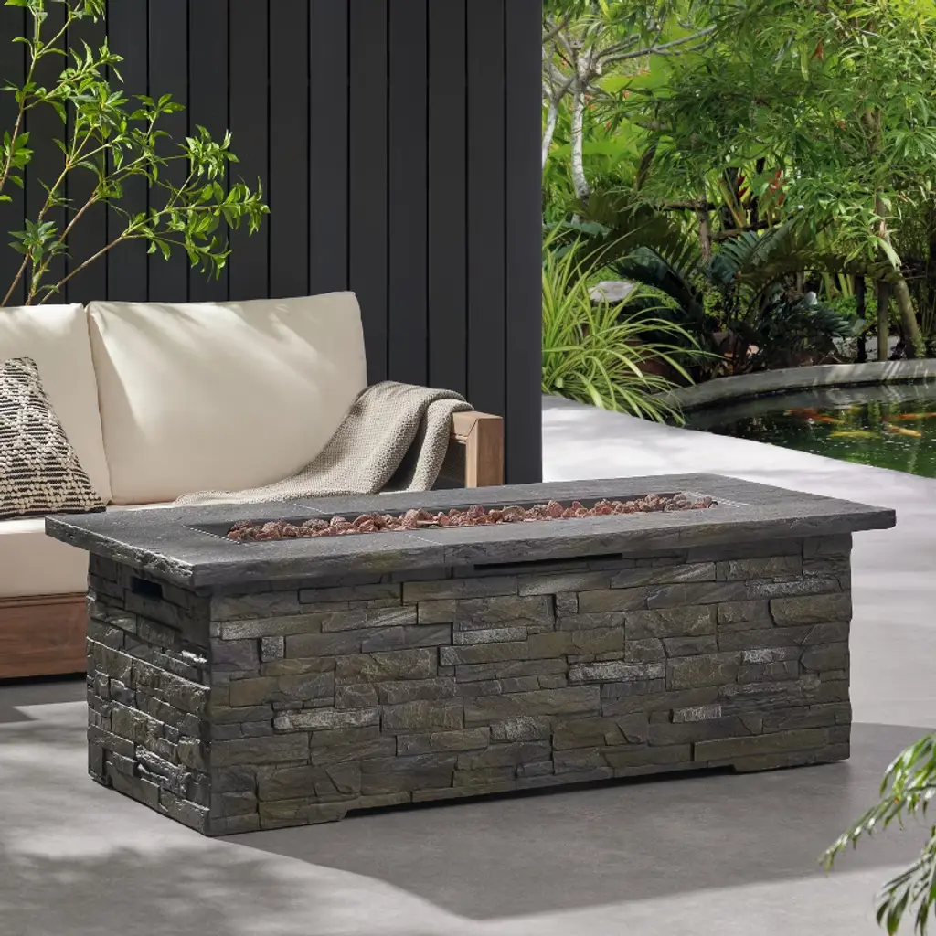 Elevate your patio or backyard with this 56 inch rectangular fire pit, crafted from lightweight concrete with a faux stone texture. Delivering 40,000 BTU of warmth, it creates a stylish and inviting centerpiece for social gatherings, evening relaxation, and outdoor entertaining.