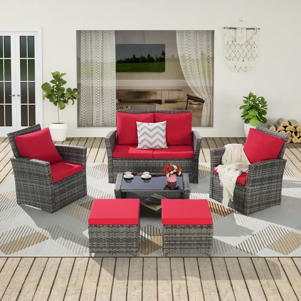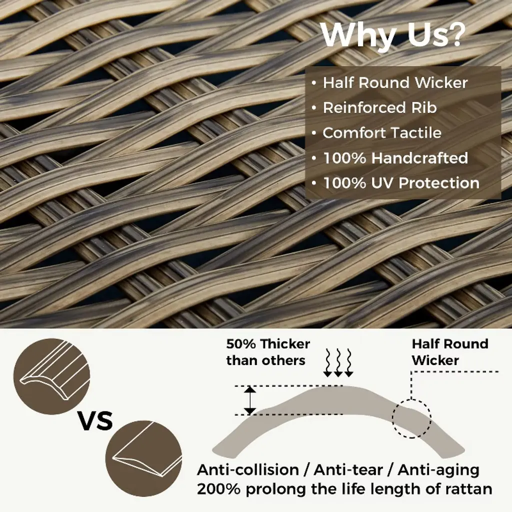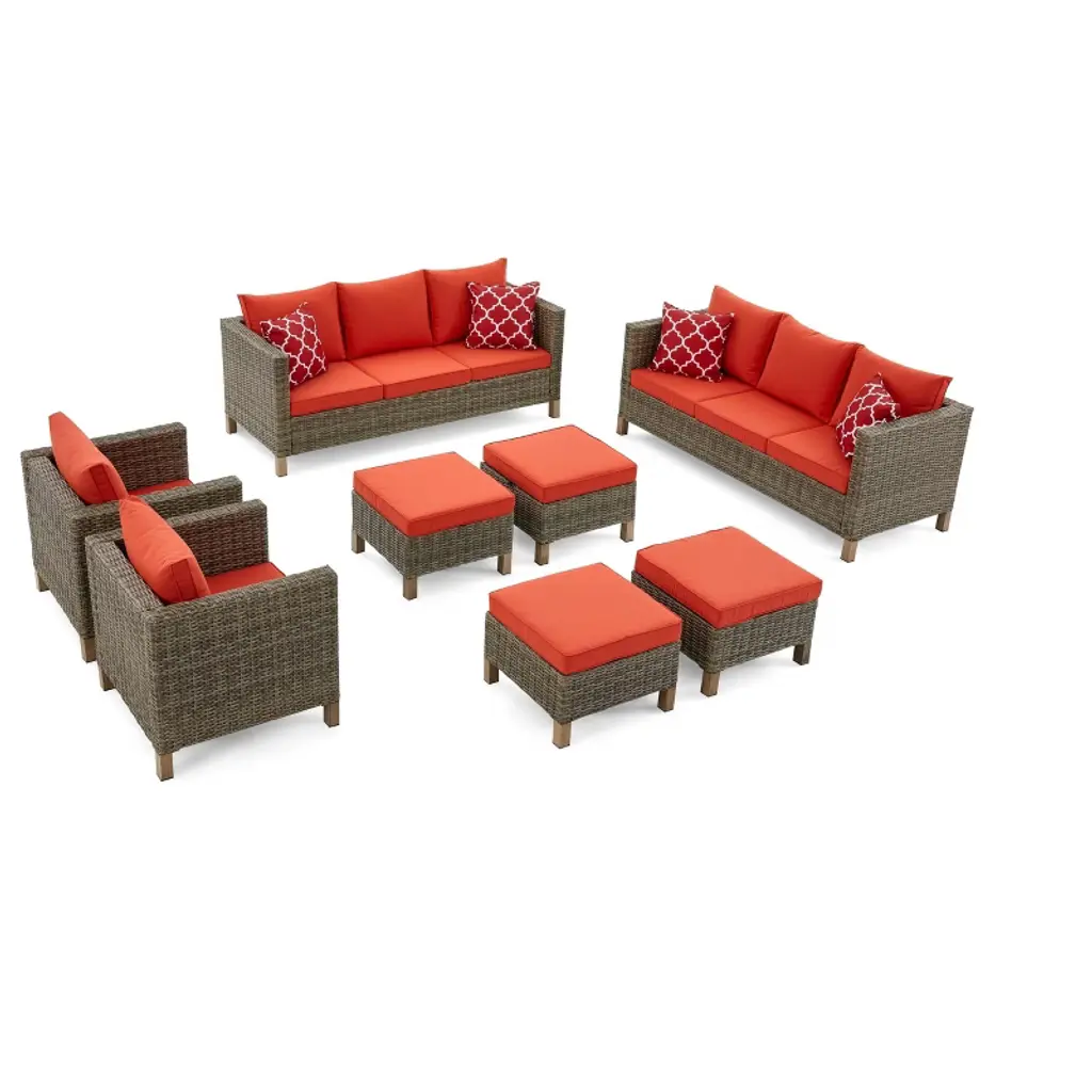 Spacious 8-Person Patio Set: Host large gatherings comfortably with this durable resin wicker collection. Includes a 3-seater sofa, loveseat, 2 lounge chairs, and 2 ottomans with 16 plush cushions. Features rust-proof steel frames and fade-resistant handwoven wicker that withstands sun, rain, and heavy use. Deep seats, wide armrests, and high-density cushions with lumbar support ensure all-day comfort. Easy assembly and removable cushion covers simplify maintenance.