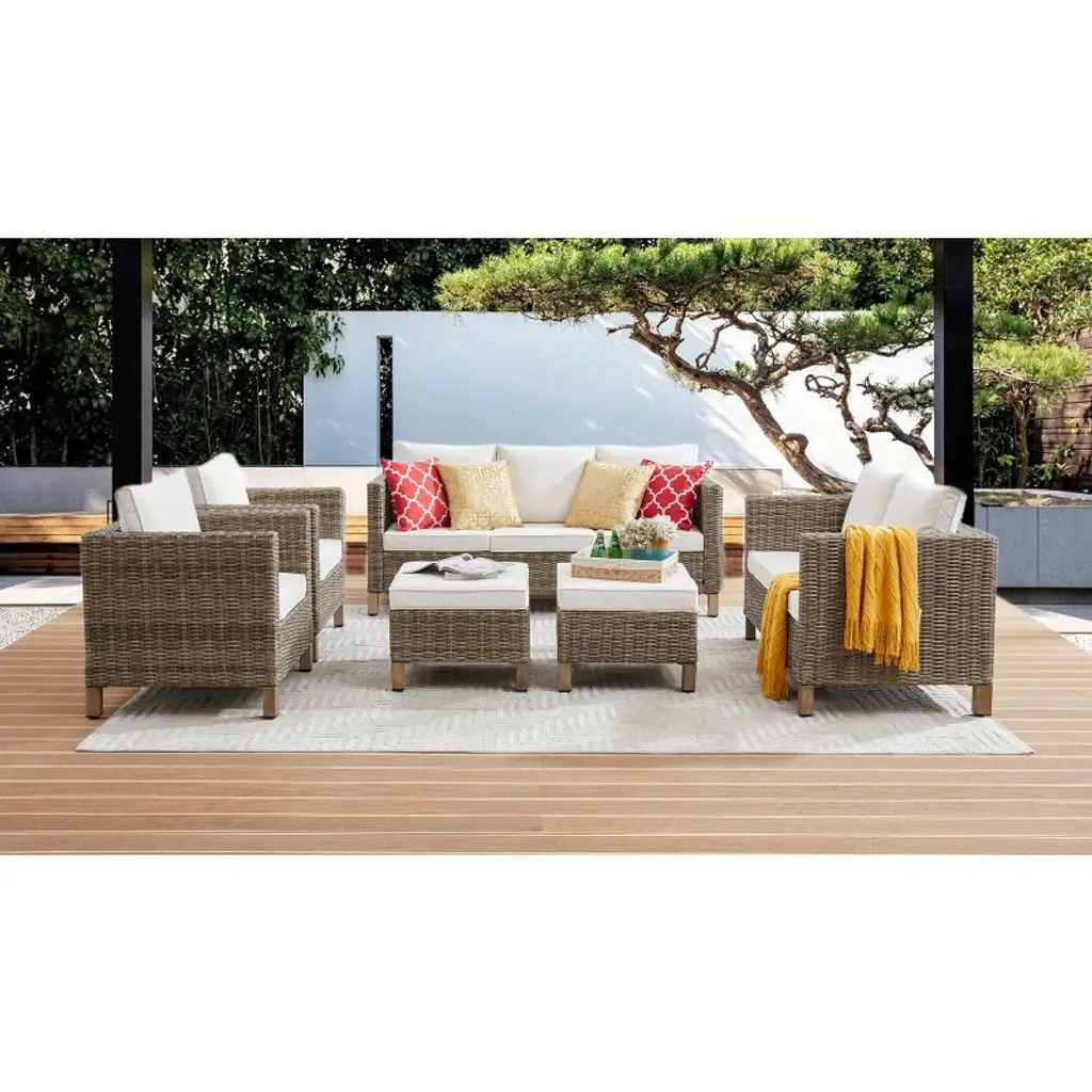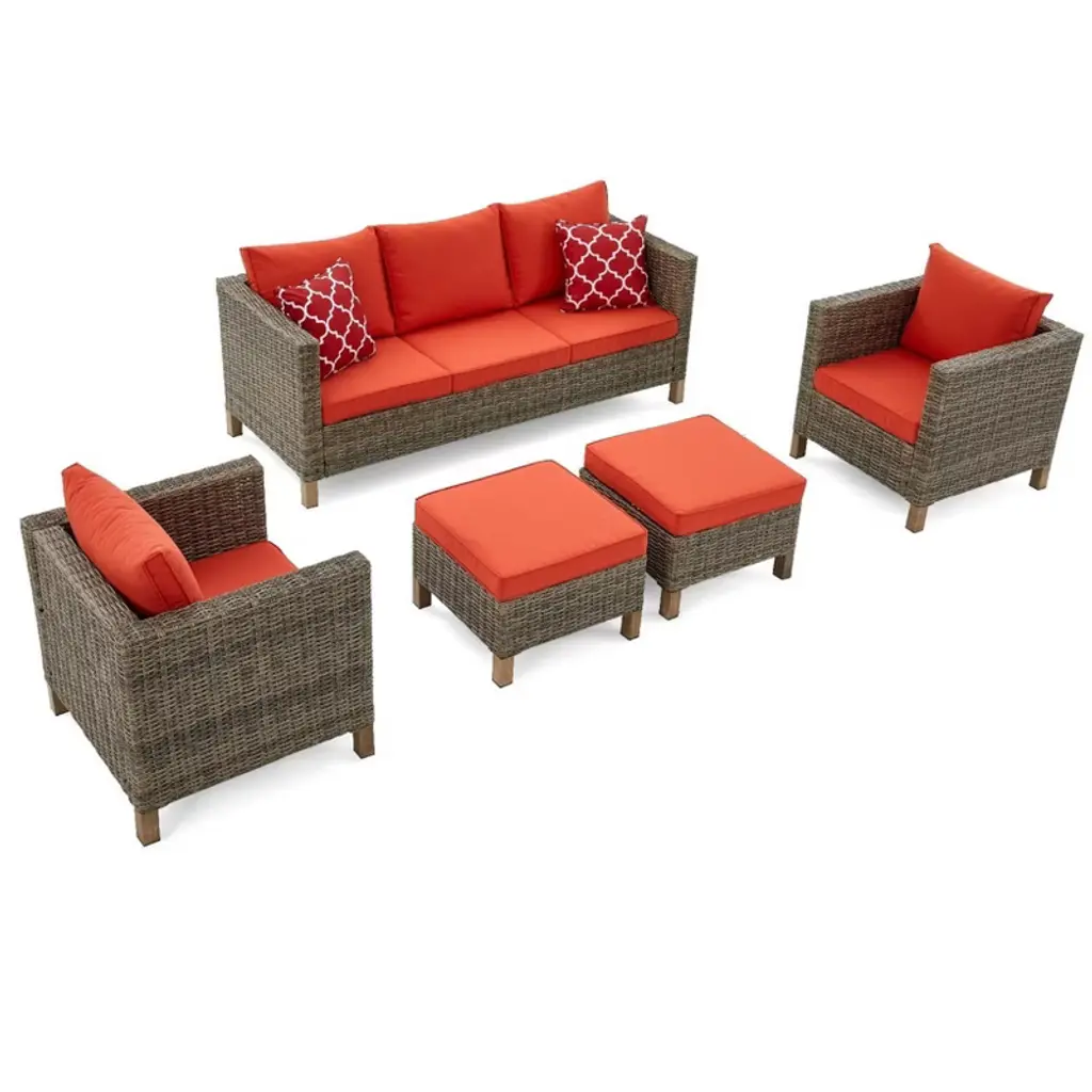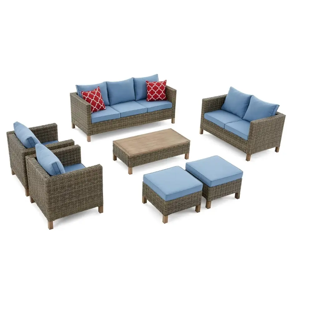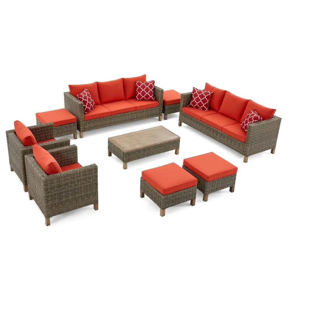 Spacious 8-Person Patio Set: Host large gatherings comfortably with this durable resin wicker collection. Includes a 3-seater sofa, loveseat, 2 lounge chairs, and 2 ottomans with 16 plush cushions. Features rust-proof steel frames and fade-resistant handwoven wicker that withstands sun, rain, and heavy use. Deep seats, wide armrests, and high-density cushions with lumbar support ensure all-day comfort. Easy assembly and removable cushion covers simplify maintenance.