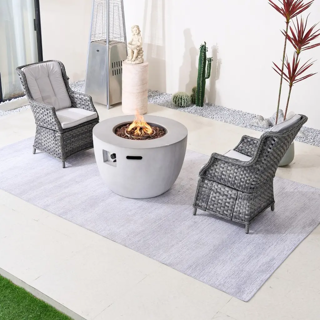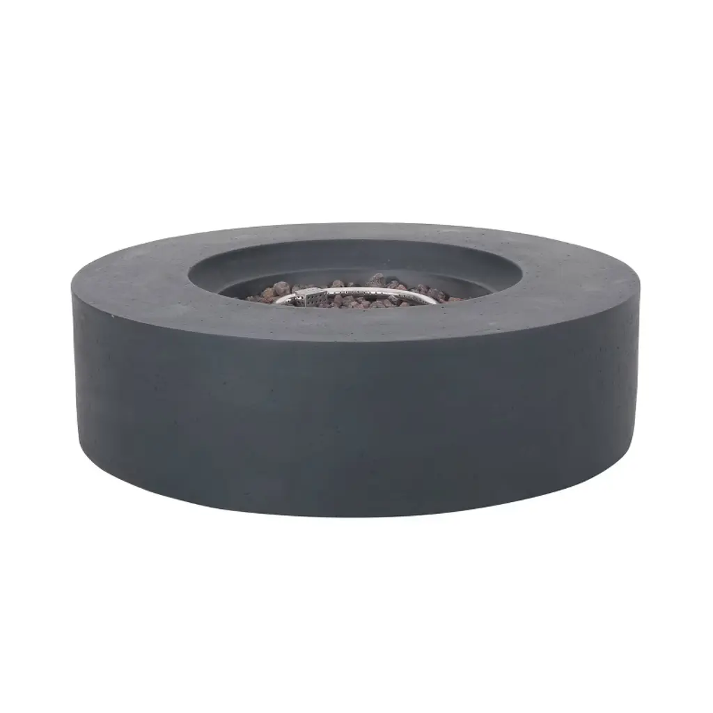 Enjoy the night sky and a warm fire with your family and friends. With 50,000 BTU and clean, curved lines built from smooth lightweight concrete, our propane gas fire pit not only offers an incredible upgrade in style but is also perfect for parties due to its easy seating arrangement. From intimate conversations around a cozy fire to stargazing on cool summer nights, our circular fire pit will have no trouble gathering everyone together for hours of quality time. Please note that tank holder is NOT included.MODERN DESIGN: With clean, precise lines, our fire pit is the ideal modern accessory for your interior space. Finished with a smooth concrete surface and simplistic design, this piece not only offers a chic, minimalistic look but also provides incredible structure.LIGHTWEIGHT CONCRETE: This circular fire pit is constructed with lightweight concrete for a smooth look. This provides a highly durable structure that can hold a substantial amount of weight.50,000 BTU: Featuring a BTU of 50,000, our fire pit allows easy seating arrangement for you and your guests, providing light and warmth all around during those chilly evenings. Please note that this fire pit is propane gas only.DIMENSIONS: Choose an accessory that is the perfect size for you and your furniture. This fire pit is 39.25” W x 39.25” D x 11.50” H. You will love how much your space can transform with the simple addition of this charming fire pit.NO ASSEMBLY REQUIRED: No assembly is required for this fire pit. Simply place the lava rocks in the pit without covering the burner, and then plug in your standard size propane tank and enjoy your fire pit. Please note that tank holder is NOT included.