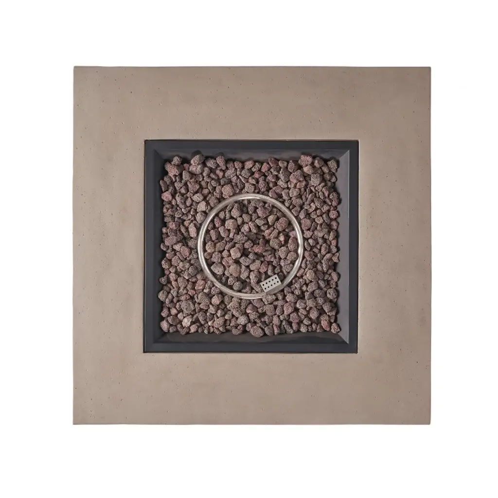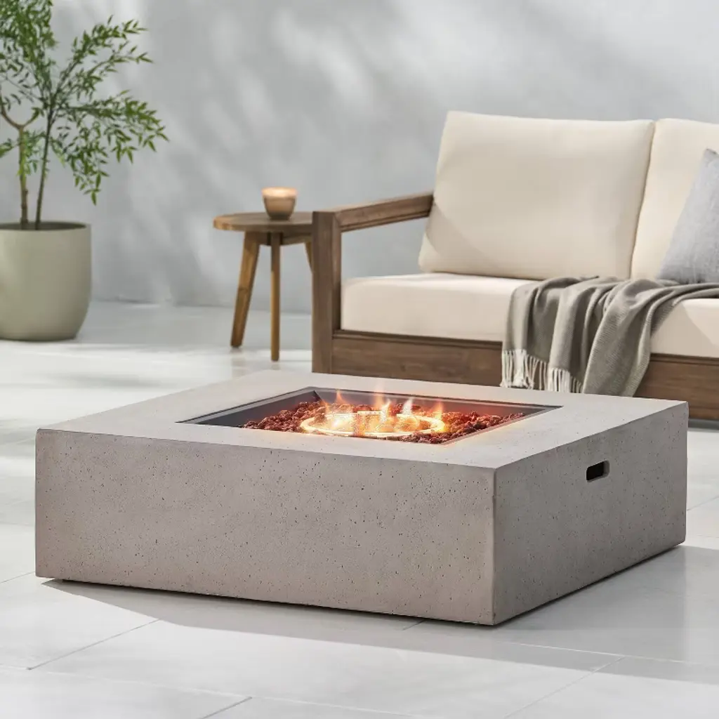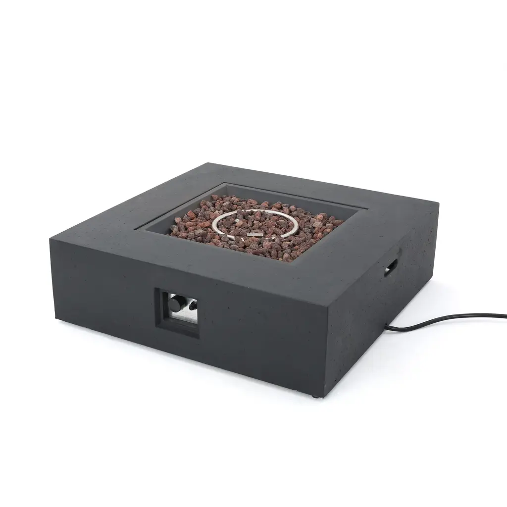 Take in the view of warm, flickering flames against the night sky. With 50,000 BTU and clean, straight lines built from smooth lightweight concrete, our propane gas fire pit not only offers an incredible upgrade in style but is also perfect for parties due to its easy seating arrangement. From intimate conversations around a cozy fire to stargazing on cool summer nights, this square fire pit will have no trouble gathering everyone together for hours of quality time. Please note that tank holder is NOT included.MODERN DESIGN: With clean, precise lines, our fire pit is the ideal modern accessory for your interior space. Finished with a smooth concrete surface and simplistic design, this piece not only offers a chic, minimalistic look but also provides incredible structure.LIGHTWEIGHT CONCRETE: This square fire pit is constructed with lightweight concrete for a smooth look. This provides a highly durable structure that can hold a substantial amount of weight.50,000 BTU: Featuring a BTU of 50,000, our fire pit allows easy seating arrangement for you and your guests, providing light and warmth all around during those chilly evenings. Please note that this fire pit is propane gas only.DIMENSIONS: Choose an accessory that is the perfect size for you and your furniture. This fire pit is 40.00” W x 40.00” D x 12.50” H. You will love how much your space can transform with the simple addition of this charming fire pit.NO ASSEMBLY REQUIRED: No assembly is required for this fire pit. Simply place the lava rocks in the pit without covering the burner, and then plug in your standard size propane tank and enjoy your fire pit. Please note that tank holder is NOT included.