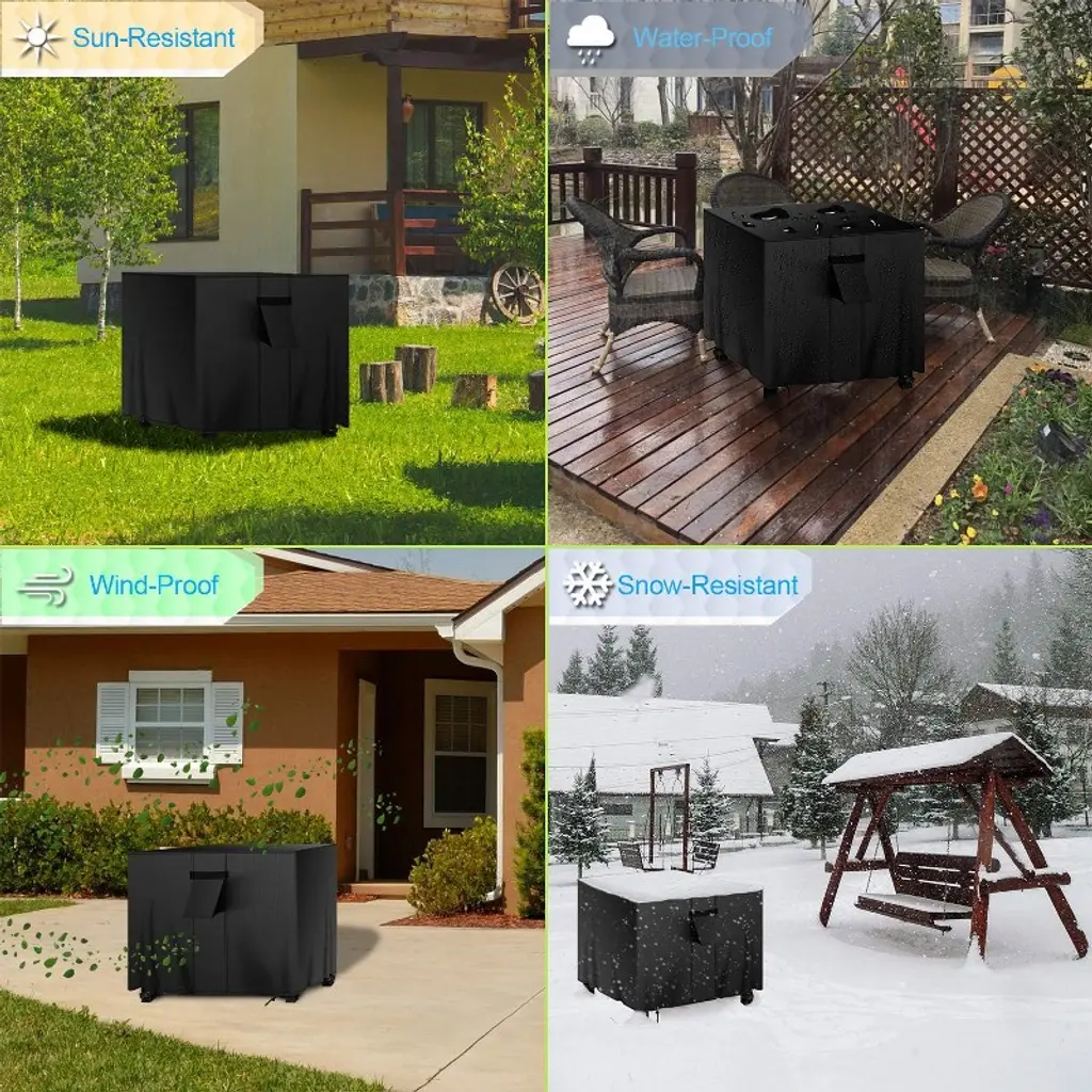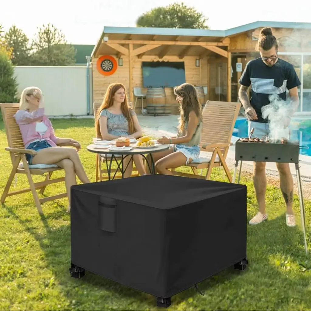 The Akefit black square fire pit cover is made with durable 420D Oxford fabric and a waterproof PU coating to protect your fire pit from rain, dust, and sun damage. It features a front ventilation window to reduce mildew, two top handles for easy handling, and diagonal buckles to secure the cover during strong winds. The bottom drawstring closure ensures a tight fit, and it includes a drawstring storage bag for convenient storage when not in use.