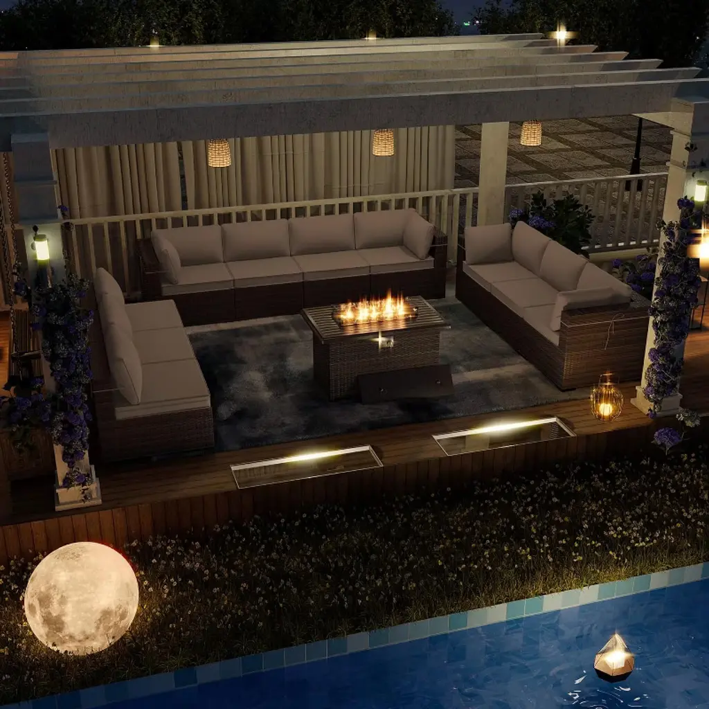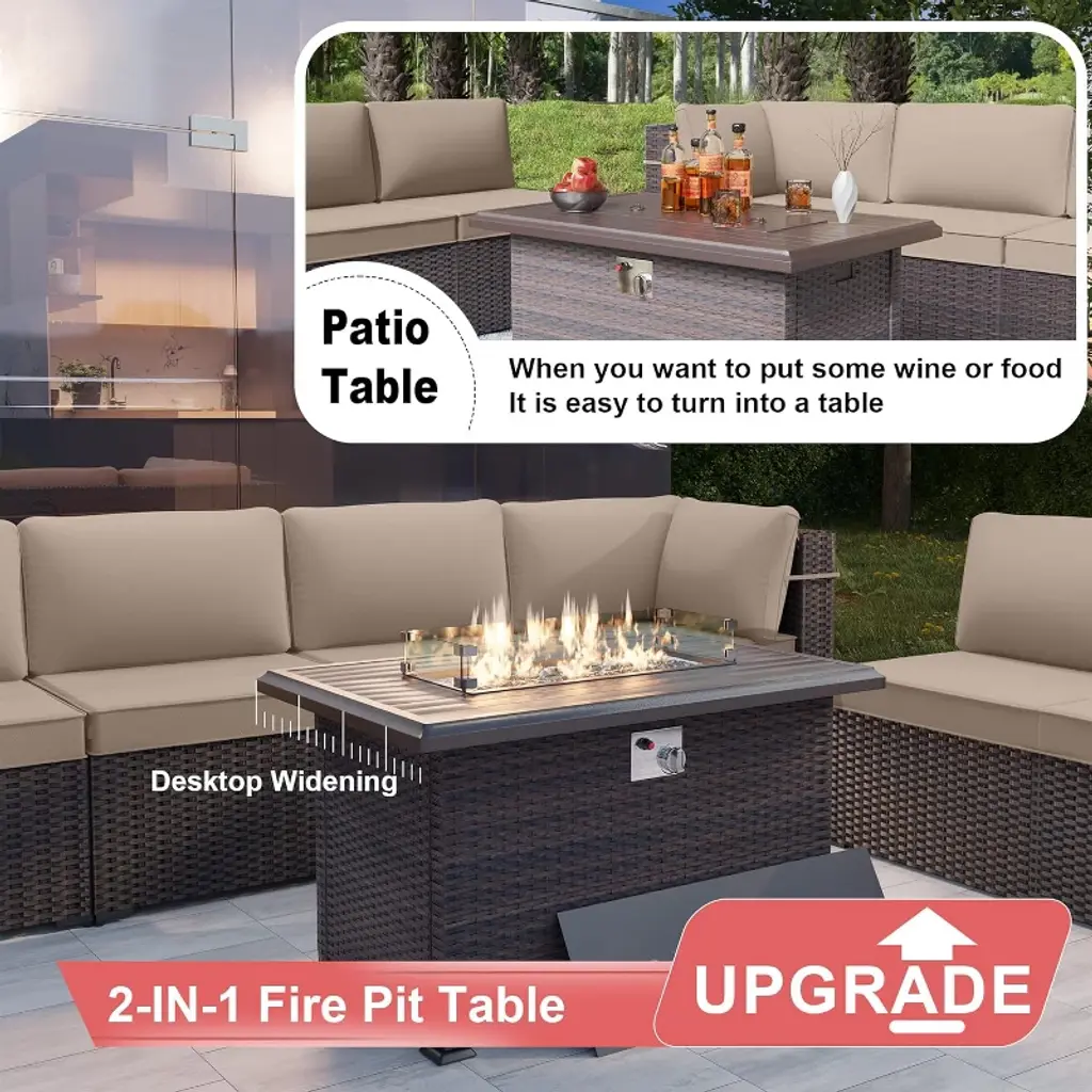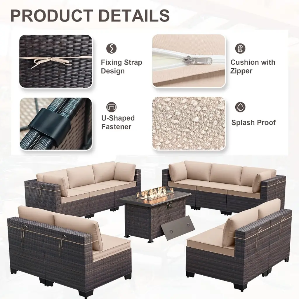 Alaulm 11 Pieces Patio Furniture Set, Rattan Wicker Outdoor Conversation Sets, Furniture Sofa Set W/43in Propane Fire Pit Table And 4"cushion(sand)