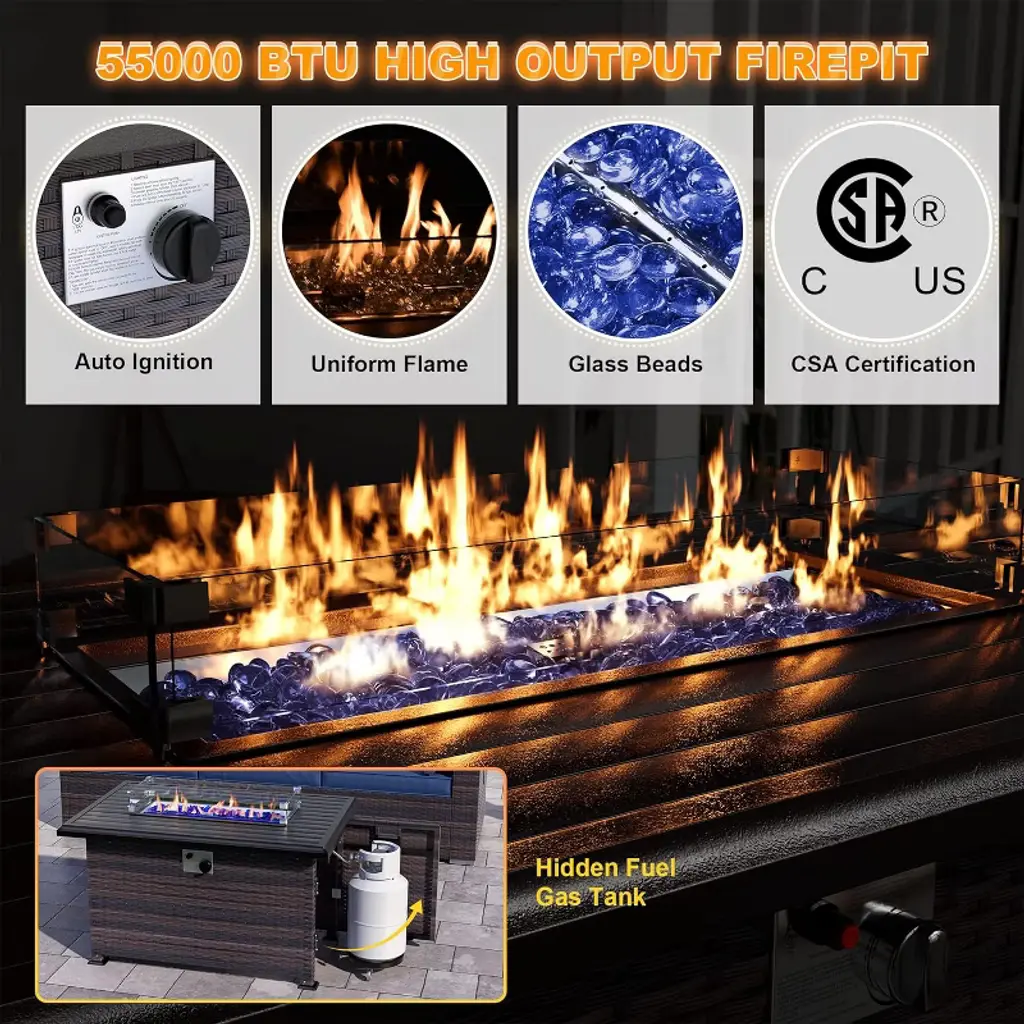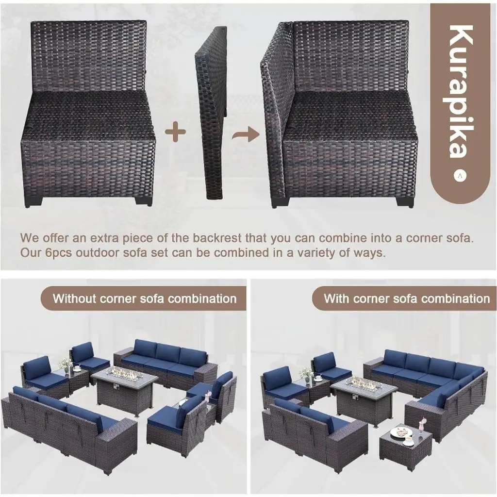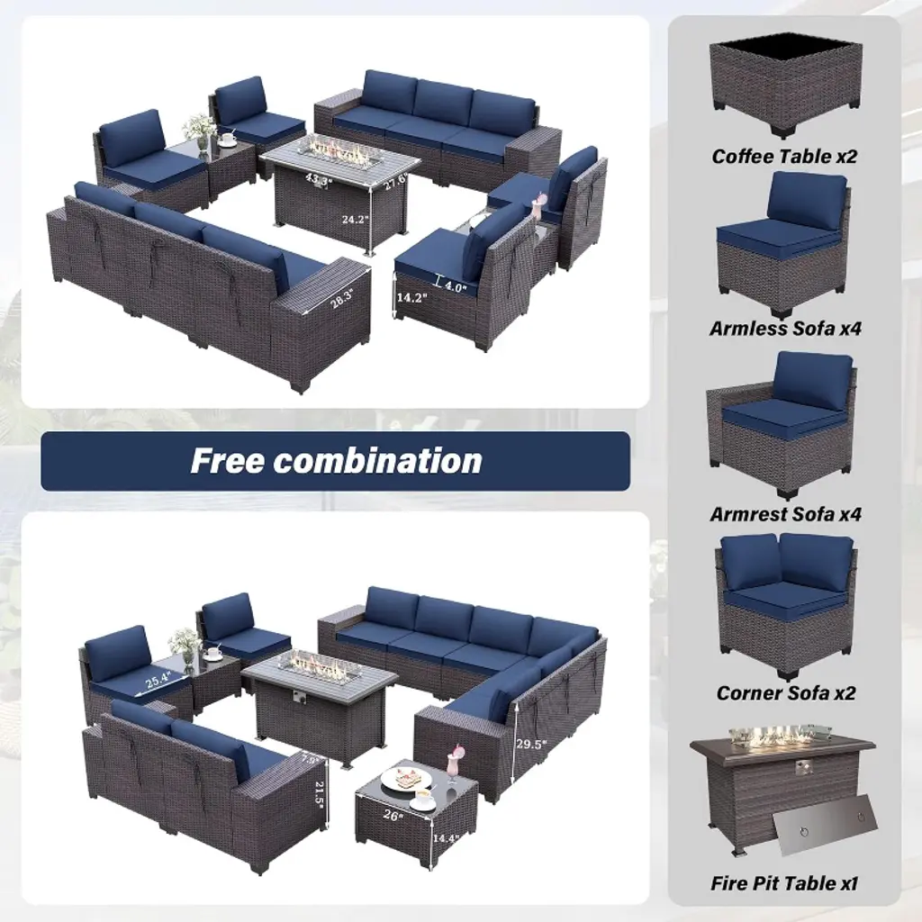 Alaulm 13 Pieces Patio Furniture Set, Rattan Wicker Outdoor Conversation Sets, Outdoor Furniture Sofa Set W/43in Propane Fire Pit Table(navy Blue)