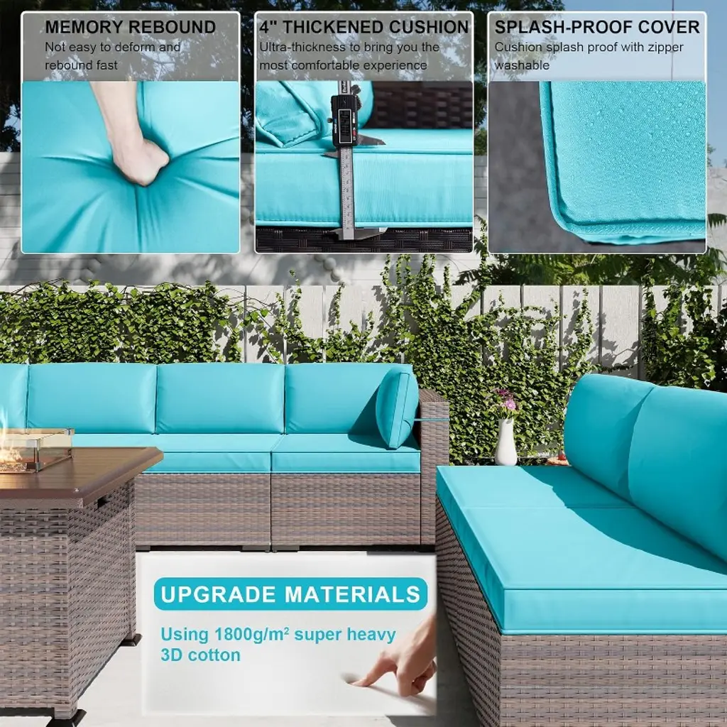 This high-quality ALAULM outdoor woven rattan sofa set brings joy to your outdoor living! Hand-woven PE rattan is waterproof and fade-resistant, while the powder-coated steel frame ensures stability and balance. High-density fabric makes the cushions and pillows fade-resistant and waterproof, and the thickened 4-inch memory foam core effectively relieves body pressure! Modular patio sofa—your one-of-a-kind choice! Please Note: The product will be shipped in 7 separate packages, and delivery times may vary.