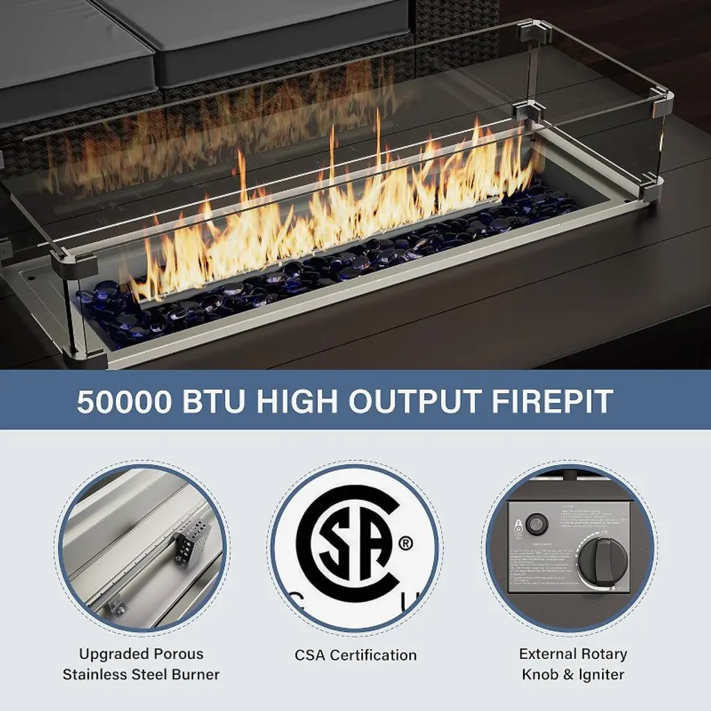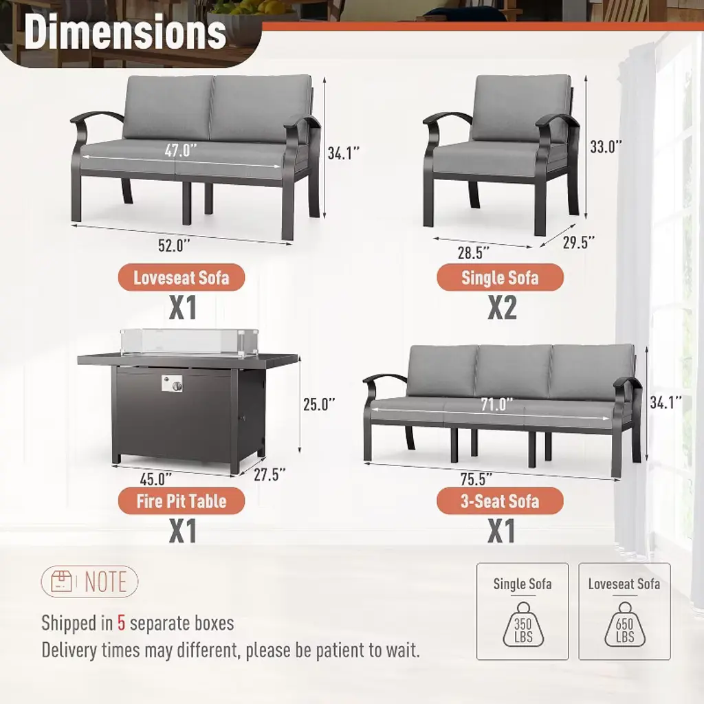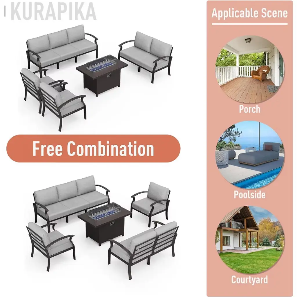 Alaulm Aluminum Patio Furniture Set 7-seat Modern Metal Outdoor Conversation Sets W/45in Propane Fire Pit Table, W/5.1 Inch Cushion, Grey