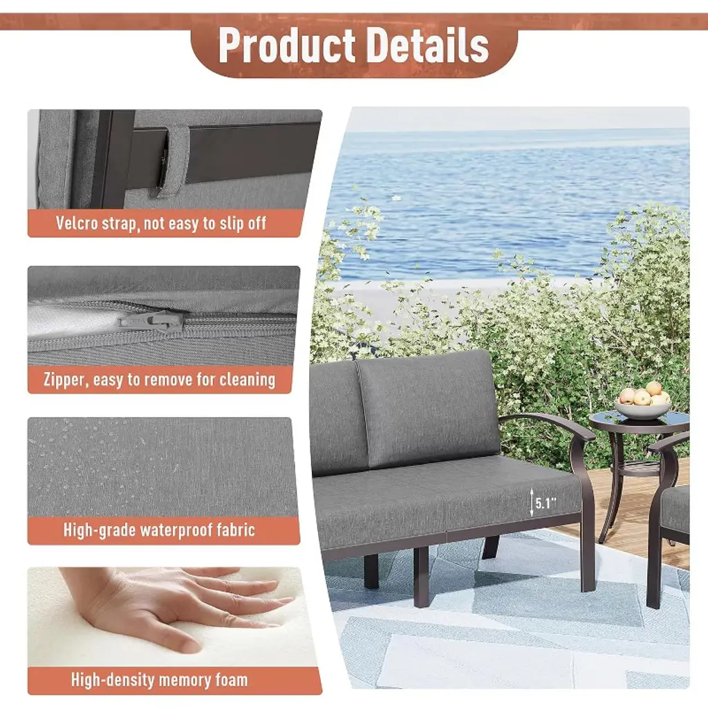 This outdoor furniture patio set creates uniquely enjoyable leisure moments for you! Featuring an upgraded powder-coated lightweight all-aluminum alloy frame combined with an ergonomic curved design that provides ample lumbar support, paired with 5.1-inch high-resilience memory foam cushions, the ALAULM outdoor furniture patio set delivers a comfortable and relaxing outdoor experience! Please Note: The product will be shipped in 5 separate packages, and delivery times may vary.