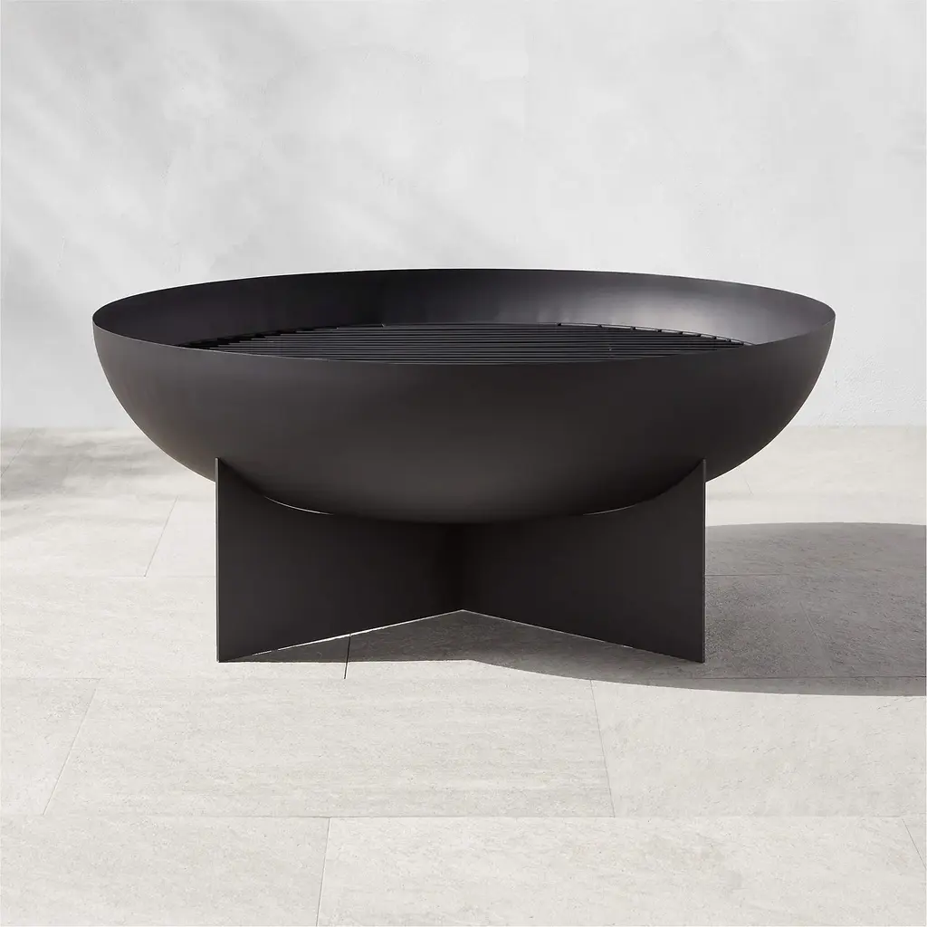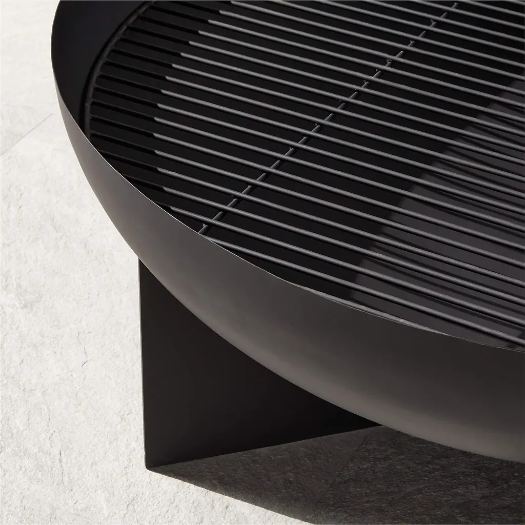 Designed by Barcelona-based Mermelada Estudio, sleek black outdoor fire pit features a large round silhouette designed to contain burning logs to warm cool summer nights. CB2 exclusive.