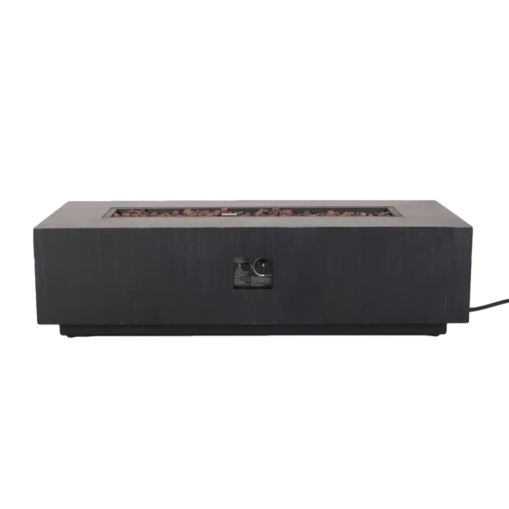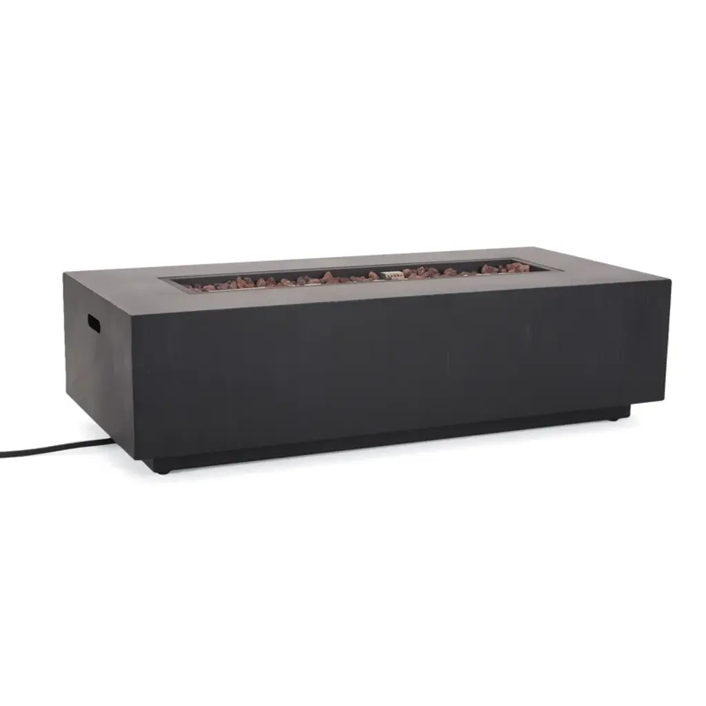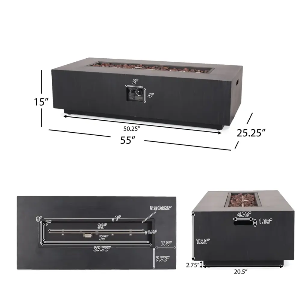 Make your backyard the place where everyone wants to be with this outdoor fire pit. The weather- and heat-resistant pit and matching tank holder feature rectangular silhouettes crafted from powder-coated iron with a brushed black finish. A push button operates the on/off and the adjustable flame and the included cover keeps the lava rocks dry when not in use. This fire pit is for outside use only and should not be placed on a wooden deck. Please note: The propane tank is sold separately.
