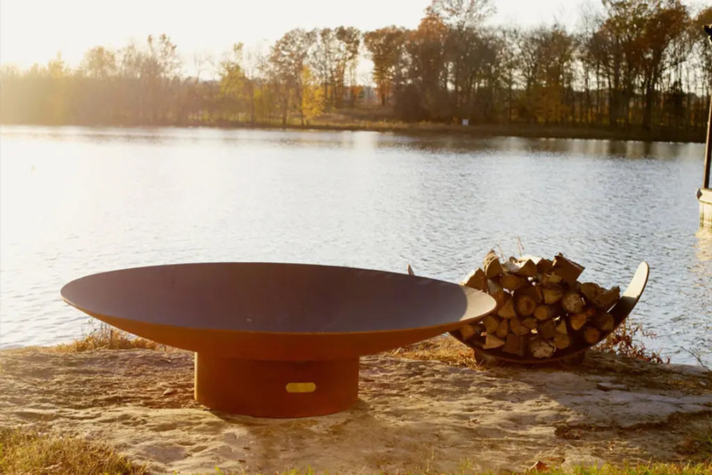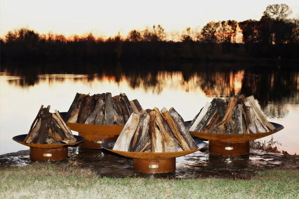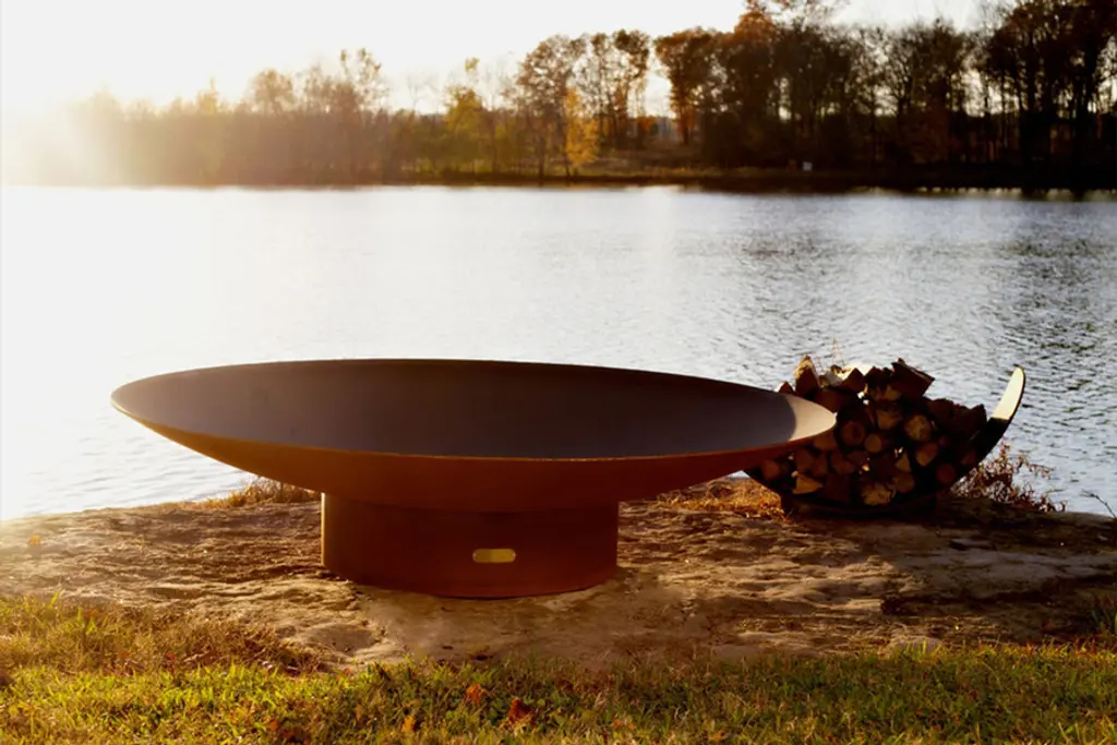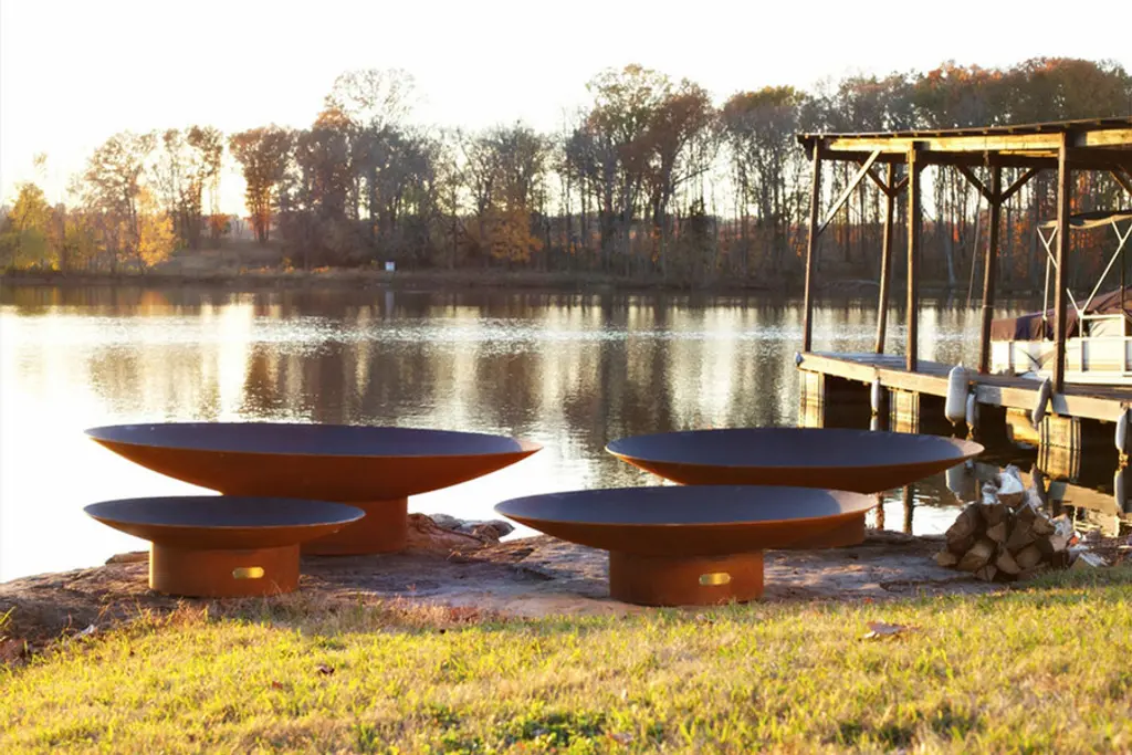 Channel your elemental inner harmony with the Asia Series Fire Pit by Fire Pit Art. Low to the ground and shallow, it is meant to be enjoyed from all angles. Use it solo on a chilly autumn night, or host friends around it at a summer shindig. With the wide, shallow disc you can choose to sit on the ground or in a cozy chair while enjoying the toasty goodness this fire pit has to offer. The entire unit is self-sustaining: it can be left outside in rain and snow as a high temperature heat-resistant wide inner disc is also equipped with a convenient rain drain to avoid rusting and pooling of water. The outer disc has an iron oxide patina which will darken over time and then remain modernly stylish for eternity. Each piece has been uniquely designed, indicated by an artisanal numbered brass plaque. Available in multiple sizes based on your personal and spatial needs.36 inch: 36"diameter x 12"h, 95lbs 48 inch: 48"diameter x 14"h, 210lbs 60 inch: 60"diameter x 16"h, 265lbs 72 inch: 72"diameter x 18"h, 395lbs