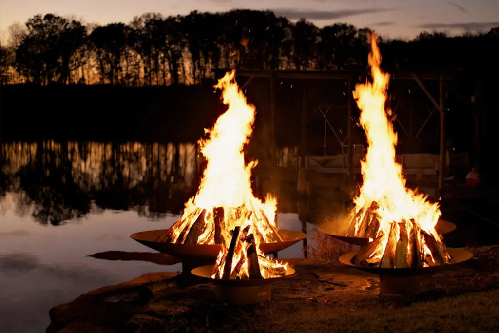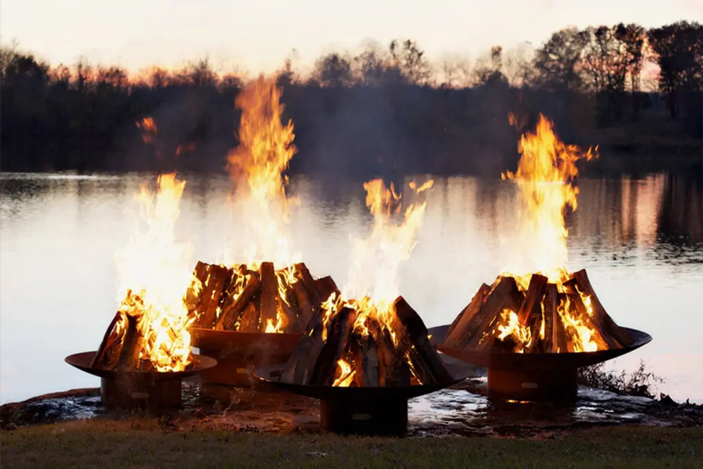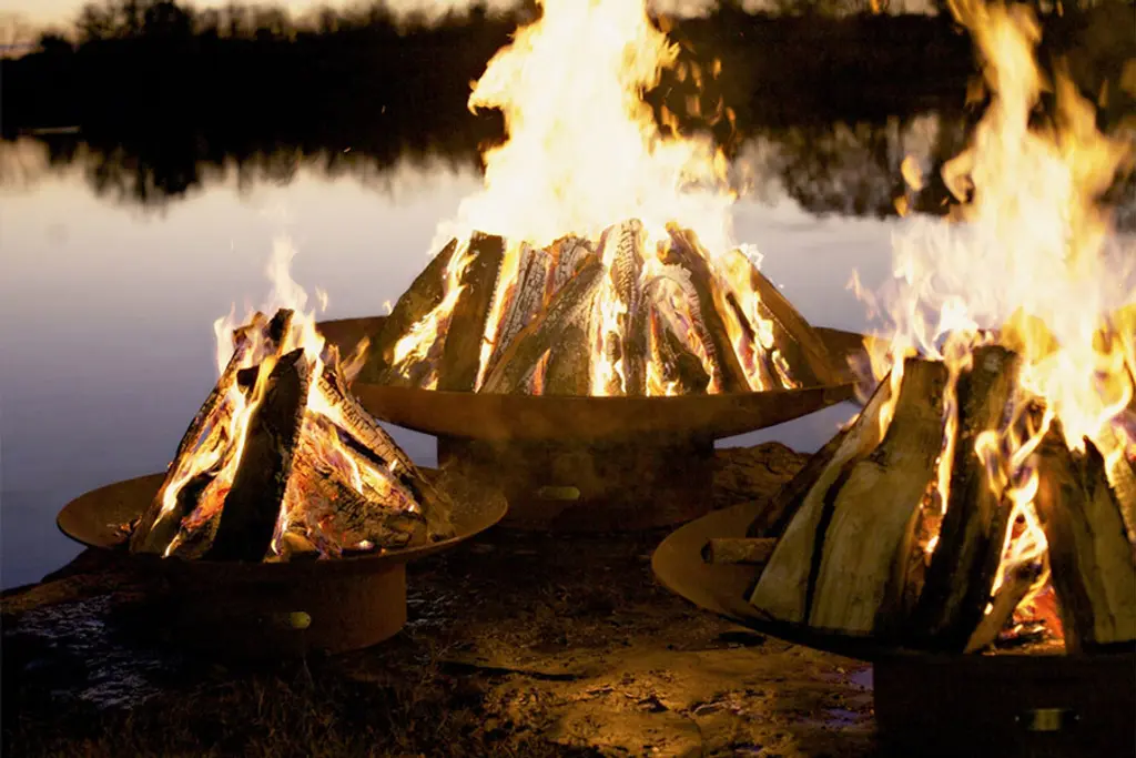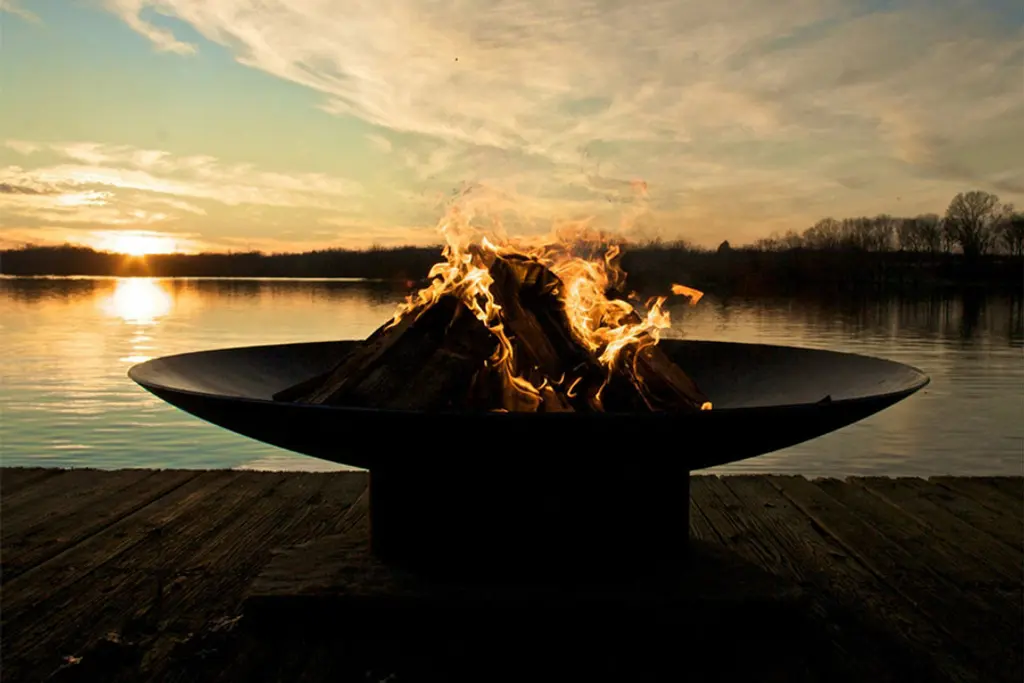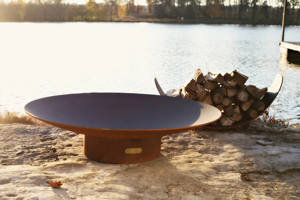 Channel your elemental inner harmony with the Asia Series Fire Pit by Fire Pit Art. Low to the ground and shallow, it is meant to be enjoyed from all angles. Use it solo on a chilly autumn night, or host friends around it at a summer shindig. With the wide, shallow disc you can choose to sit on the ground or in a cozy chair while enjoying the toasty goodness this fire pit has to offer. The entire unit is self-sustaining: it can be left outside in rain and snow as a high temperature heat-resistant wide inner disc is also equipped with a convenient rain drain to avoid rusting and pooling of water. The outer disc has an iron oxide patina which will darken over time and then remain modernly stylish for eternity. Each piece has been uniquely designed, indicated by an artisanal numbered brass plaque. Available in multiple sizes based on your personal and spatial needs.36 inch: 36"diameter x 12"h, 95lbs 48 inch: 48"diameter x 14"h, 210lbs 60 inch: 60"diameter x 16"h, 265lbs 72 inch: 72"diameter x 18"h, 395lbs