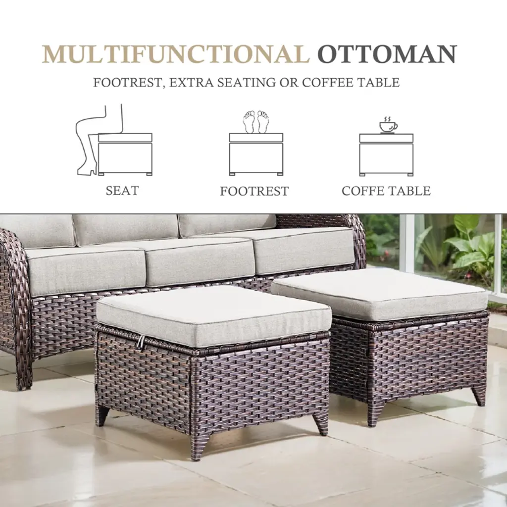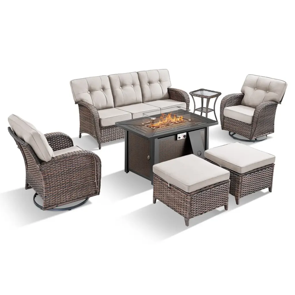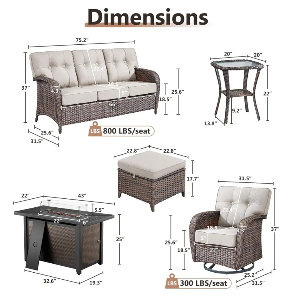 Turn your backyard into the ultimate outdoor retreat with this all-in-one patio furniture set. The complete luxury patio furniture set includes a spacious 75.2" sofa, two 360° swivel chairs, a 43" rectangular fire pit table, a 2-tier accent end table, and two versatile ottomans that double as footrests or extra seating - delivering both style and flexibility to your outdoor space. At the heart of the set, the propane fire pit table features a wind-guard glass shield and provides up to 50,000 BTUs of heat, keeping you warm and cozy on cooler evenings. Built with durable powder-coated steel frames and weather-resistant resin wicker in a classic brown finish, this outdoor conversation set is designed for lasting use. Plush 5-inch thick seat cushions and oversized 31.5" back cushions ensure unmatched comfort, whether you're lounging, entertaining guests, or simply enjoying peaceful moments outdoors. Feature: Weather-resistant PE rattan ensures durability Reinforced steel frame enhances overall stability without deformation The accent end table with tempered glass top can hold food or drinks Ergonomic design and soft cushions bring better sitting experience Perfect for backyard, porch, poolside, lawn, garden, balcony and so on Cushions are easy to clean and maintain with a smooth zipper Easy assembly with detailed instruction and assembly video Material: PE Rattan, Powder Coated Steel, Sponge, Tempered Glass, Polyester Thickness of Seat & Back Cushion: 5-INCH Weight Capacity of Sofa: 800lbs Weight Capacity of Chair: 300lbs Weight Capacity of Coffee Table: 66lbs Package Include: 1 x Sofa 2 x Swivel Glider Chairs 1 x Firepit Table 2 x Patio Ottomans 1 x Accent Side Table