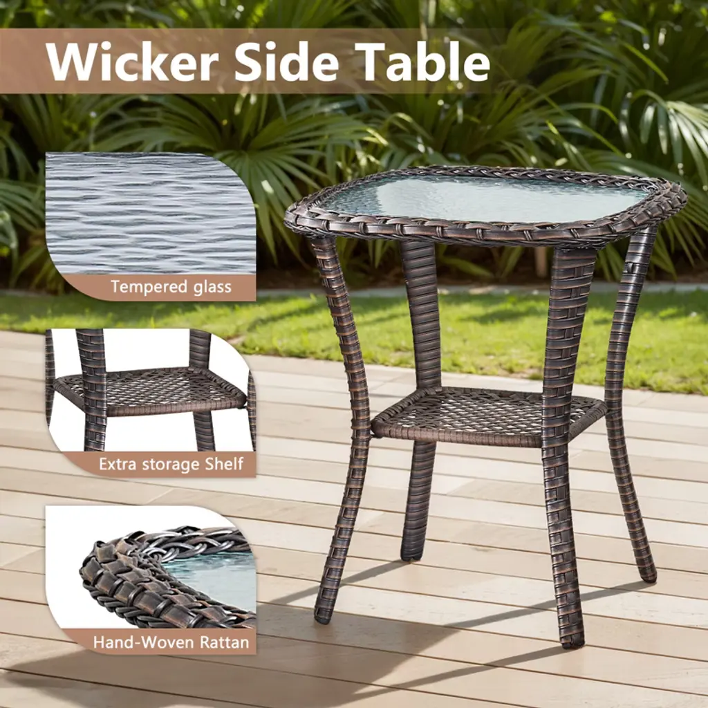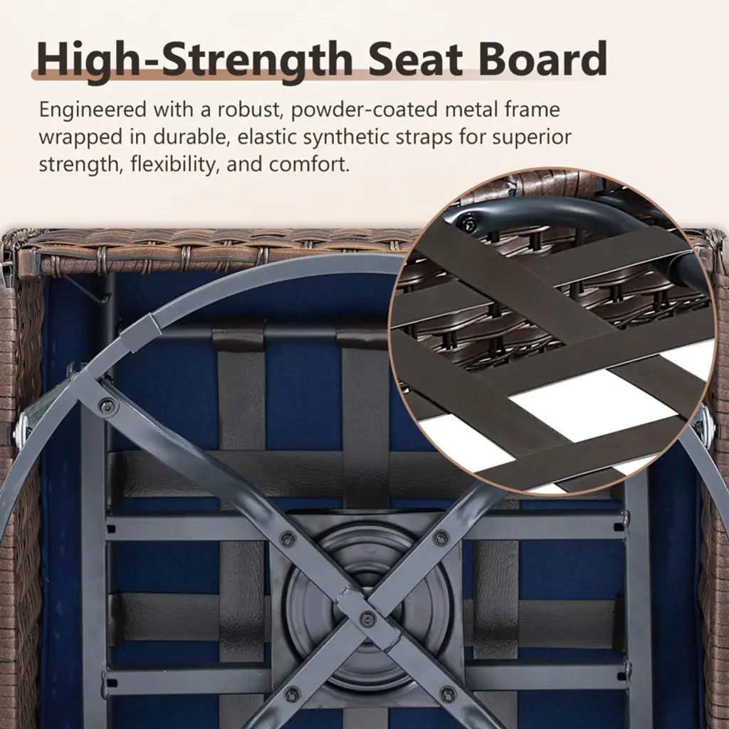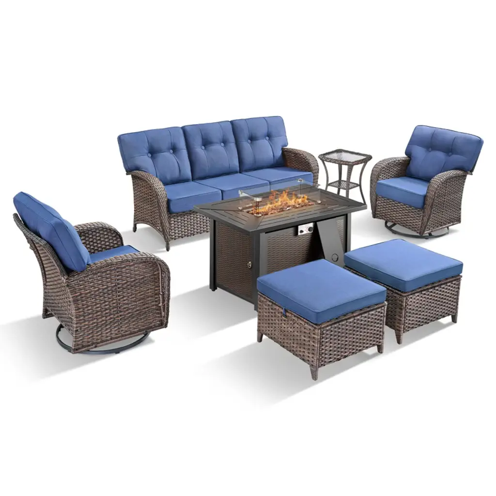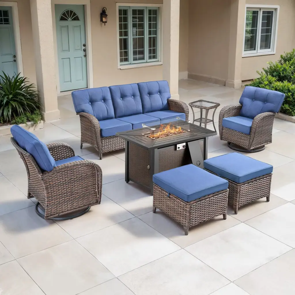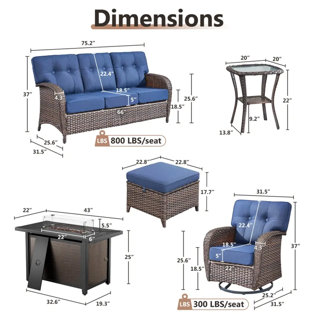 Turn your backyard into the ultimate outdoor retreat with this all-in-one patio furniture set. The complete luxury patio furniture set includes a spacious 75.2" sofa, two 360° swivel chairs, a 43" rectangular fire pit table, a 2-tier accent end table, and two versatile ottomans that double as footrests or extra seating - delivering both style and flexibility to your outdoor space. At the heart of the set, the propane fire pit table features a wind-guard glass shield and provides up to 50,000 BTUs of heat, keeping you warm and cozy on cooler evenings. Built with durable powder-coated steel frames and weather-resistant resin wicker in a classic brown finish, this outdoor conversation set is designed for lasting use. Plush 5-inch thick seat cushions and oversized 31.5" back cushions ensure unmatched comfort, whether you're lounging, entertaining guests, or simply enjoying peaceful moments outdoors. Feature: Weather-resistant PE rattan ensures durability Reinforced steel frame enhances overall stability without deformation The accent end table with tempered glass top can hold food or drinks Ergonomic design and soft cushions bring better sitting experience Perfect for backyard, porch, poolside, lawn, garden, balcony and so on Cushions are easy to clean and maintain with a smooth zipper Easy assembly with detailed instruction and assembly video Material: PE Rattan, Powder Coated Steel, Sponge, Tempered Glass, Polyester Thickness of Seat & Back Cushion: 5-INCH Weight Capacity of Sofa: 800lbs Weight Capacity of Chair: 300lbs Weight Capacity of Coffee Table: 66lbs Package Include: 1 x Sofa 2 x Swivel Glider Chairs 1 x Firepit Table 2 x Patio Ottomans 1 x Accent Side Table