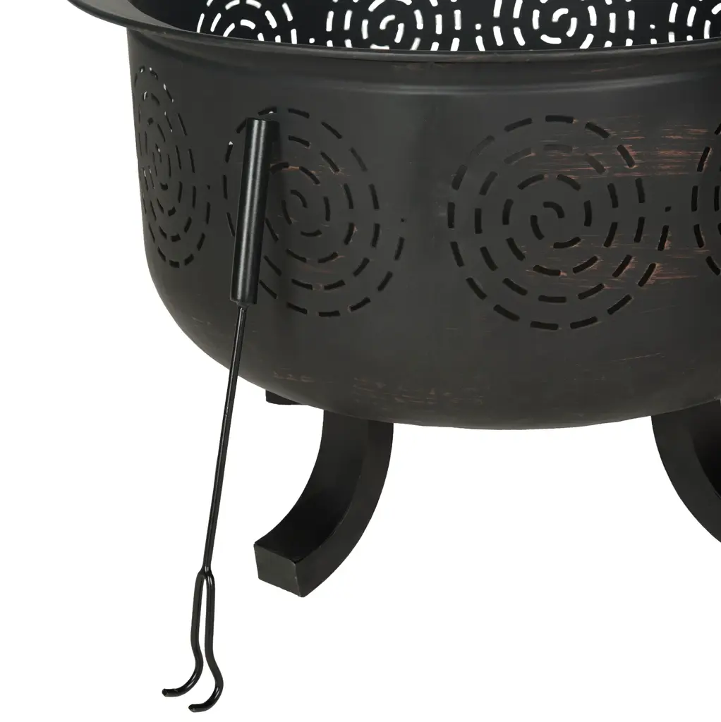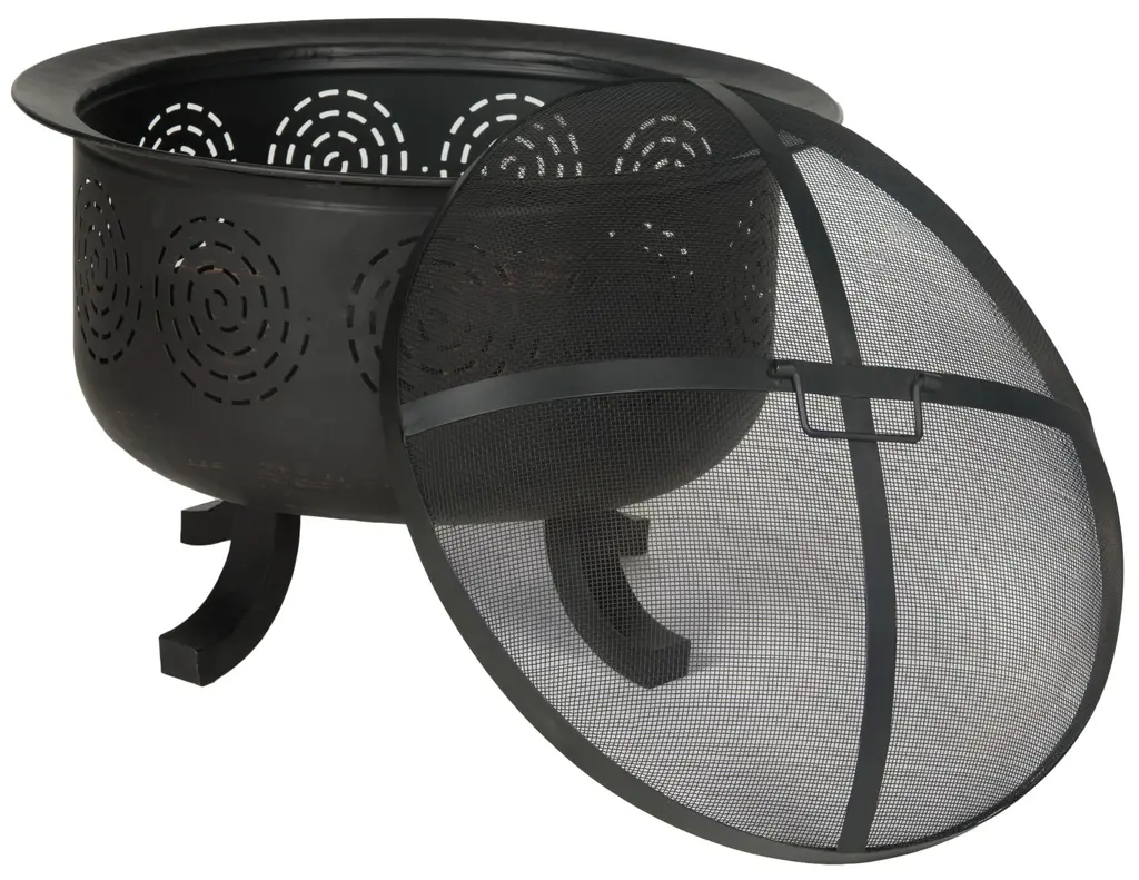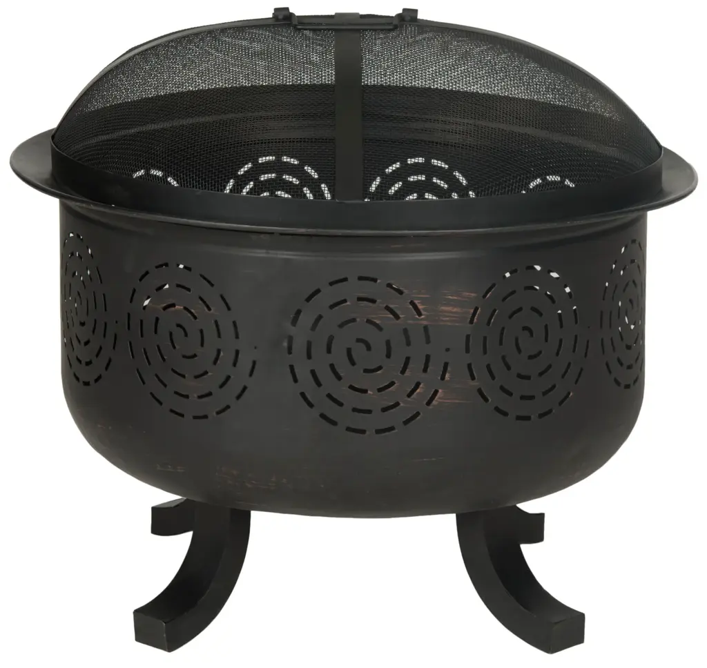 A warm and inviting kettle drum design distinguishes the wood-burning fire pit of iron in contrasting copper and black tones. Replete with all the bells and whistles it comes with screen dome and fire poker so your campfire blazes into the night. Inspecting This outdoor fire pit should be inspected on a regular basis to ensure product safety and longer product life. Do NOT attempt to inspect this outdoor fire pit until the fire is COMPLETELY out. 1. Check handles to make sure they are secure. 2. Check components for any signs of damage or rust. 3. If damage to any component is detected, do NOT operate until repairs are executed. Cleaning This outdoor fire pit should be cleaned on a regular basis to promote safer experiences and longer product life. Note: After repeated use, a slight discoloration of the finish may occur. Do NOT attempt to clean this outdoor fire pit until the fire is COMPLETELY out. Do NOT use oven cleaner or abrasive cleaners as they will damage this product. Do NOT clean any part of this outdoor fire pit in a self-cleaning oven as it may damage the finish. 1. Wipe exterior surfaces with a mild dishwashing detergent or baking soda. 2. For stubborn surfaces use a citrus based degreaser and a nylon scrubbing brush. 3. Rinse clean with water. 4. Remove built-up creosote from components with a chimney cleaning product. Storage Do NOT move or store this outdoor fire pit until the fire is COMPLETELY out. 1. Once the fire is out, coals are cold and outdoor fire pit is cool to the touch, remove ashes and properly dispose. 2. Cover outdoor fireplace with a durable vinyl cover designed to fit this unit. 3. Store assembled in a location away from children and pets. Note: If you do not use a cover, store this outdoor fire pit in a dry location to maximize product life. Some assembly required.