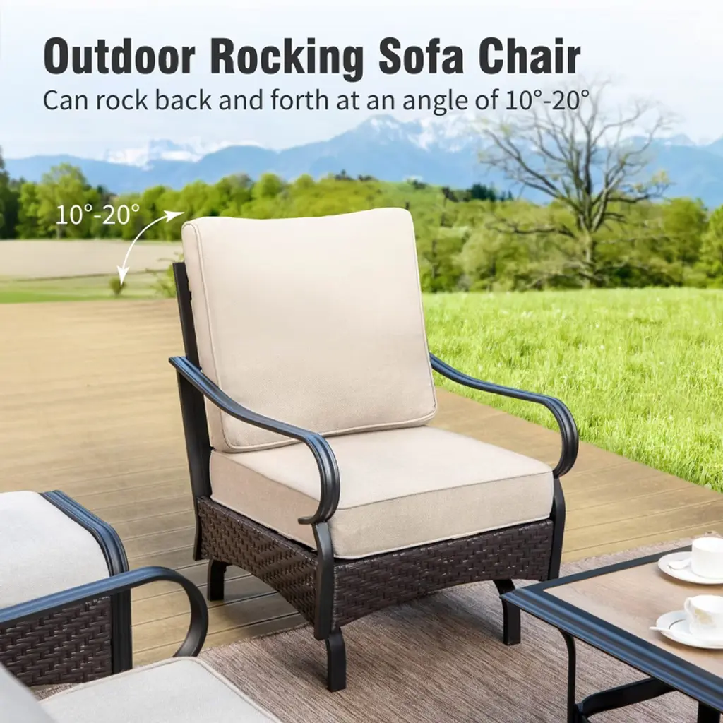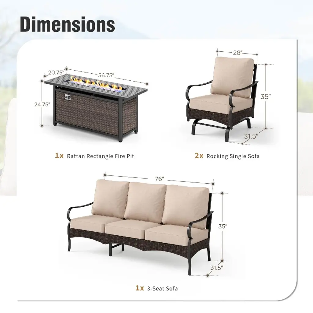 Create a stylish and inviting outdoor retreat with this modern sofa set. The sleek black metal frame features a distinctive open-back design with interlocking circular patterns, perfectly complemented by handwoven rattan for a sophisticated look. The rocking chairs offers a soothing motion that enhances your outdoor lounging experience. The adjustable flame gas fire table creates a warm and inviting atmosphere, perfect for cozy evenings. Crafted with high-quality, weather-resistant materials, this set is designed to withstand the elements, offering lasting beauty and durability season after season.Specification:Rocking chair size: 28”W x 31.5'' D x 35'' H3-seat sofa size: 76” W x 31.5'' D x 35'' HGas fire table: 20.8" D x 56.8" W x 24.8 " HWeight Capacity of Armchair: 350 lbsWeight Capacity of 3-seat Sofa: 900lbs
