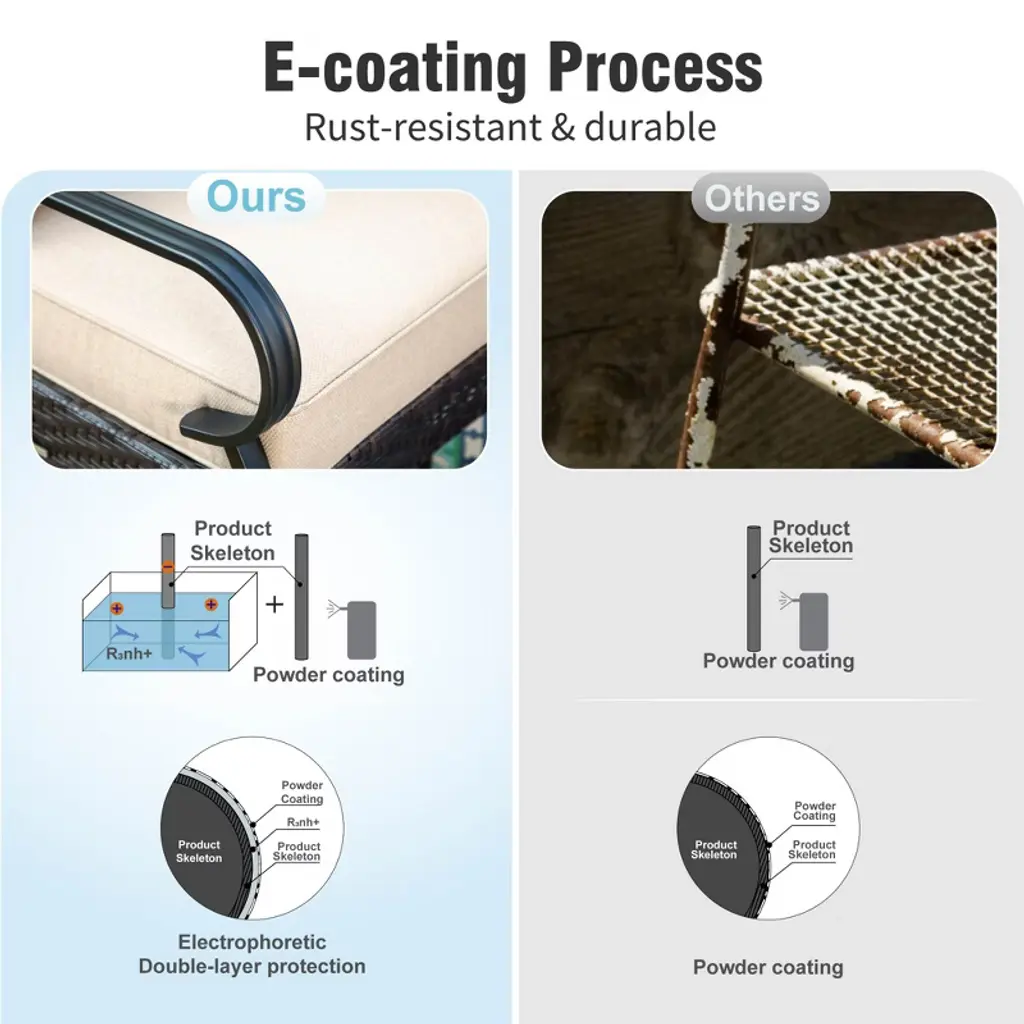 Create a stylish and inviting outdoor retreat with this modern sofa set. The sleek black metal frame features a distinctive open-back design with interlocking circular patterns, perfectly complemented by handwoven rattan for a sophisticated look. The rocking chairs offers a soothing motion that enhances your outdoor lounging experience. The adjustable flame gas fire table creates a warm and inviting atmosphere, perfect for cozy evenings. Crafted with high-quality, weather-resistant materials, this set is designed to withstand the elements, offering lasting beauty and durability season after season.Specification:Rocking chair size: 28”W x 31.5'' D x 35'' H3-seat sofa size: 76” W x 31.5'' D x 35'' HGas fire table: 20.8" D x 56.8" W x 24.8 " HWeight Capacity of Armchair: 350 lbsWeight Capacity of 3-seat Sofa: 900lbs