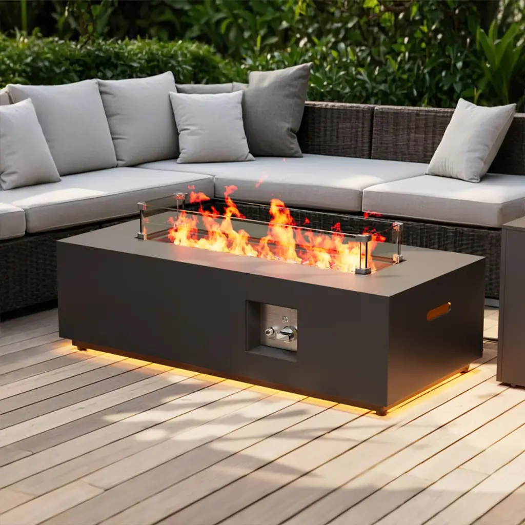 Gather your friends and family and enjoy the delightful warmth around a fire. With a rectangular structure of powder-coated iron, this 50,000 BTU propane gas fire pit not only offers an incredible upgrade in style but is also perfect for parties due to its easy seating arrangement. From intimate conversations around a cozy fire to stargazing on cool summer nights, our fire pit will have no trouble gathering everyone together for hours of quality time. Please note that tank holder is NOT included.MODERN DESIGN: With clean, precise lines, our fire pit is the ideal modern accessory for your interior space. Finished with a chic metal frame, this piece not only offers a chic, minimalistic look but also provides incredible structure.IRON FIRE PIT WITH FINISH: Constructed of powder-coated iron, the frame of this fire pit is made to be incredibly durable, ensuring that this piece will hold up under use. The frame is finished with a complementing color, making this an understated yet chic addition to your home.50,000 BTU: Featuring a rectangular shape and a BTU of 50,000, our fire pit allows easy seating arrangement for you and your guests, providing light and warmth all around during those chilly evenings. Please note that this fire pit is propane gas only.DIMENSIONS: Choose an accessory that is the perfect size for you and your furniture. This fire pit is 48.00" W x 15.00" D x 15.00" H. You will love how much your space can transform with the simple addition of this charming fire pit.NO ASSEMBLY REQUIRED: No assembly is required for this fire pit. Simply place the lava rocks in the pit without covering the burner, and then plug in your standard-size propane tank and enjoy your fire pit. Please note that tank holder is NOT included.