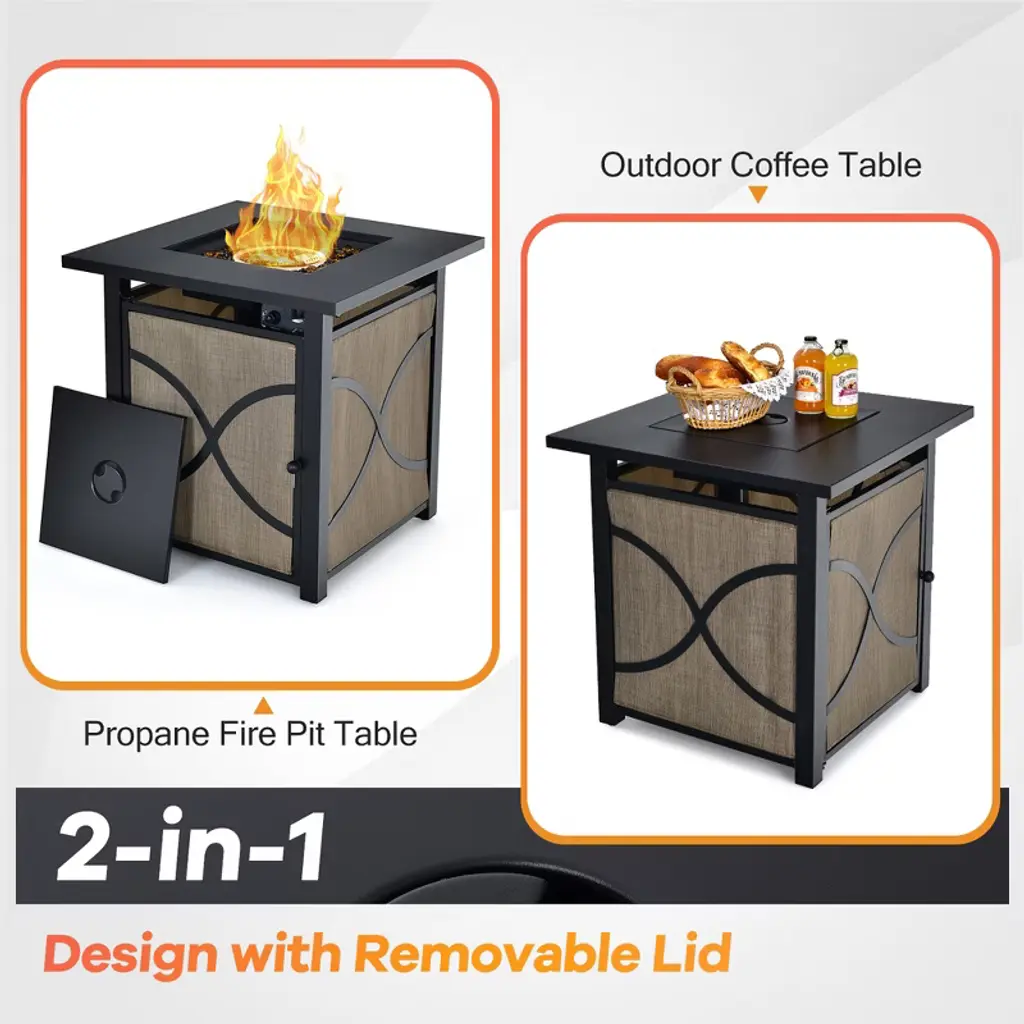Our 25'' gas fire pit table is an ideal addition to your patio and other outdoor living space. Due to the detachable lid, this propane fire pit table can be easily converted into an outdoor coffee table to place some daily items. You can choose to cover or remove the lid according to your preference. When you remove the lid, this outdoor fire table provides comfortable warmth and beautiful flames because of its 40,000 BTU, ignition device, rotatable control knob, stainless steel burner and fire glass. What's more, the CSA certification ensures safety while using.FeaturesEnsures security because of its CSA certification Suitable for 20 lbs LP gas tank (not included) Rotary control knob for flame adjustment Uses as an outdoor fire table or coffee table with removable lid Creates a clean and comfy environment with smokeless design Mesmerizing flames and beautiful fire glass for attraction Easy access door with handle for propane tank exchange Built-in fixing hoop for keeping the LP gas tank firmly Brings sufficient warmth thanks to its 40,000 BTU Can be used for a long time with anti-rust steel frame and fast-drying fabric Ideal for different outdoor places, such as patio, backyard and garden, etc Detailed instruction for easy assemblyColor: Black, Coffee Material: Steel, Stainless Steel, Fabric Overall Dimension: 25'' x 25'' x 25'' (L x W x H) Size of Fire Bowl: 13.5'' x 13.5'' (L x W) Net Weight: 36 lbs Output: 40000 BTU Package Includes: 1 x Outdoor Fire Table 1 x Fire Glass 1 x AAA Battery 1 x Instruction